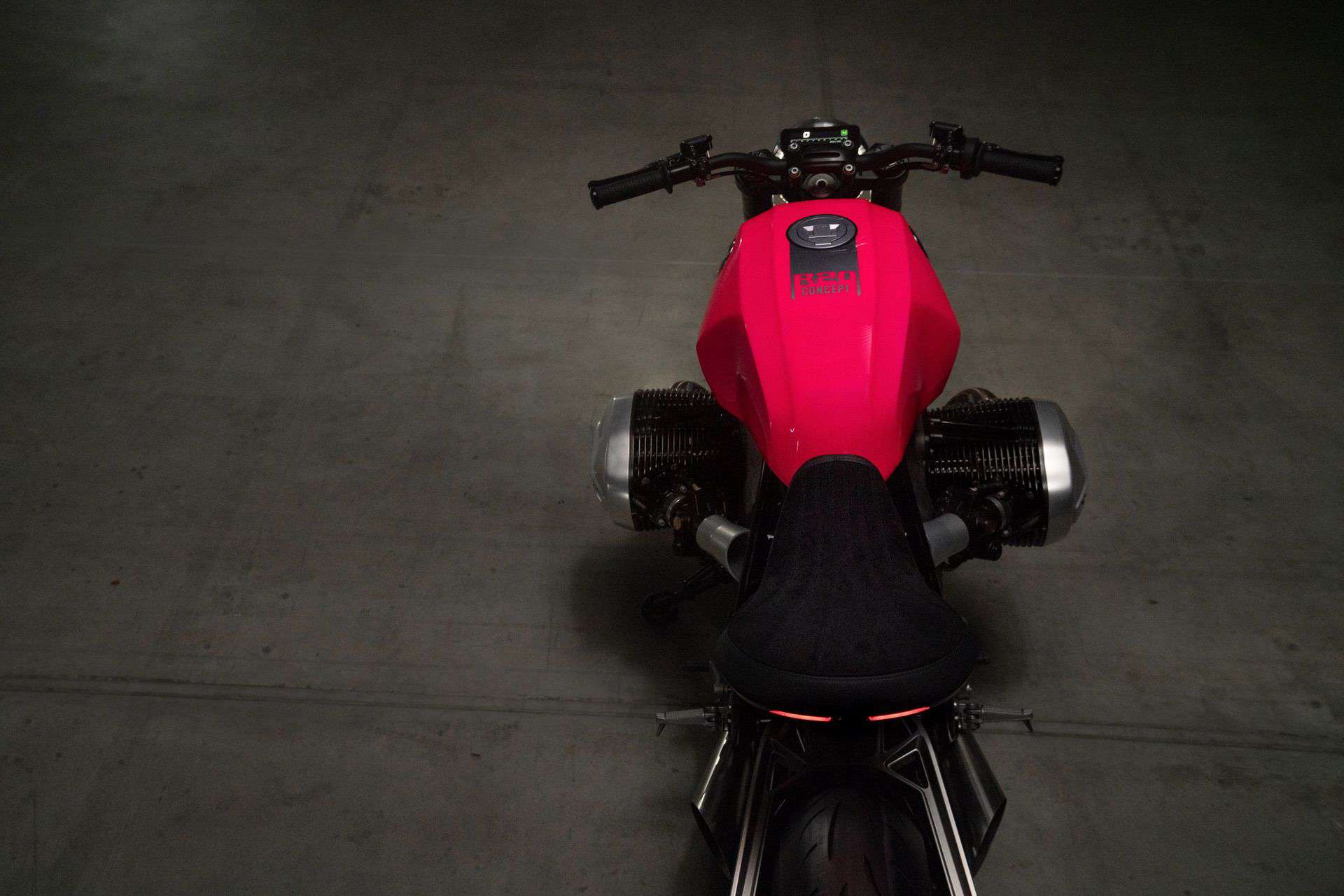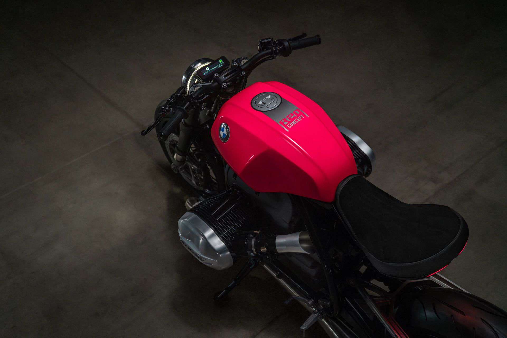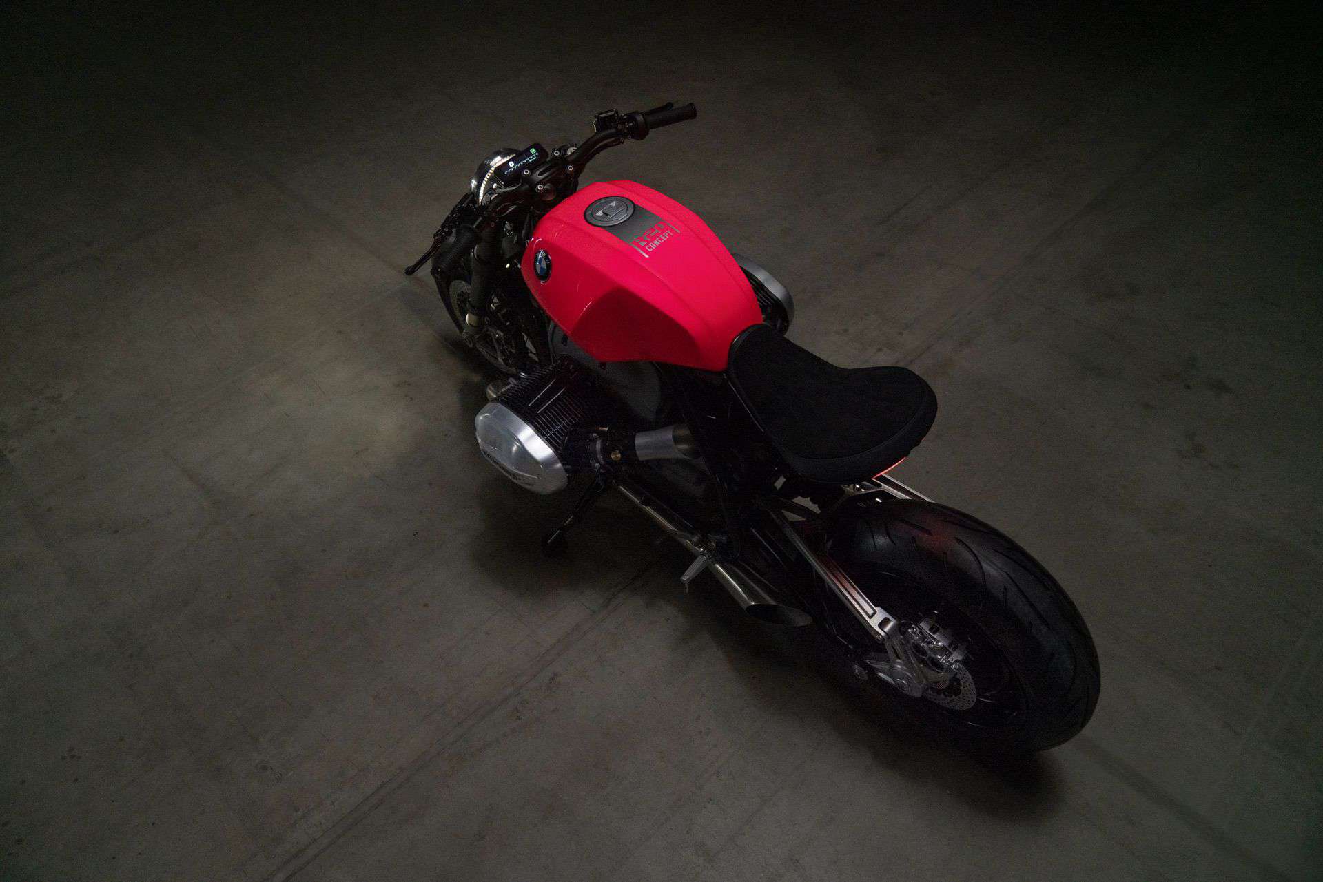 The aluminum tank has a new design in the bold “hotter than pink” color from the 1970s. The BMW R20 concept matches this with polished and anodized aluminum parts, including the cylinder head covers, belt cover, air intake funnels, Paralever strut, footrest system, and ISR brake calipers in gunmetal.