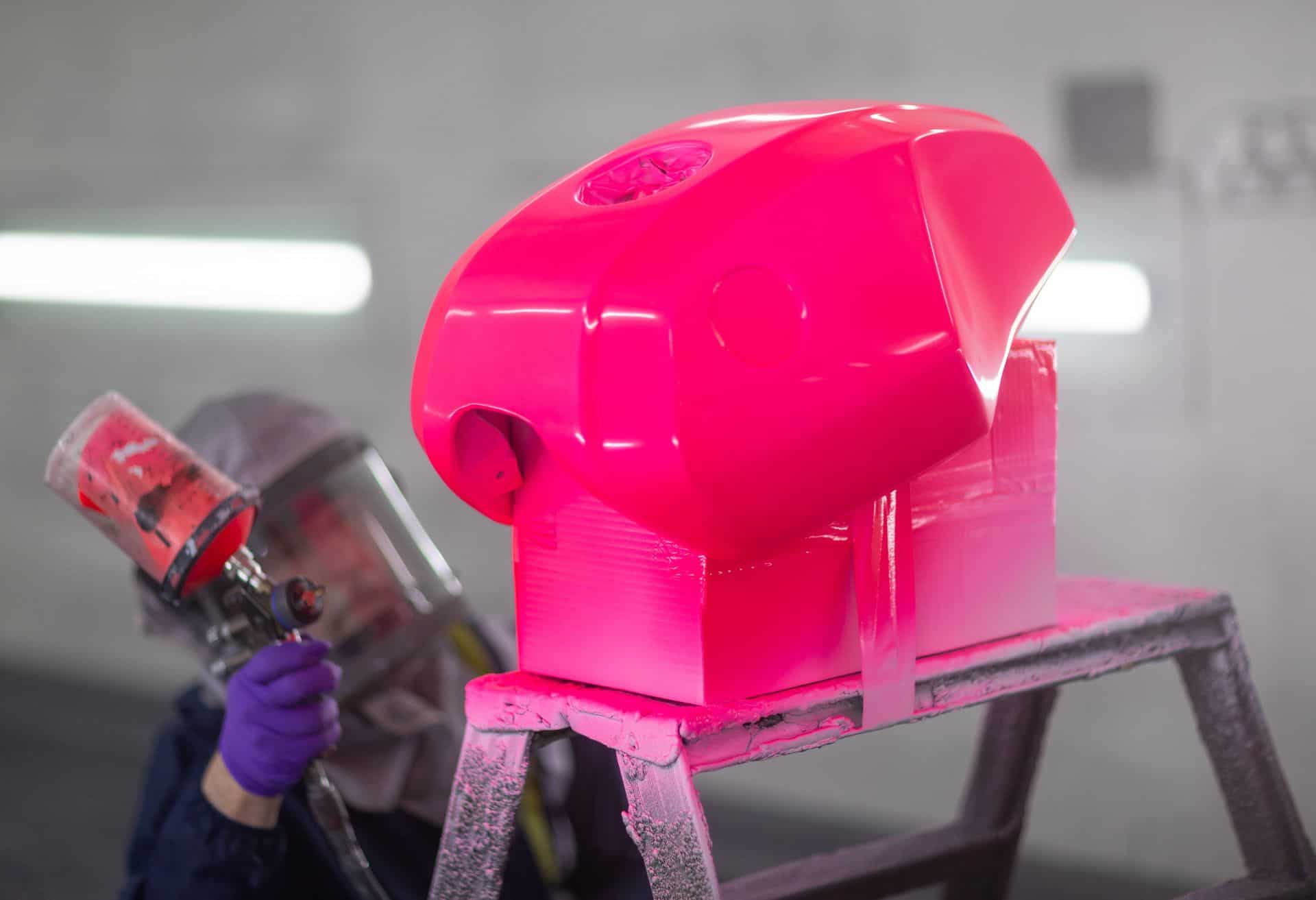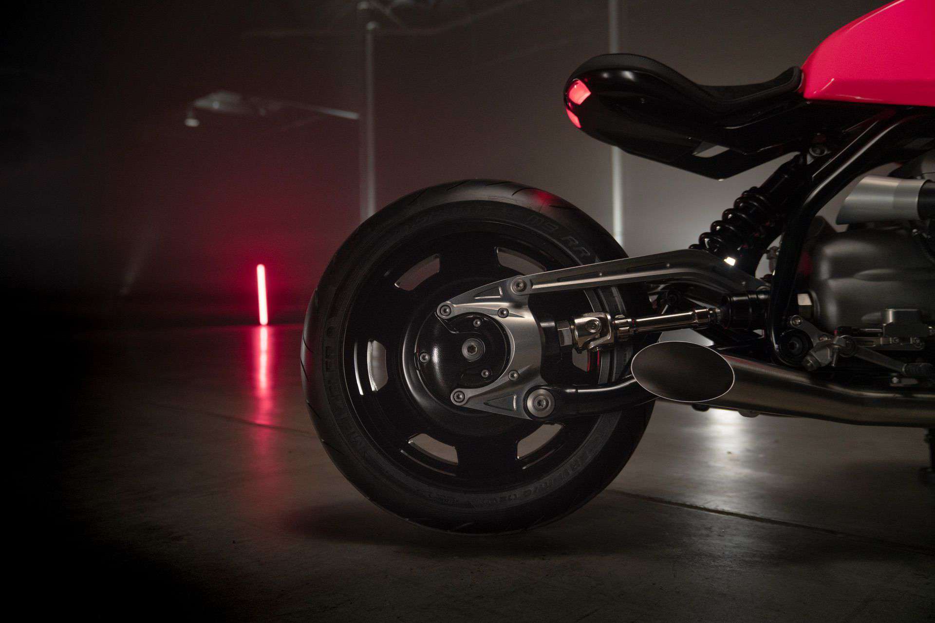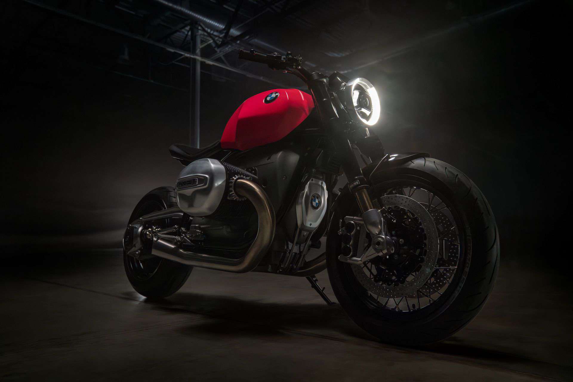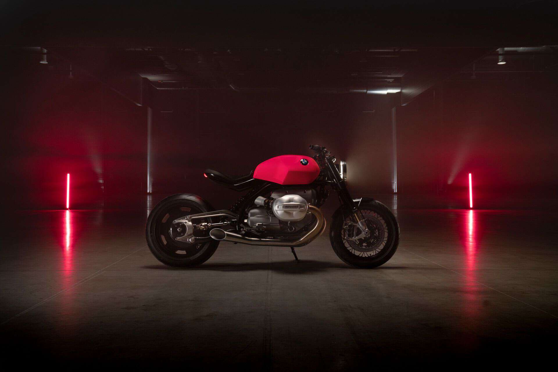 The aluminum tank has a new design in the bold “hotter than pink” color from the 1970s. The BMW R20 concept matches this with polished and anodized aluminum parts, including the cylinder head covers, belt cover, air intake funnels, Paralever strut, footrest system, and ISR brake calipers in gunmetal.