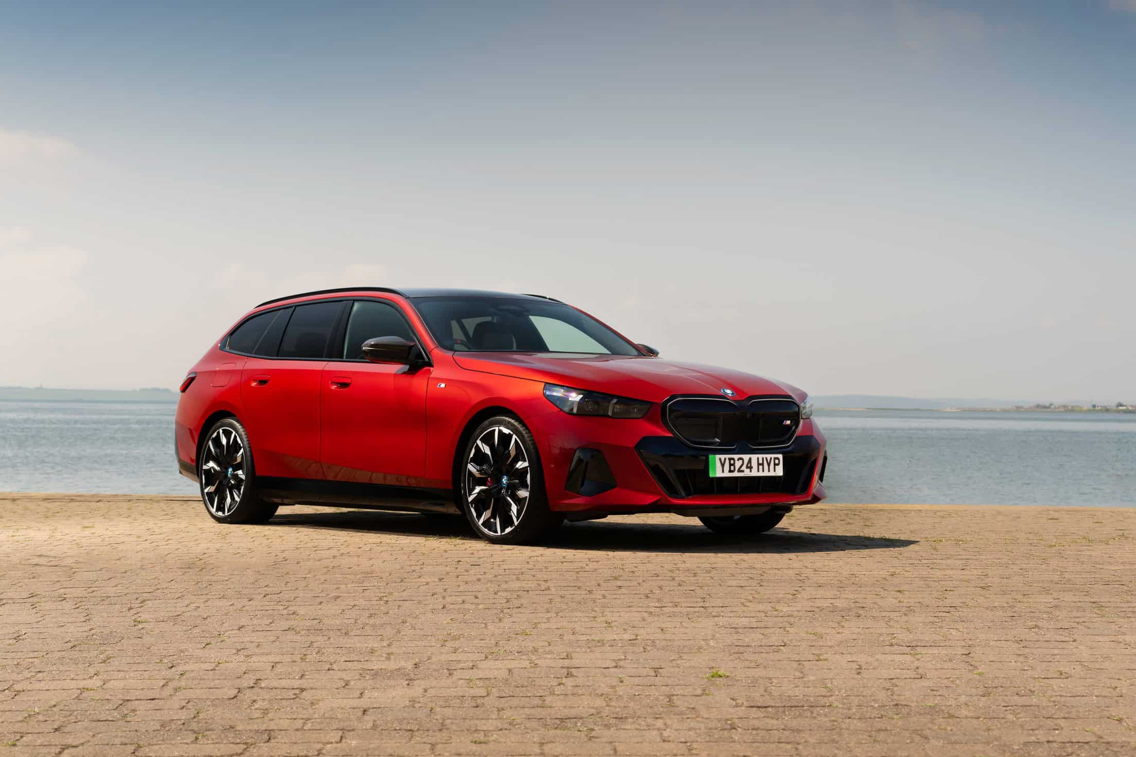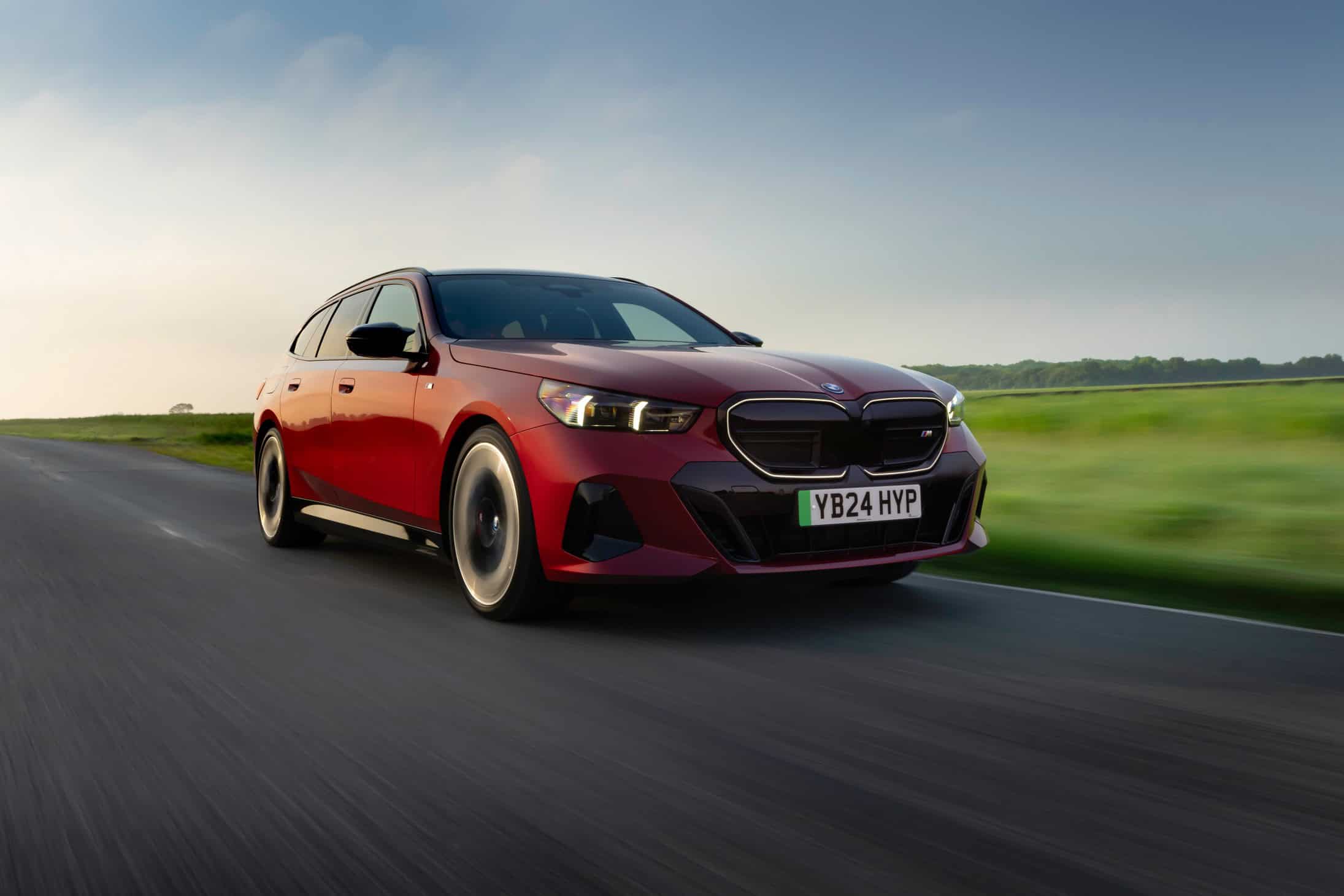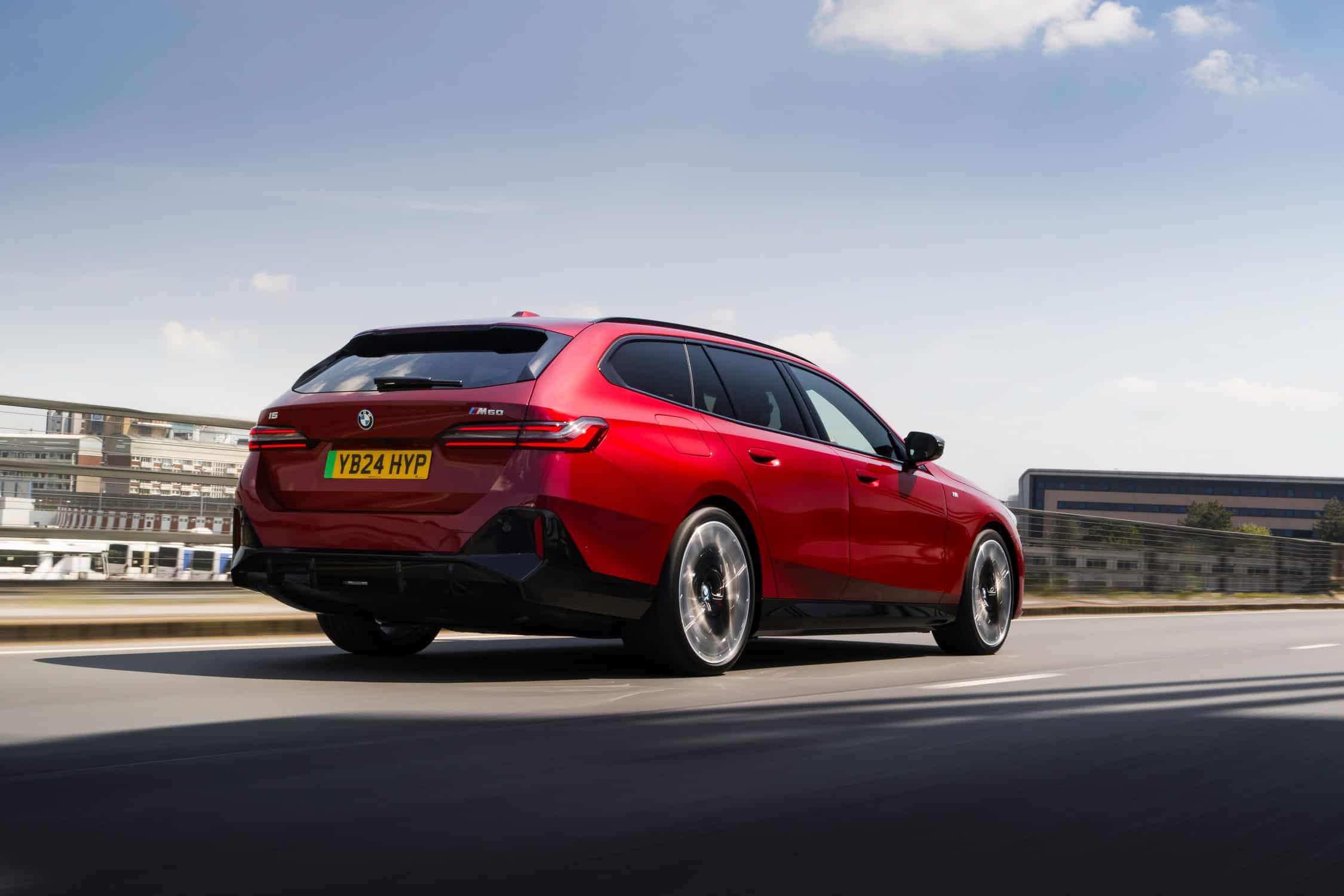 To coincide with the start of i5 Touring deliveries in the United Kingdom, BMW set up a photo shoot with the hottest G61 of them all. With no V8-powered M550i wagon this generation, the fully electric i5 M60 assumes the role of the M Lite estate. This right-hand-drive car highlighted by the automaker’s UK division wears the eye-catching Fire Red paint. In the United States, this color is marketed as Vegas Red.