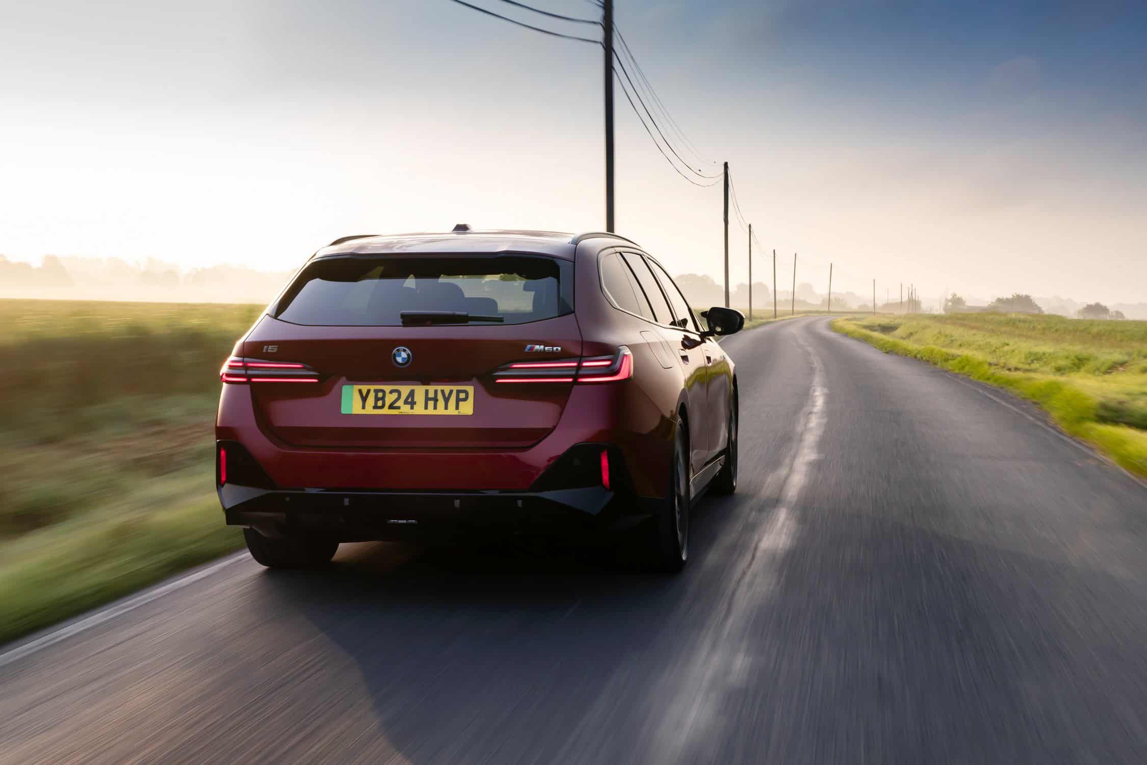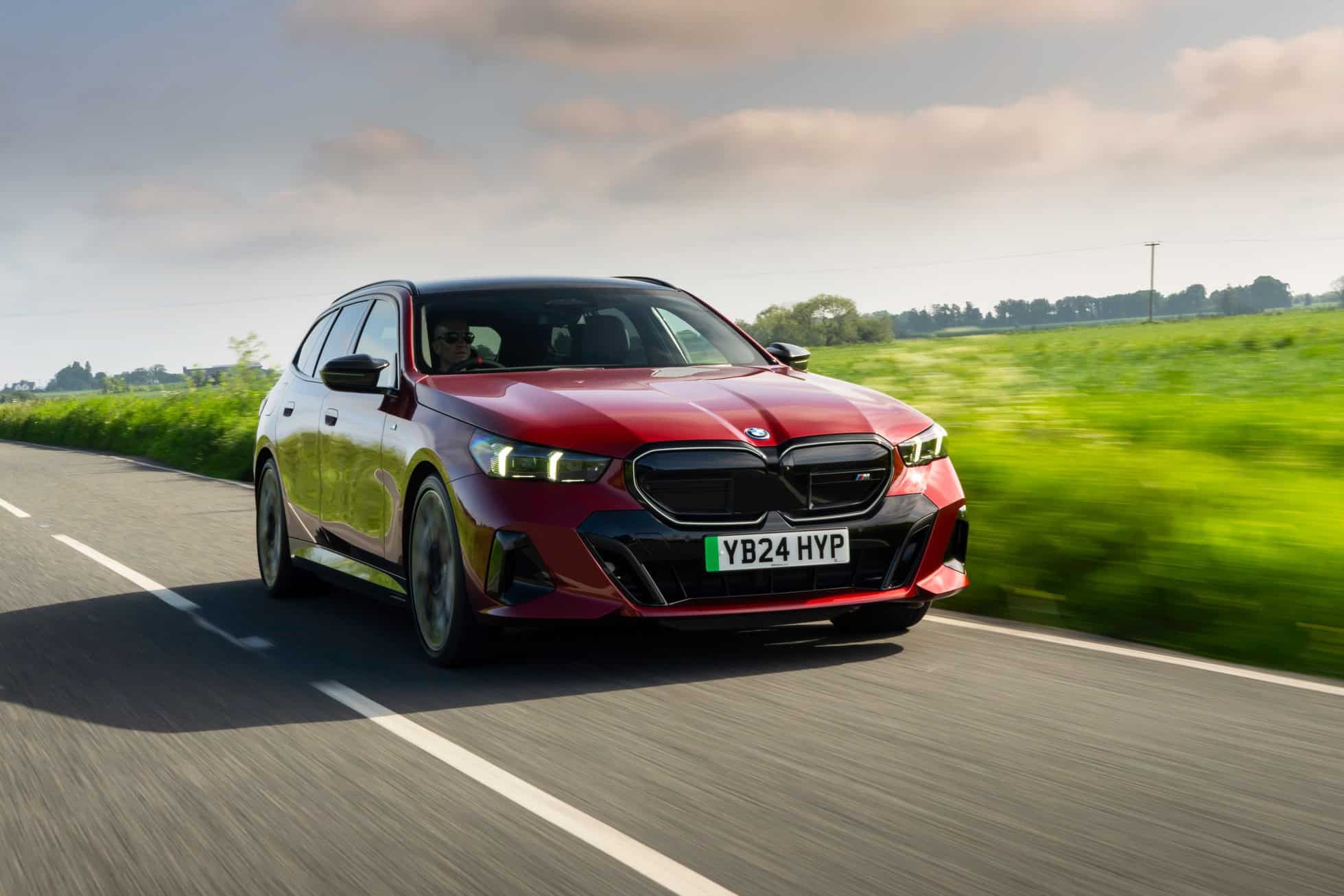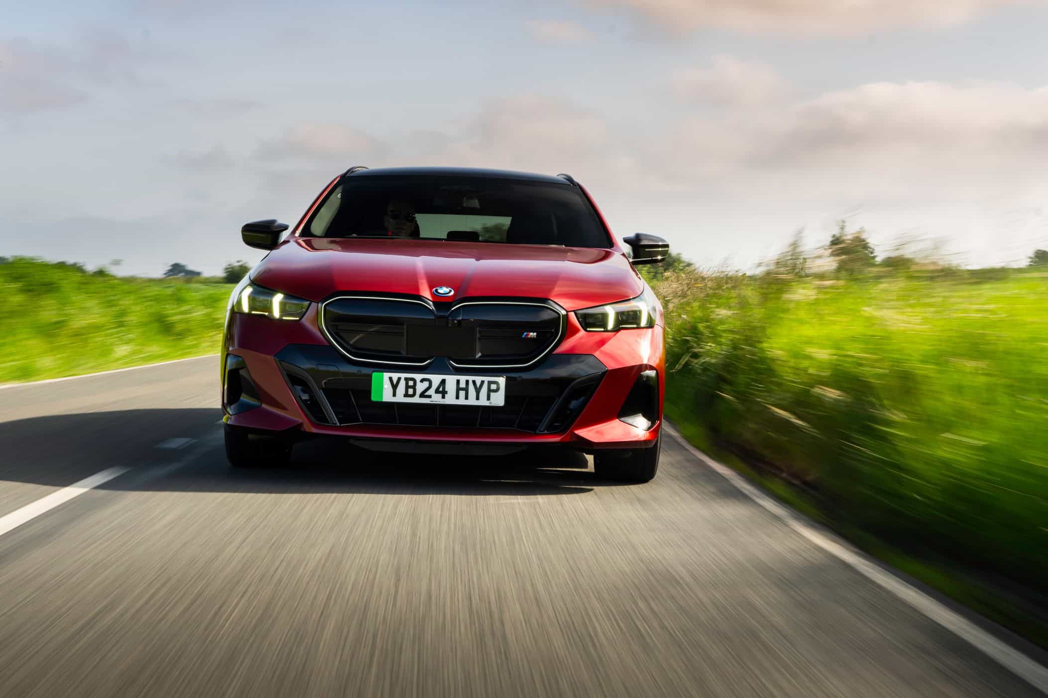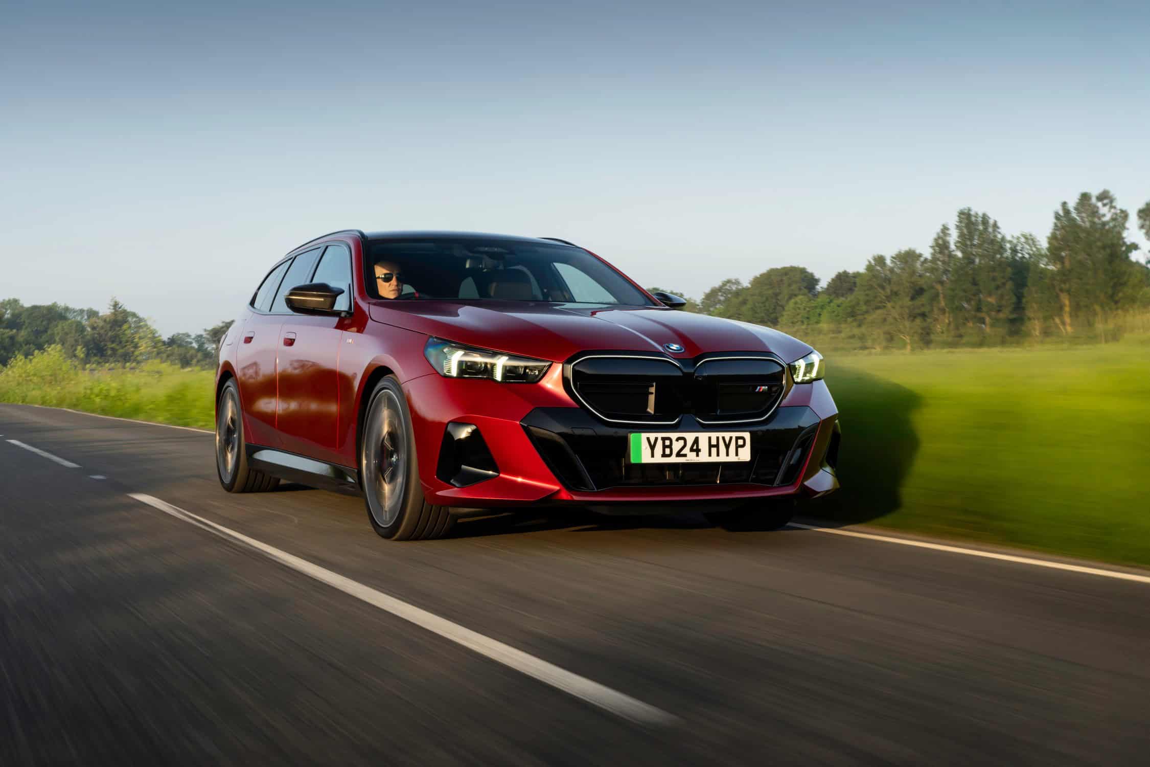 To coincide with the start of i5 Touring deliveries in the United Kingdom, BMW set up a photo shoot with the hottest G61 of them all. With no V8-powered M550i wagon this generation, the fully electric i5 M60 assumes the role of the M Lite estate. This right-hand-drive car highlighted by the automaker’s UK division wears the eye-catching Fire Red paint. In the United States, this color is marketed as Vegas Red.