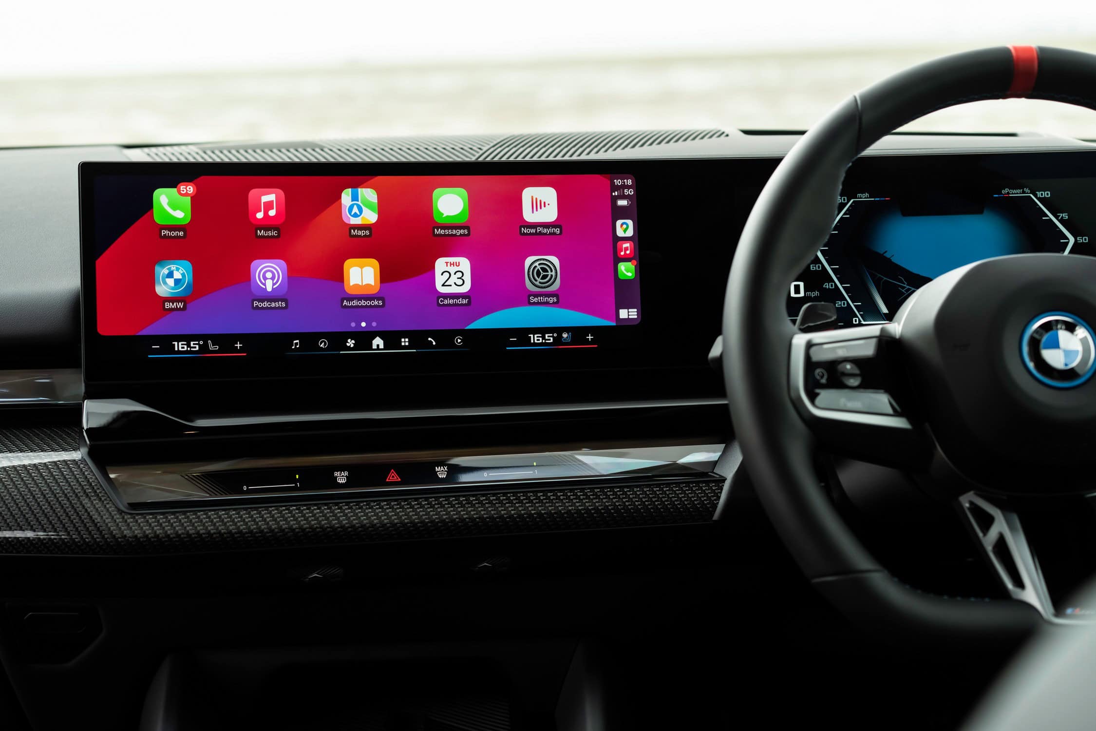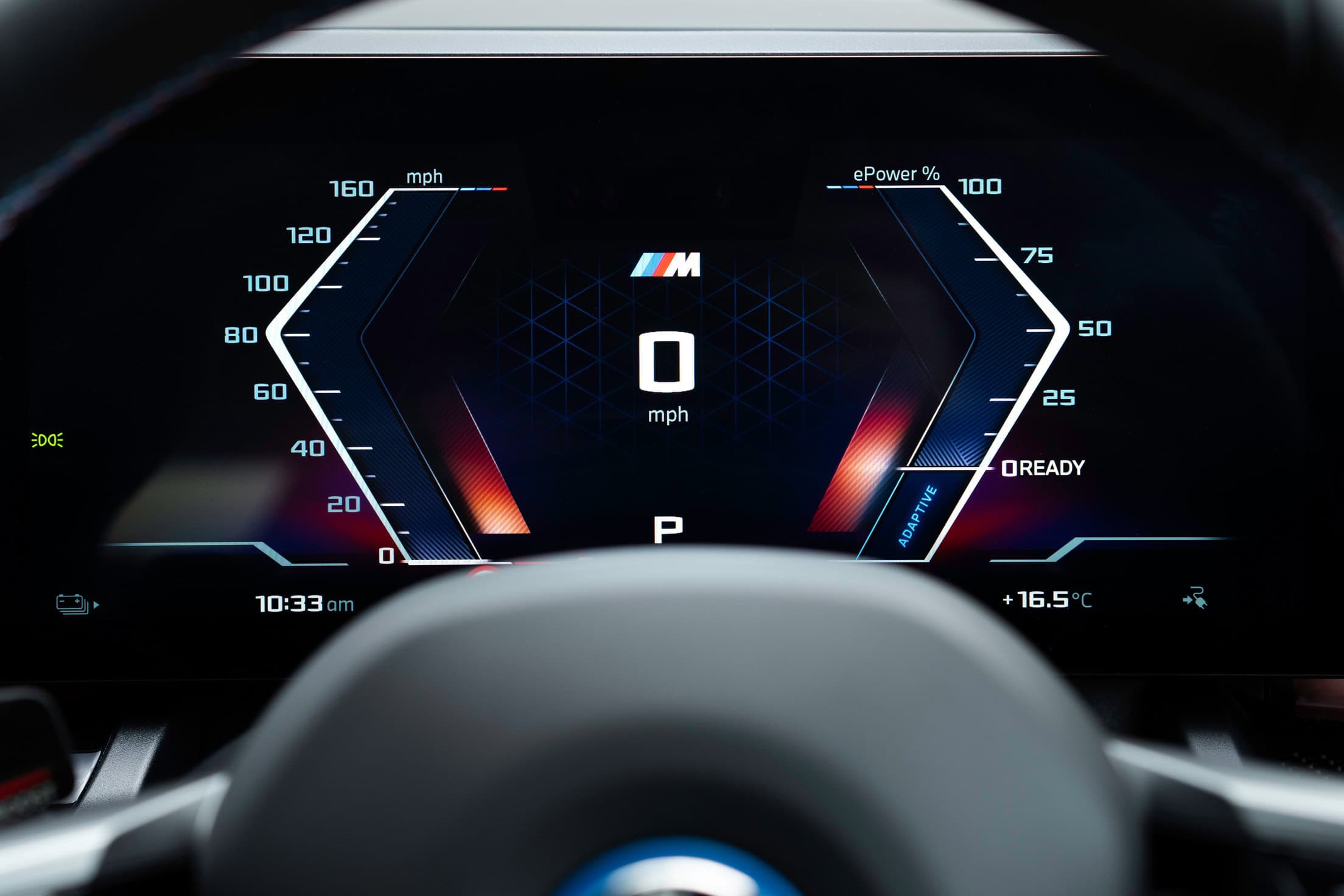Should you want that panoramic sunroof, it’ll add another £1,600 to the final bill. That means you’ll be paying six figures on an i5 M60 Touring even before adding options inside. Speaking of which, BMW UK fitted the cabin with the optional £400 carbon fiber trim adorned with silver threads and a glossy finish. We’re also noticing the £600 Crafted Clarity Controls, which is marketing jargon for crystal-like controls. You’ll see the jewel-esque look on the volume control, start/stop knob, gear selector, and the iDrive controller.