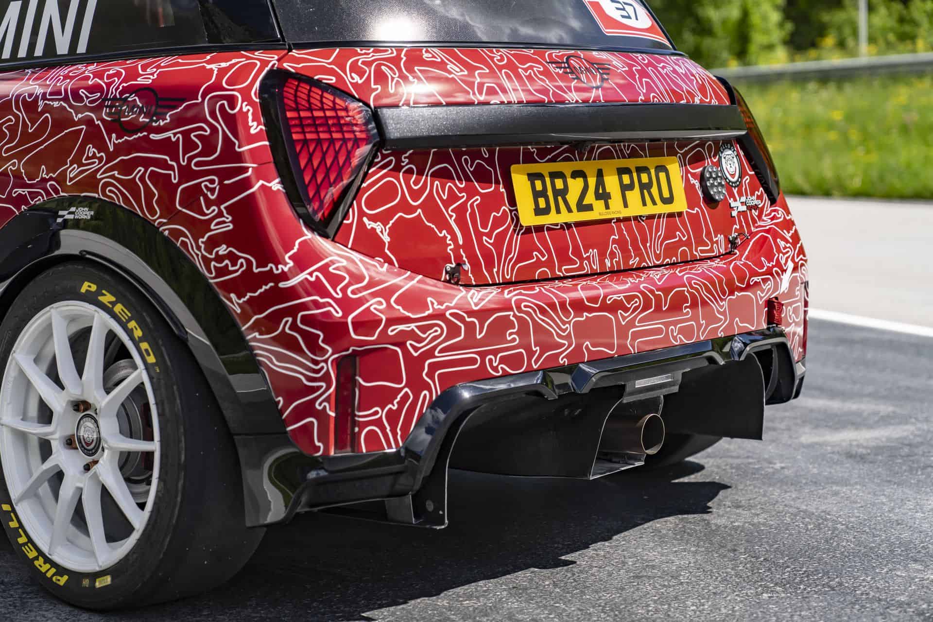 The MINI John Cooper Works PRO, designated as #317, is based on the new MINI John Cooper Works model, making its debut at the Nürburgring ahead of its world premiere in the fall of 2024. This car is camouflaged in a striking red and white motorsport wrap designed by the MINI Design Team, adding an element of intrigue and excitement. Built in Oxford, UK, and refined in Nürburg by Bulldog Racing, the MINI John Cooper Works PRO shows that endurance motorsport can still be exciting and fun.