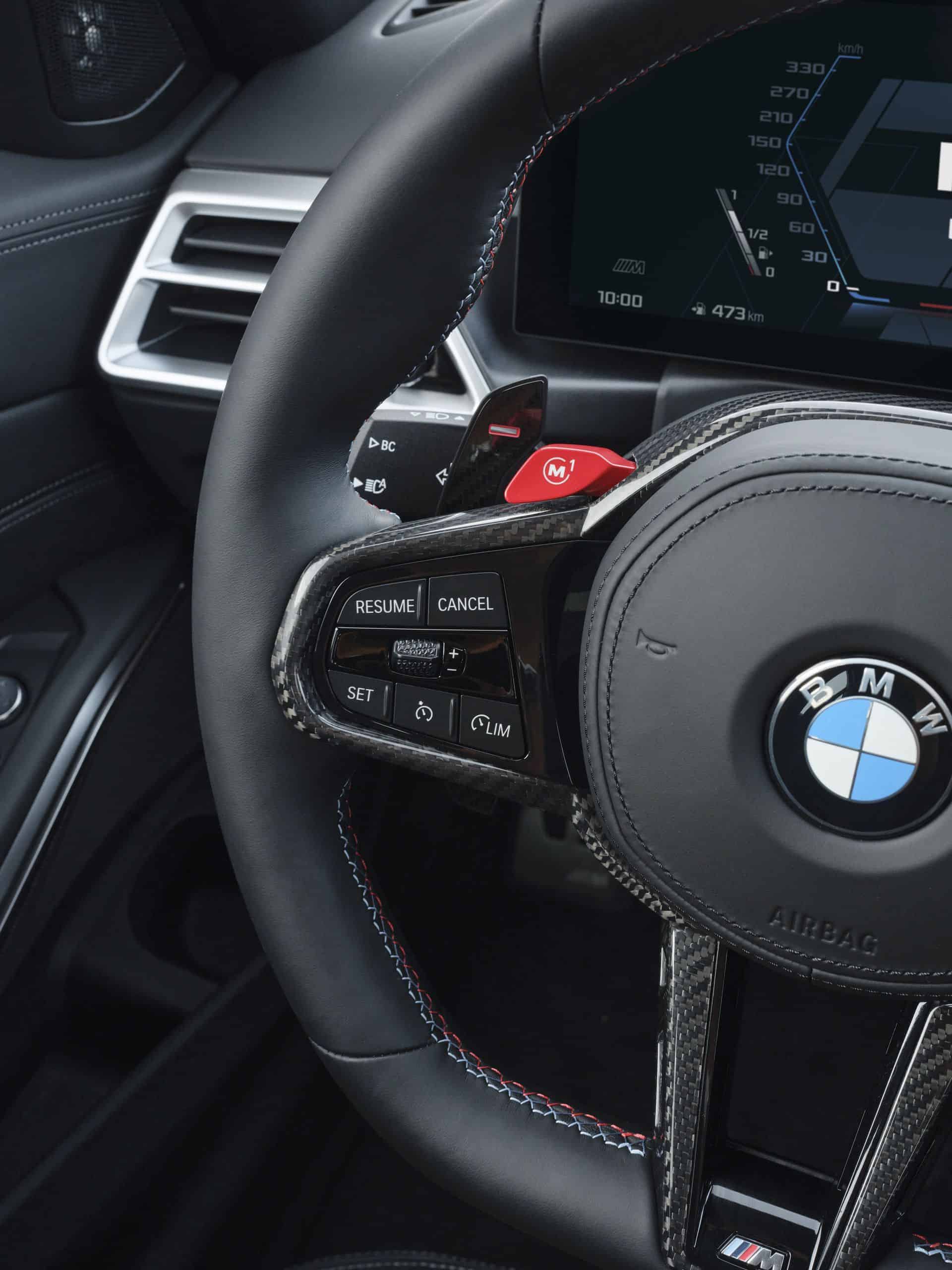 The interior is also more of the same, although the infotainment now runs on iDrive 8.5. That steering wheel with a flat rim is new for 2025. The spokes are slightly different and there’s a red accent at the 12 o’clock position. BMW offers the same steering wheel with an optional Alcantara finish. At an additional cost, the Sensatec-wrapped dashboard now has a nicer material. Speaking of things that cost extra, a new M Fine Brushed Aluminium trim is offered.