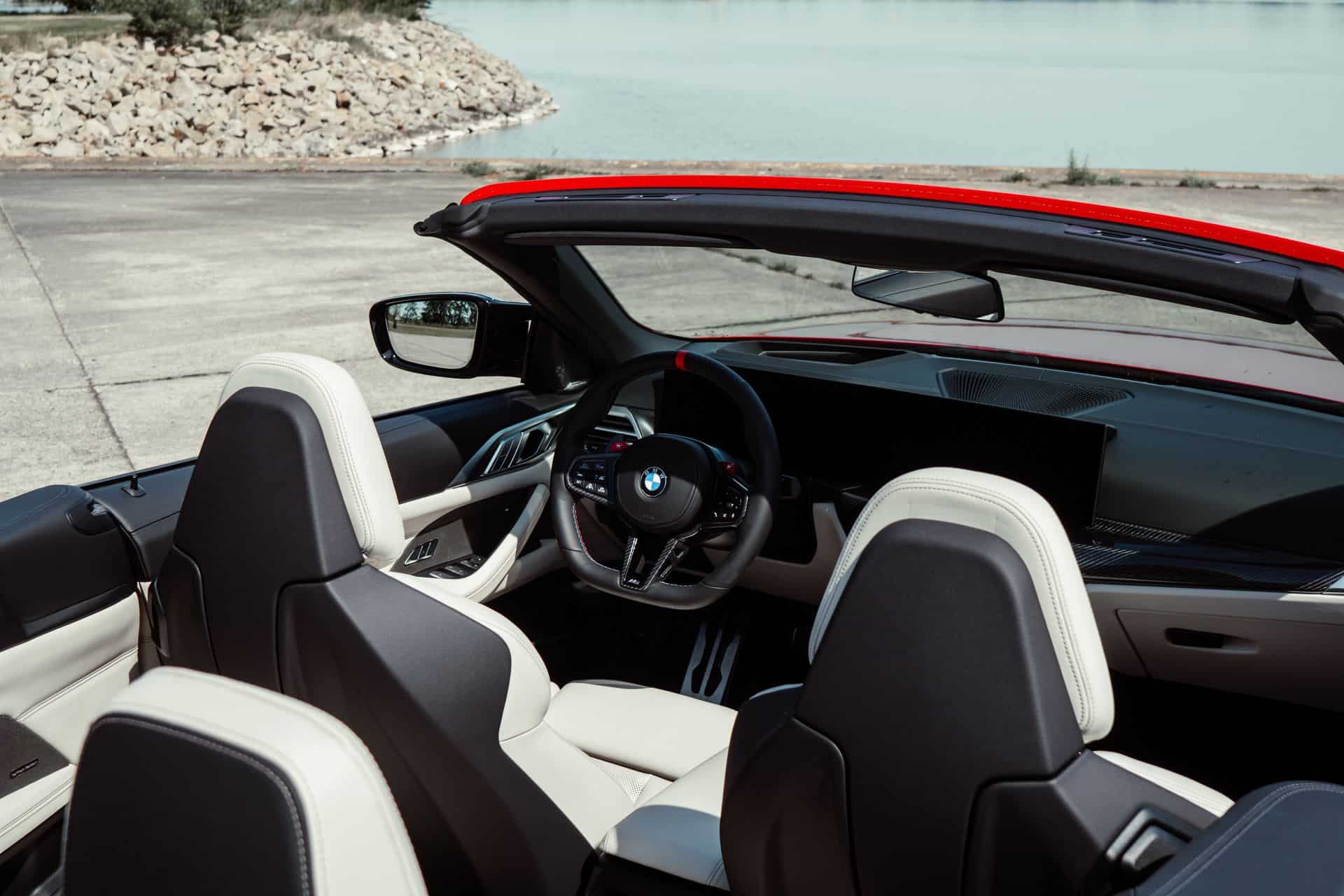 The interior of the 2025 model year has also seen its share of upgrades. A new steering wheel design features a red 12 o’clock mark and a flat bottom, adding to the sporty feel of the cabin. The central air vents have been revised, and the airflow toggles have been updated with contour lighting, further enhancing the car’s premium ambiance. The Dark Graphite interior trim replace the previous Aluminum Rhombicle Anthracite, providing a sleek and modern cabin feel. Technology-wise, the M4 Convertible Facelift is equipped with the latest advancements. The curved display from the previous model returns, now powered by BMW Operating System 8.5.