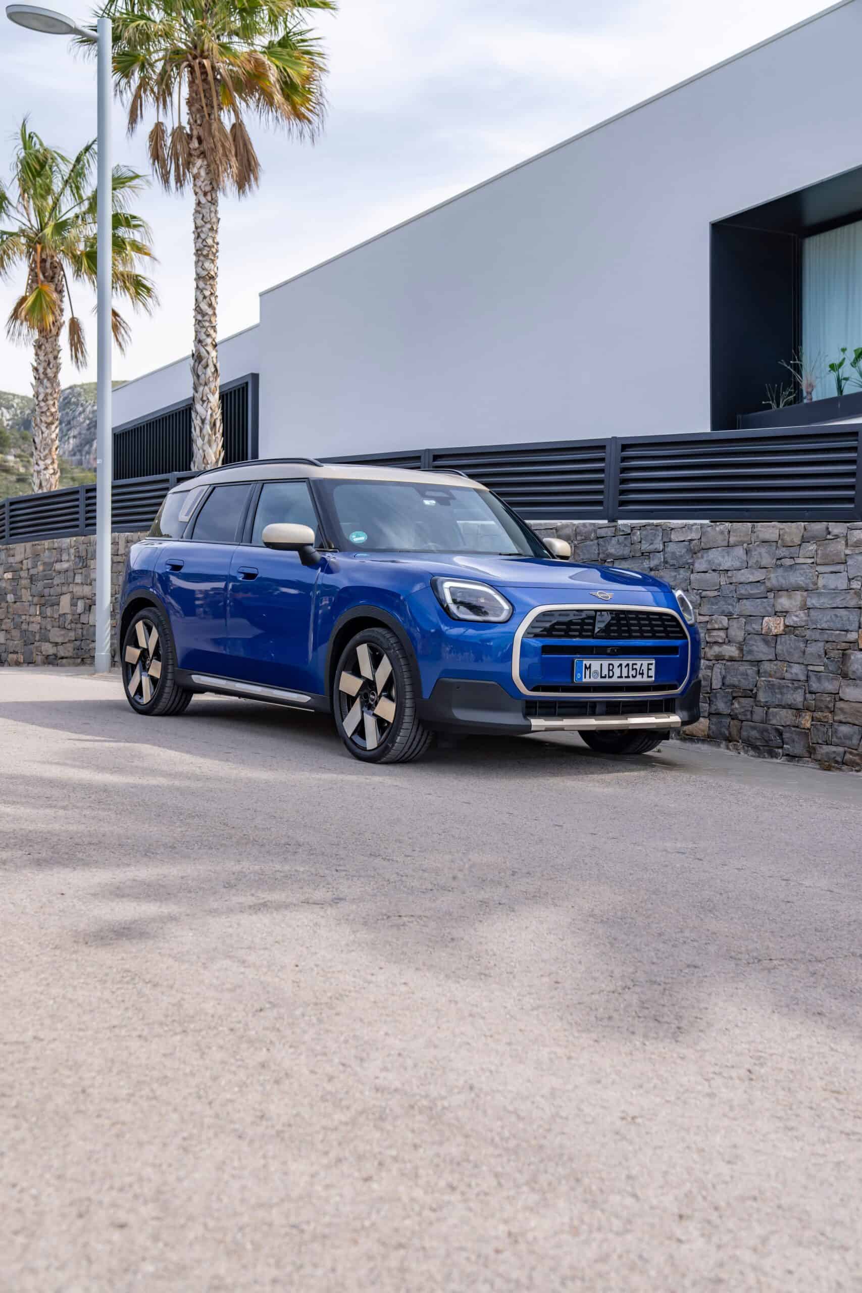 This Countryman E has been built in the Favoured Trim with Blazing Blue paint and optional Vibrant Silver accents. Because the latest generation has gotten so big, those massive 20-inch wheels with a windmill design don’t look out of place. Yes, you can get a MINI in 2024 with 20-inch alloys from the factory. If that’s too much, the Oxford-based brand also offers 17- to 19-inch wheels in multiple designs.