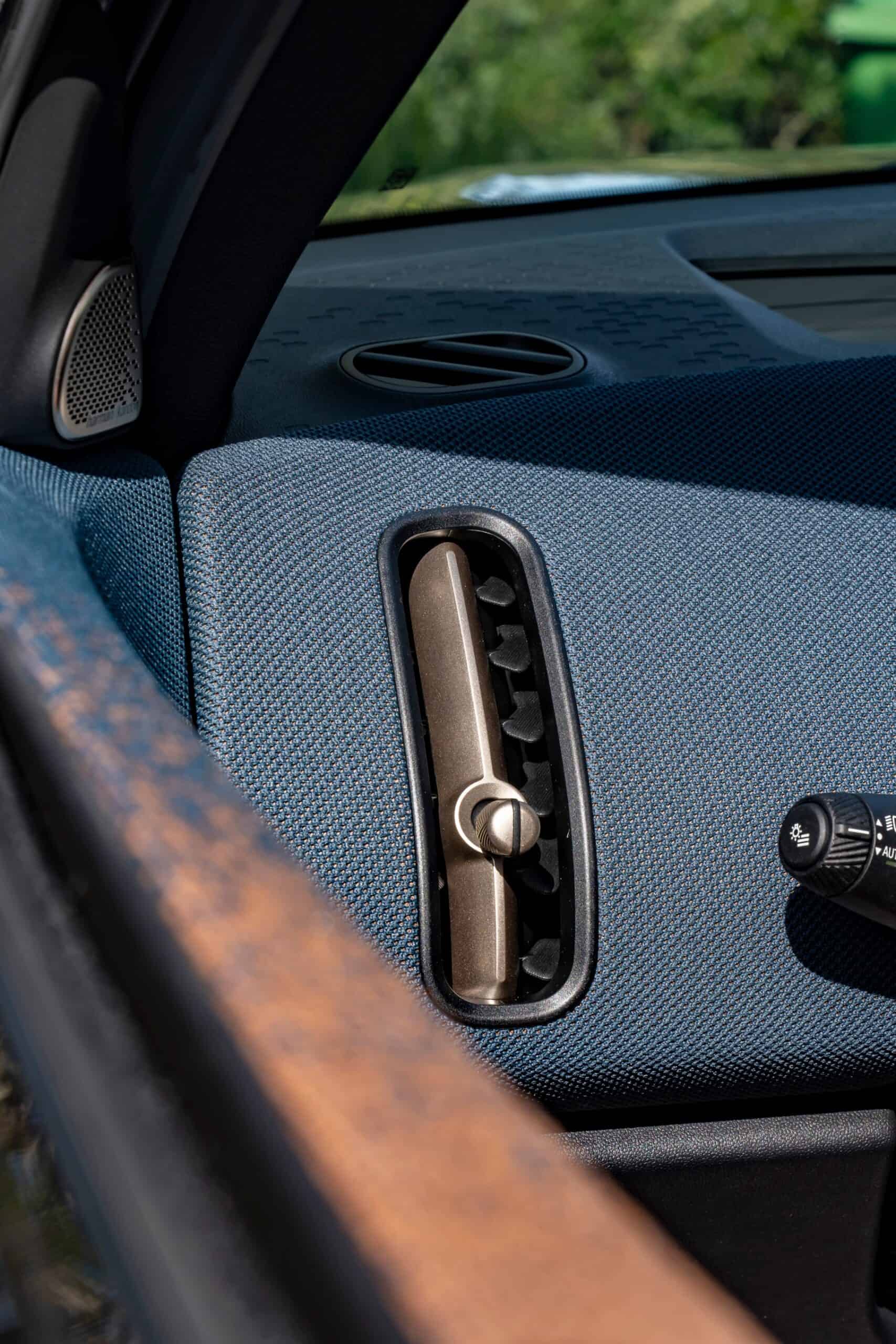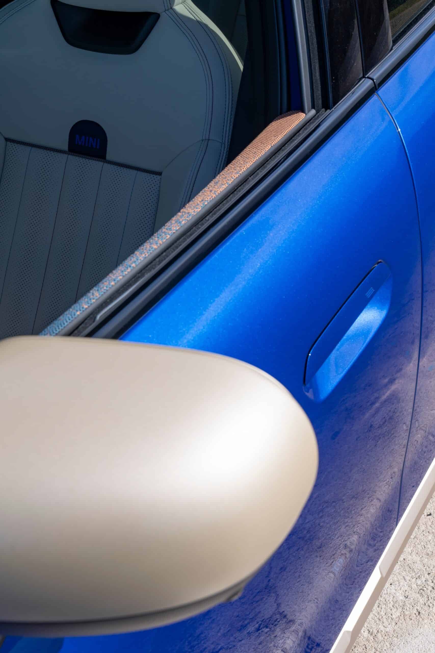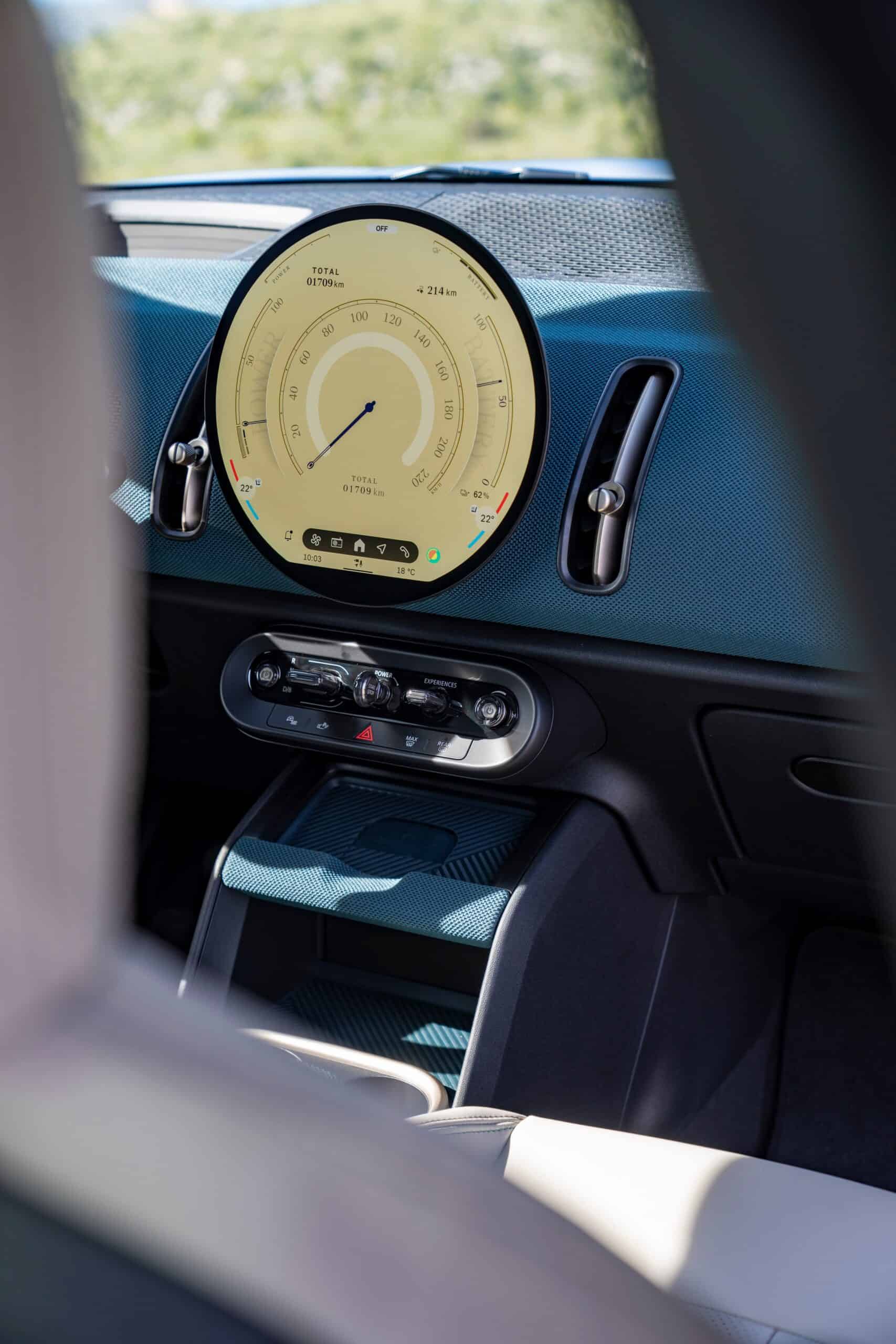 While the exterior may look like an evolution of the F60 generation, the cabin is completely different. Seen here with perforated synthetic leather in beige and dark petrol accents, the interior is a stark departure from the preceding model. MINI has taken the “less is more” approach by drastically cutting down the number of physical controls. In the name of minimalism, the driver’s display is also gone. You’ll be accessing most functions from that center OLED touchscreen measuring 9.4 inches.