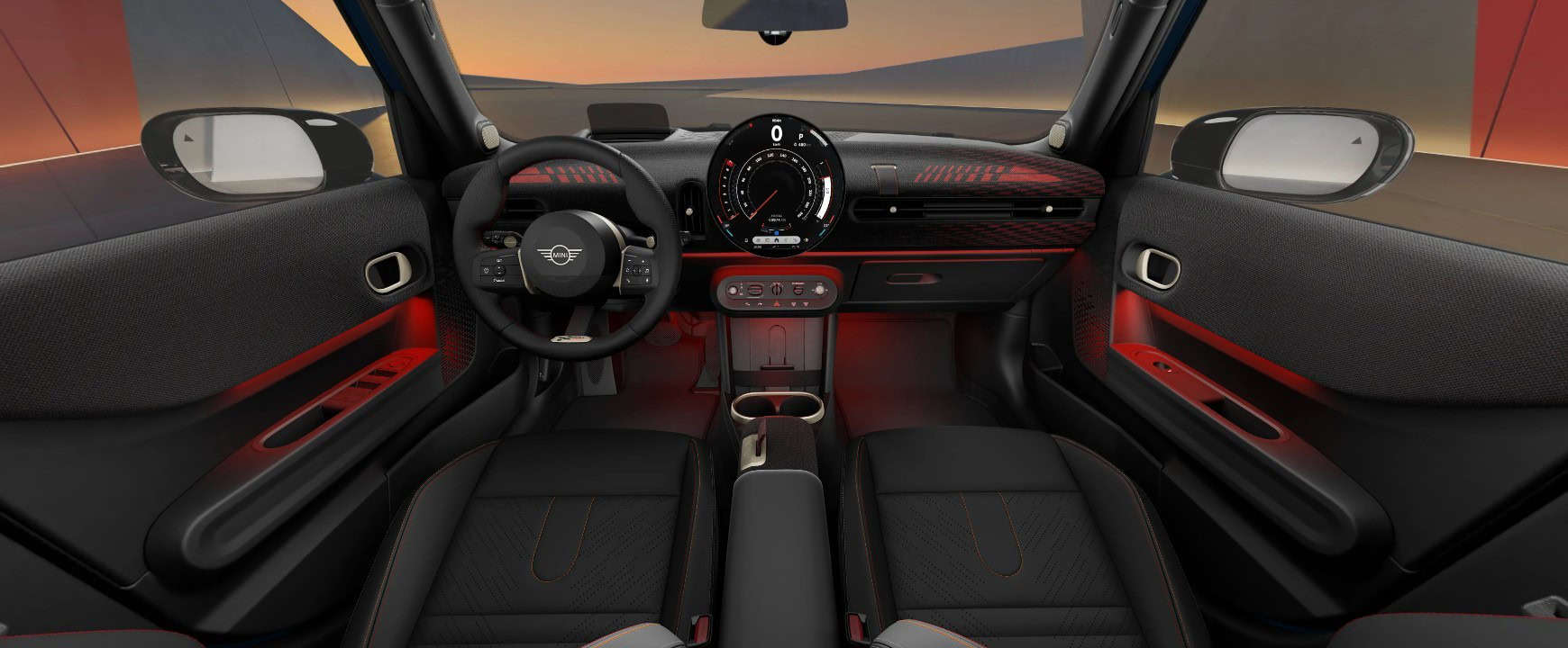 The interior comes in a fixed configuration with black synthetic leather and knitted fabric upholstery with red stitching. The cabin is more spacious than that of the 3-Door model since MINI stretched the wheelbase by 72 mm (2.8 in). Overall, the 5-Door body style is 172 mm (6.7 in) longer. At the same time, it’s a bit bigger than the previous-generation model, the F55.