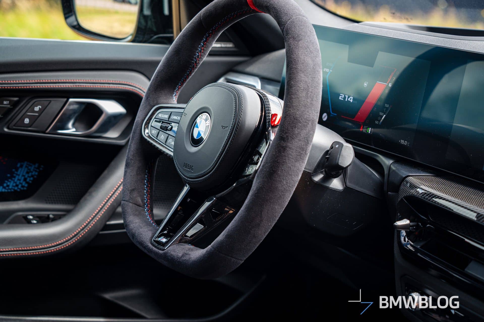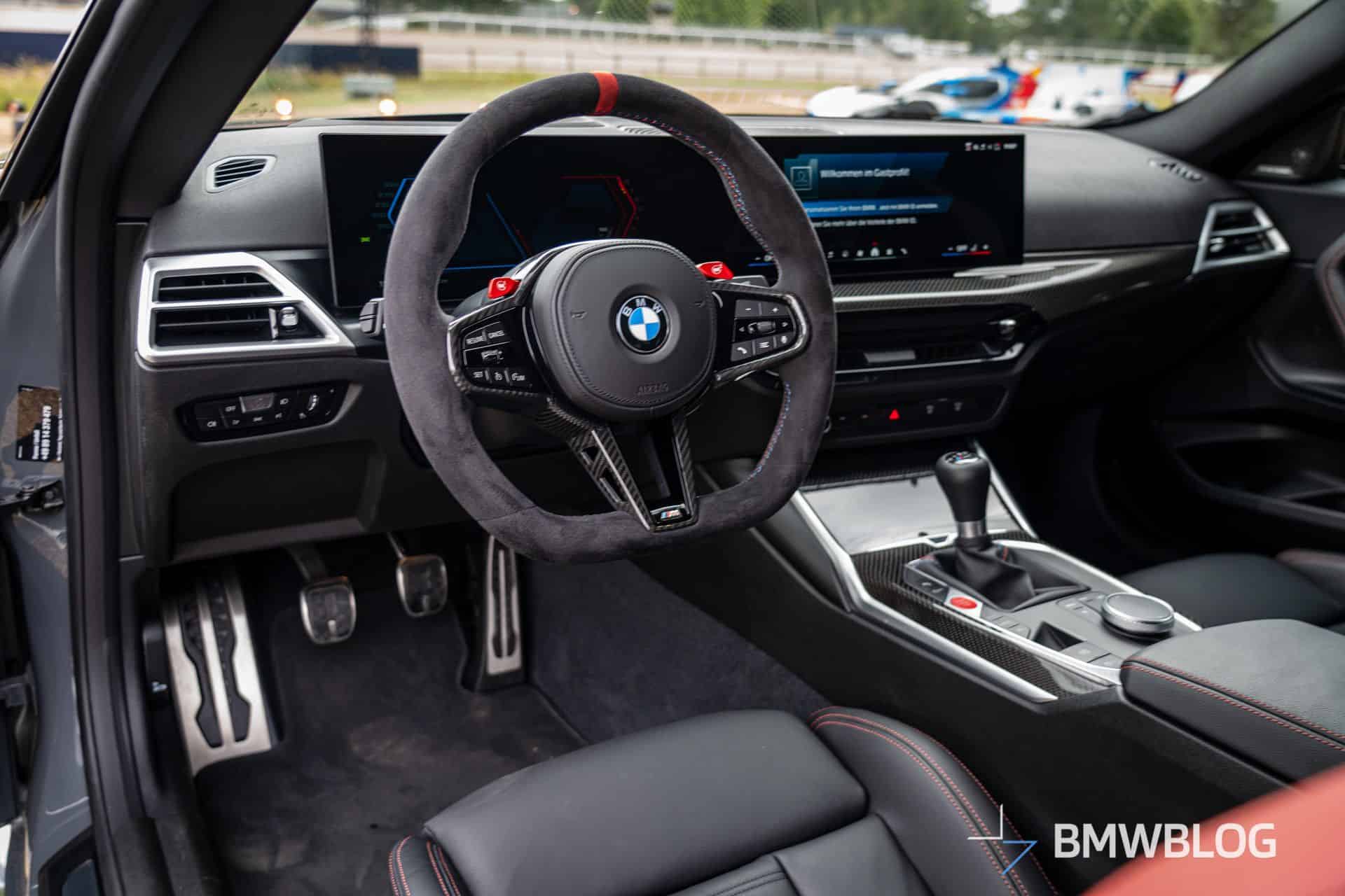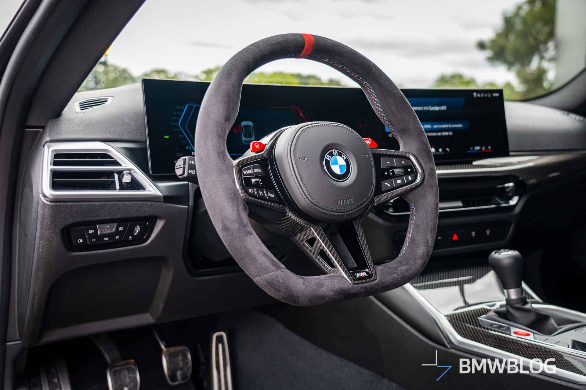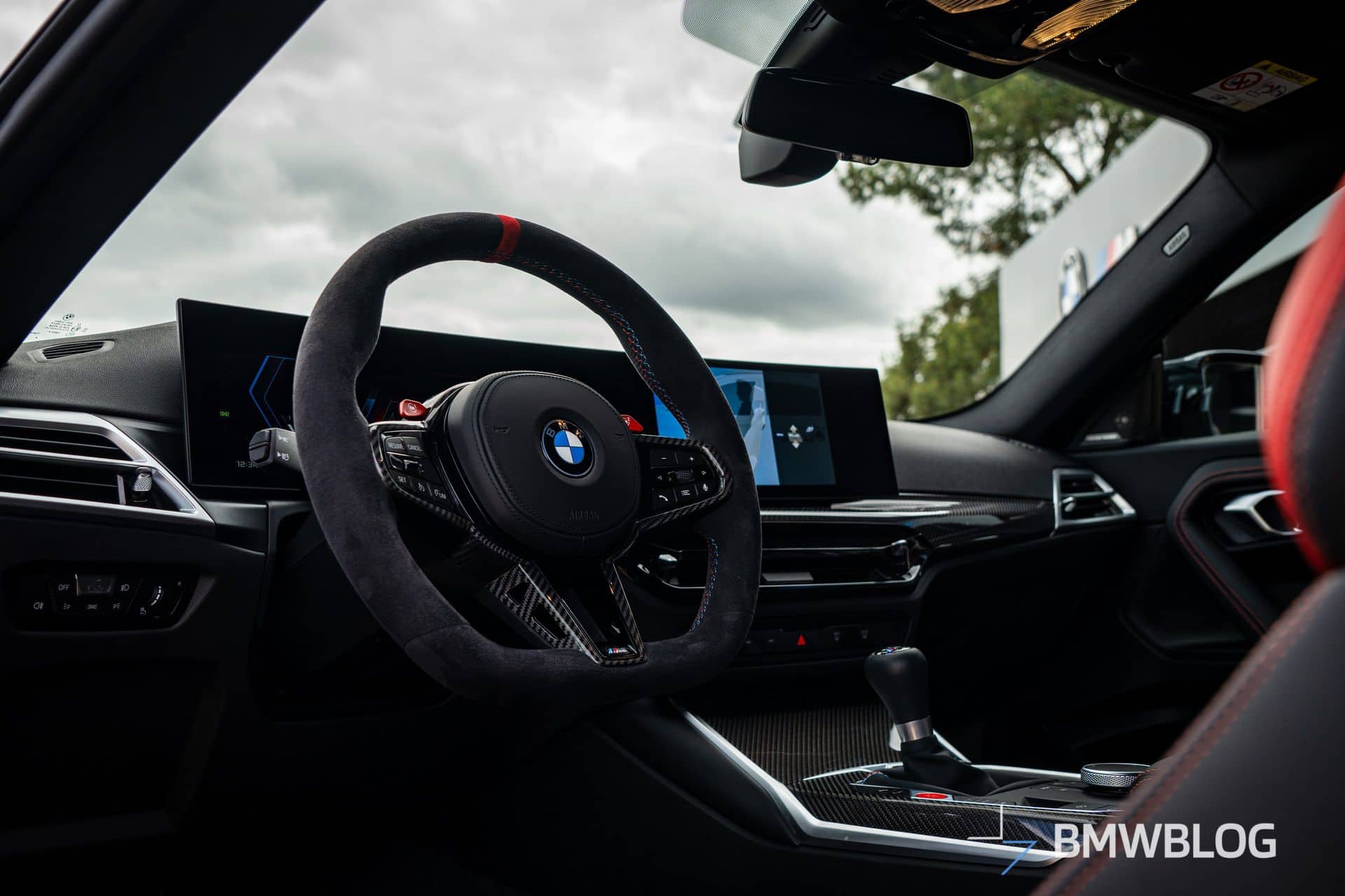 The last change on the outside is quite subtle. Take a closer look at the M2 badges and you’ll notice they’re now black with a silver contour. Going forward, the trim around the quad exhaust tips will be black as standard. Inside, the flat-bottomed steering wheel with a 12 o’clock red mark is also debuting with the 2025 model year. It’s shown here with an optional Alcantara finish whereas the standard wheel comes wrapped in leather.