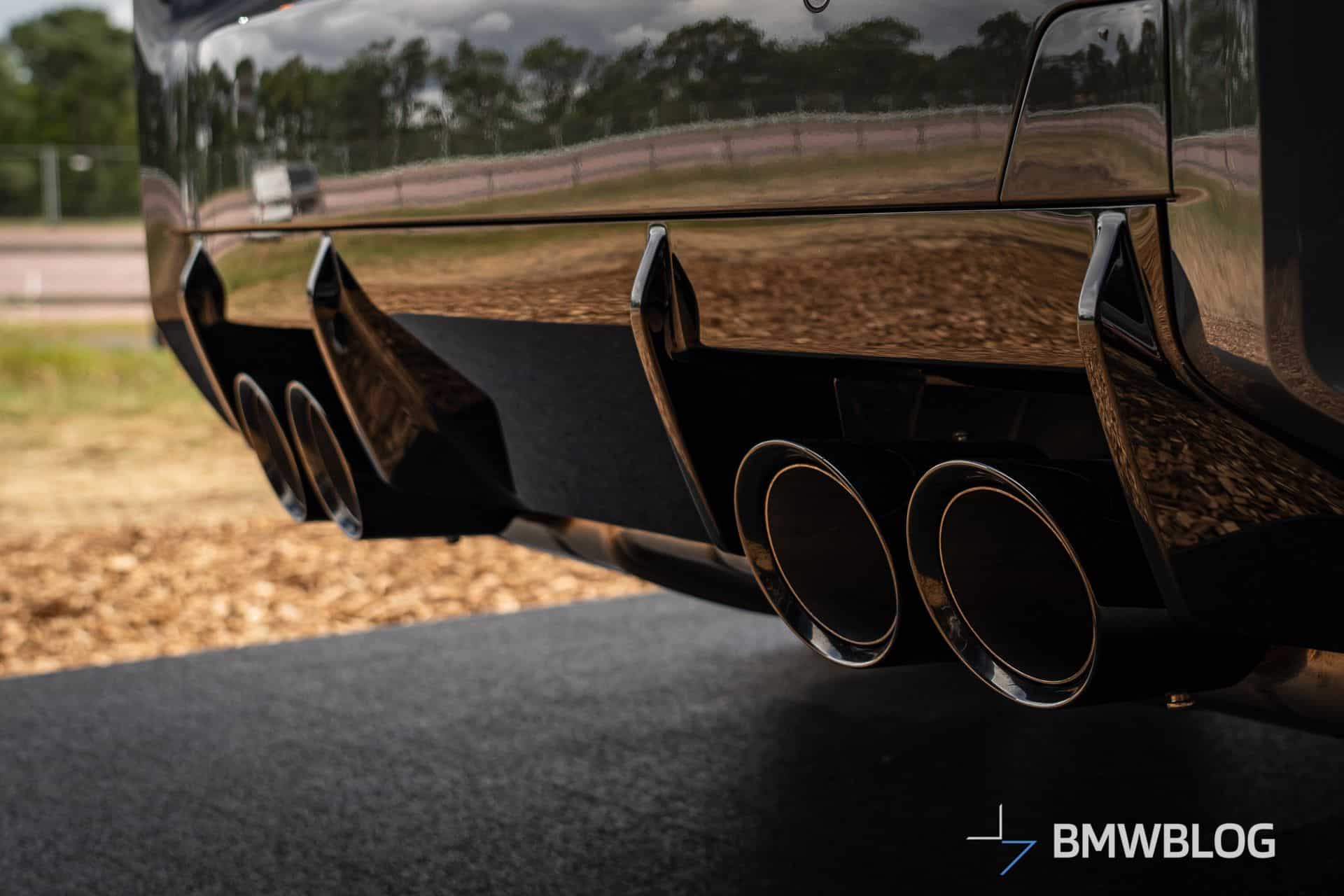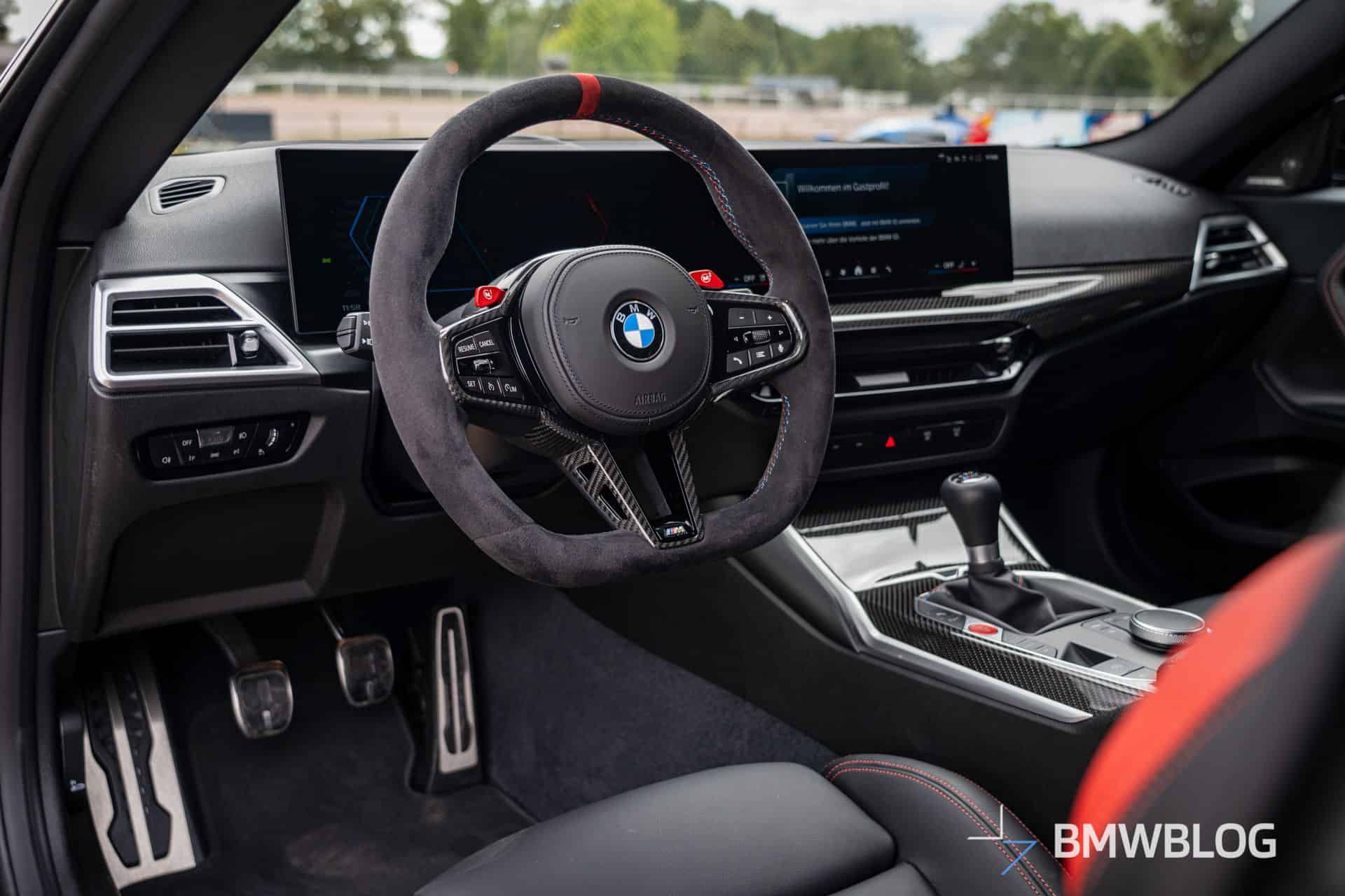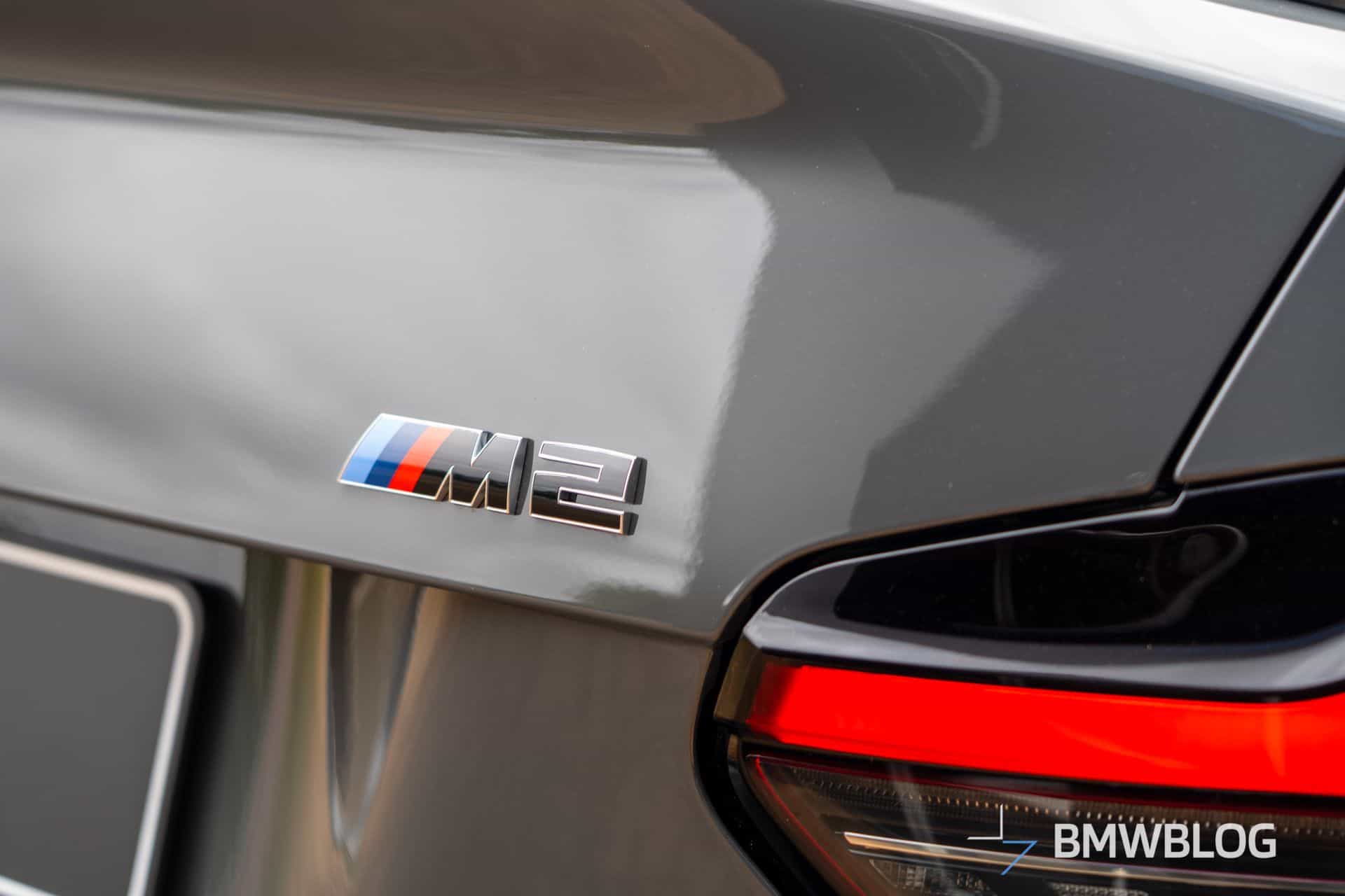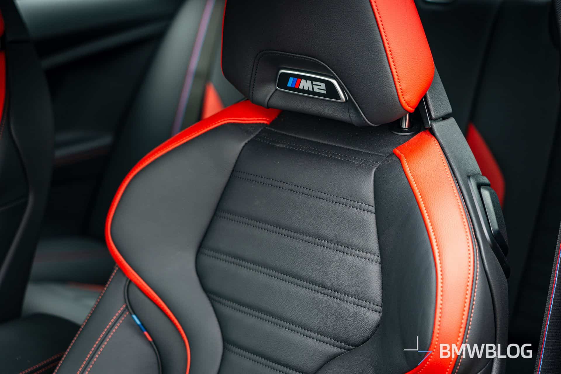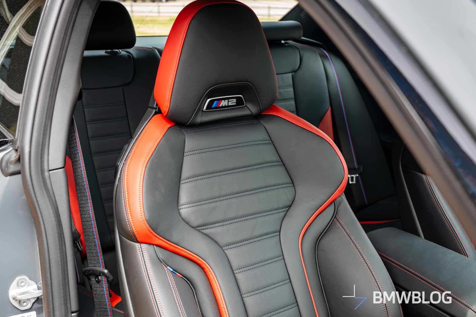 The last change on the outside is quite subtle. Take a closer look at the M2 badges and you’ll notice they’re now black with a silver contour. Going forward, the trim around the quad exhaust tips will be black as standard. Inside, the flat-bottomed steering wheel with a 12 o’clock red mark is also debuting with the 2025 model year. It’s shown here with an optional Alcantara finish whereas the standard wheel comes wrapped in leather.