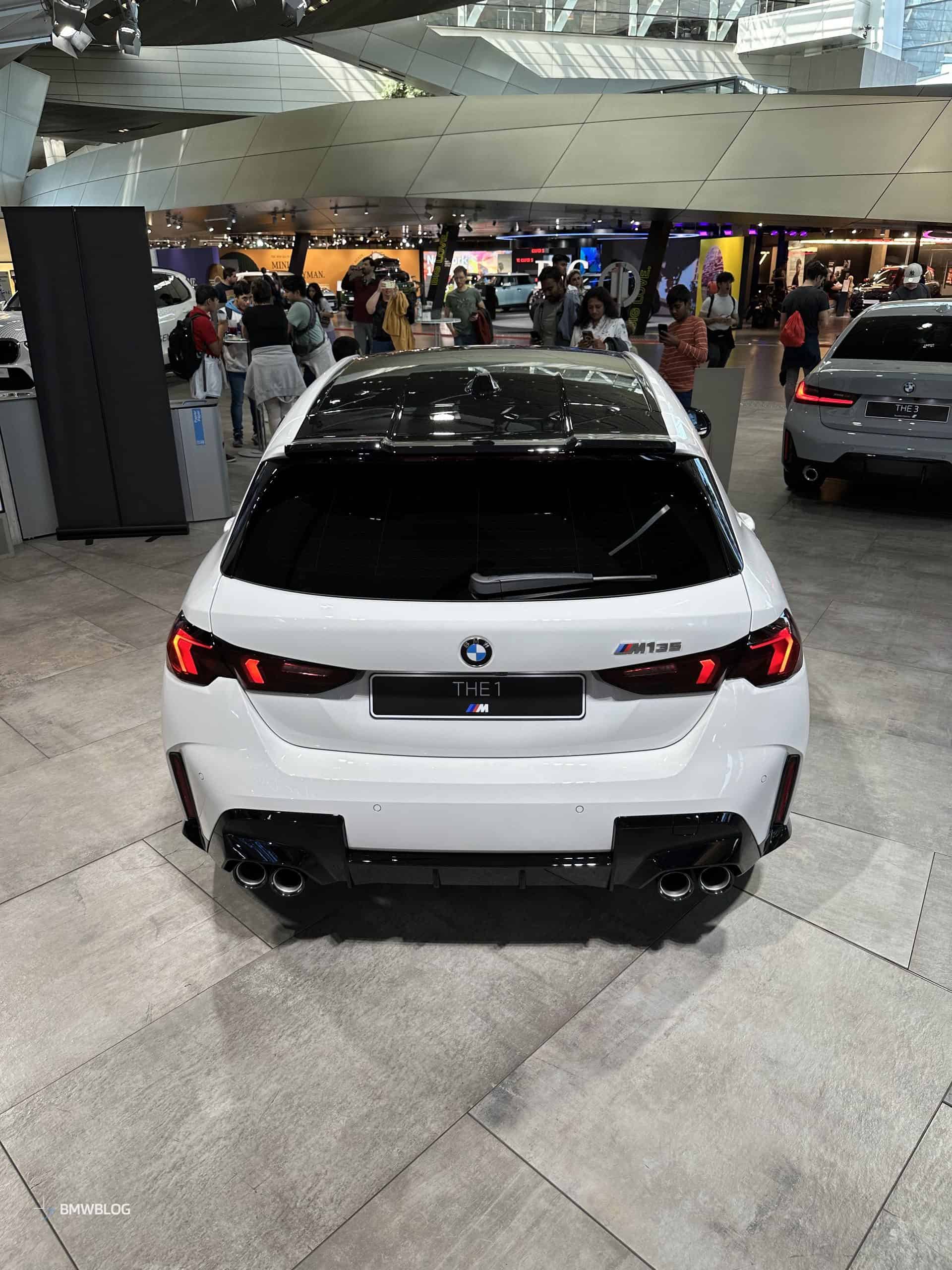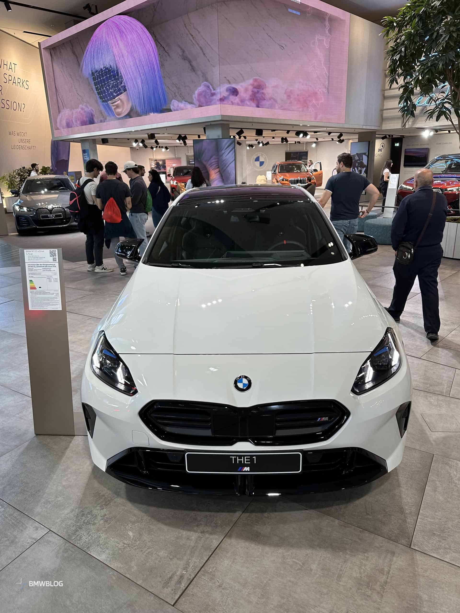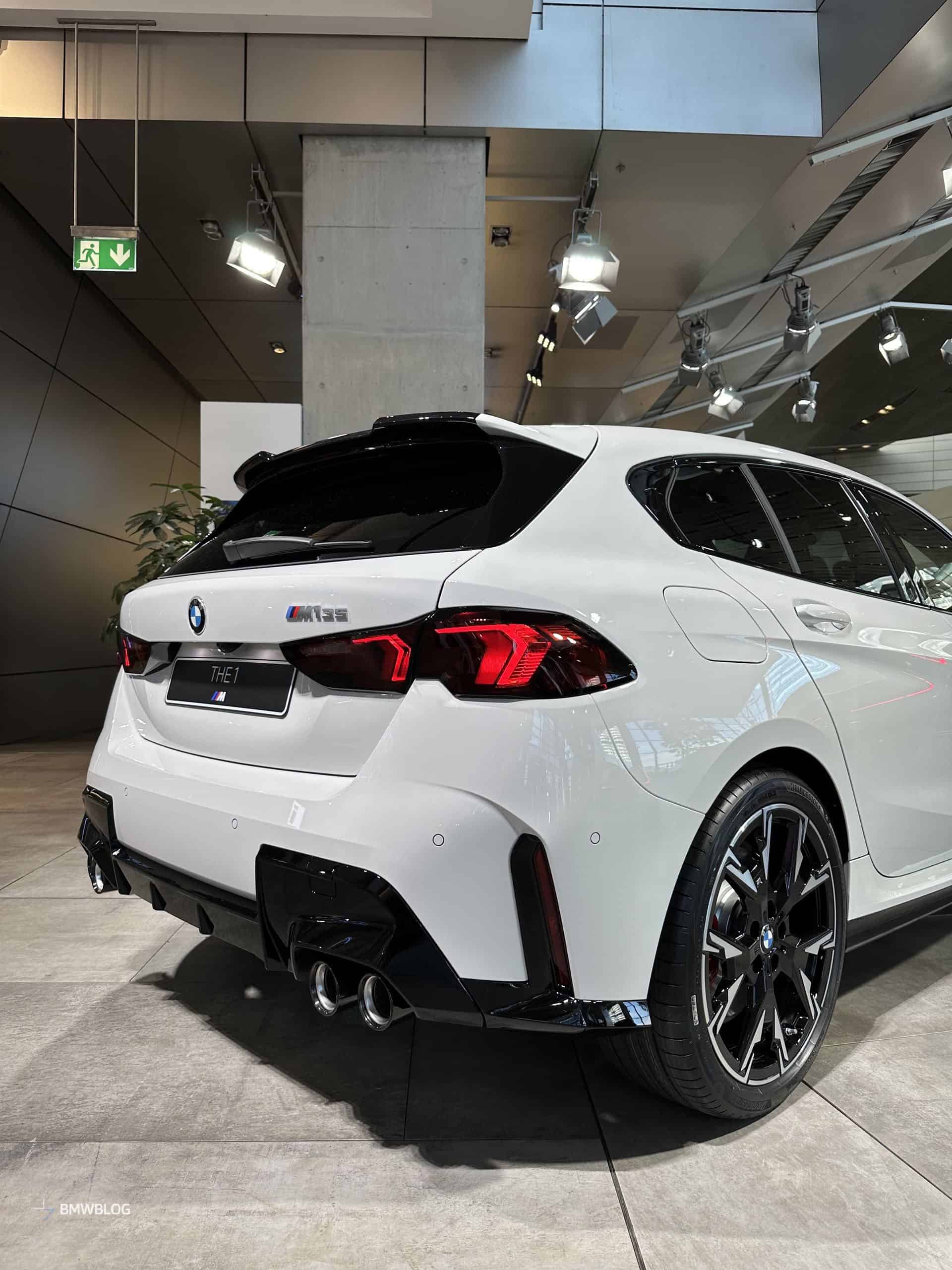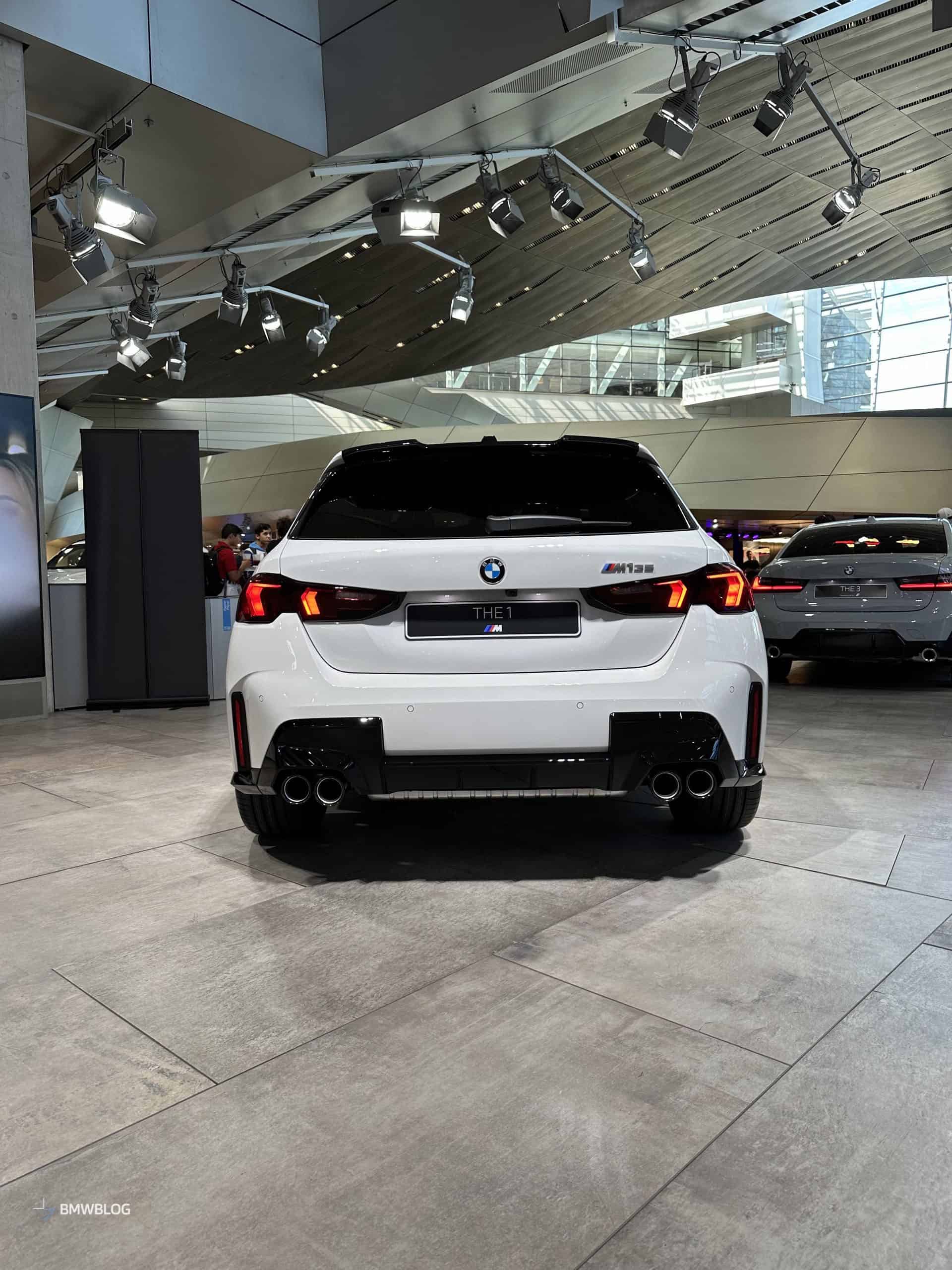 We had the chance to get up close and personal with the M135 in its most basic color this week at the BMW Welt in Munich. It wasn’t a standard configuration since the car had the optional 19-inch wheels (Style 976 M). You can tell by the headlights’ blue inner accents the compact performance hatchback had adaptive LEDs with a matrix glare-free high beam.