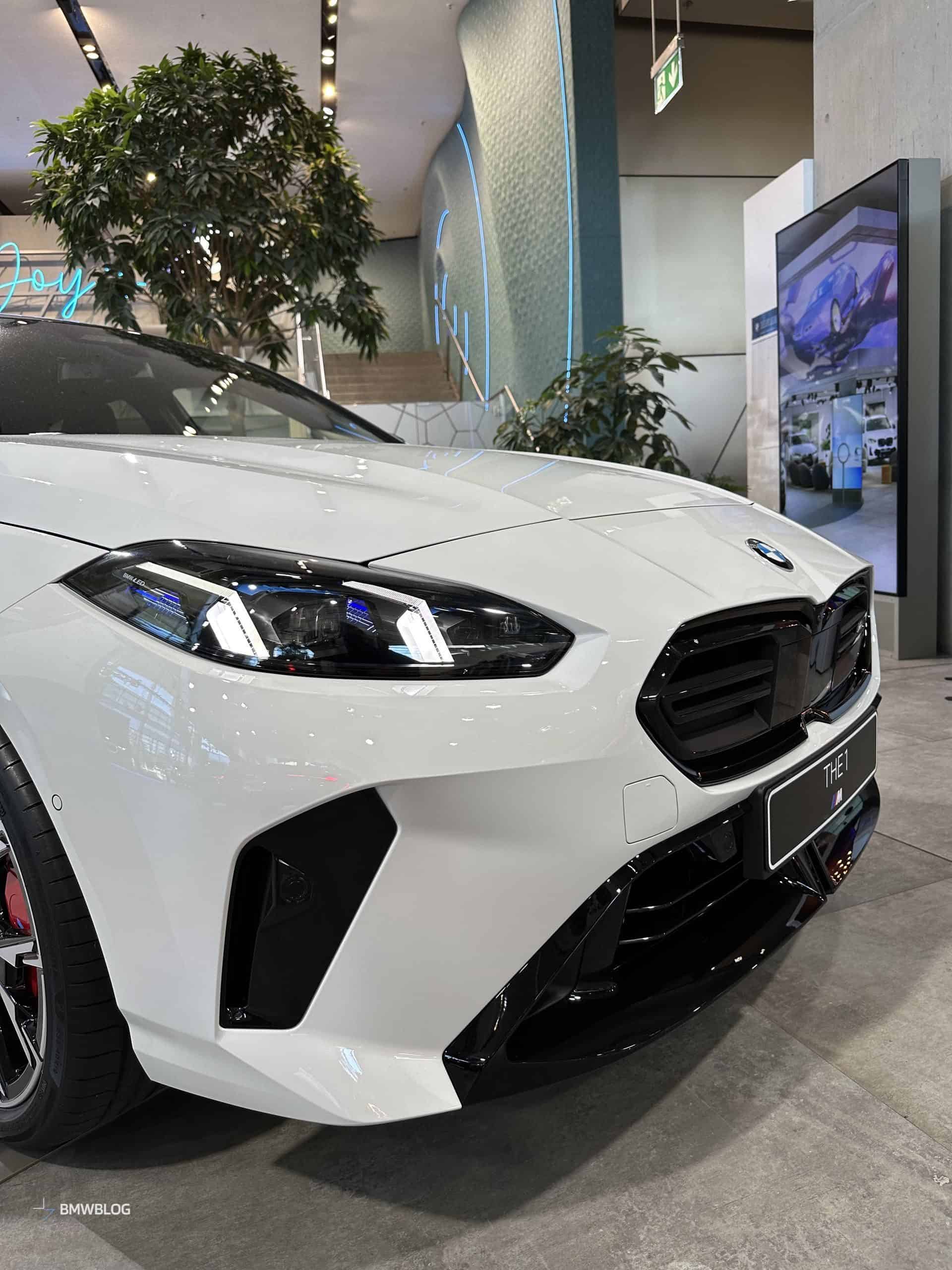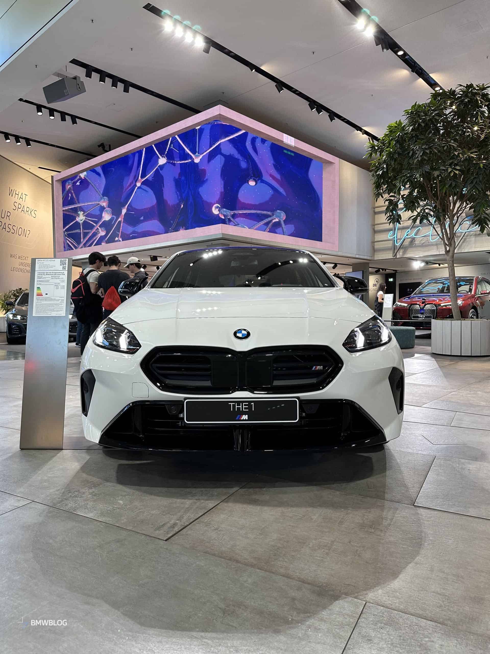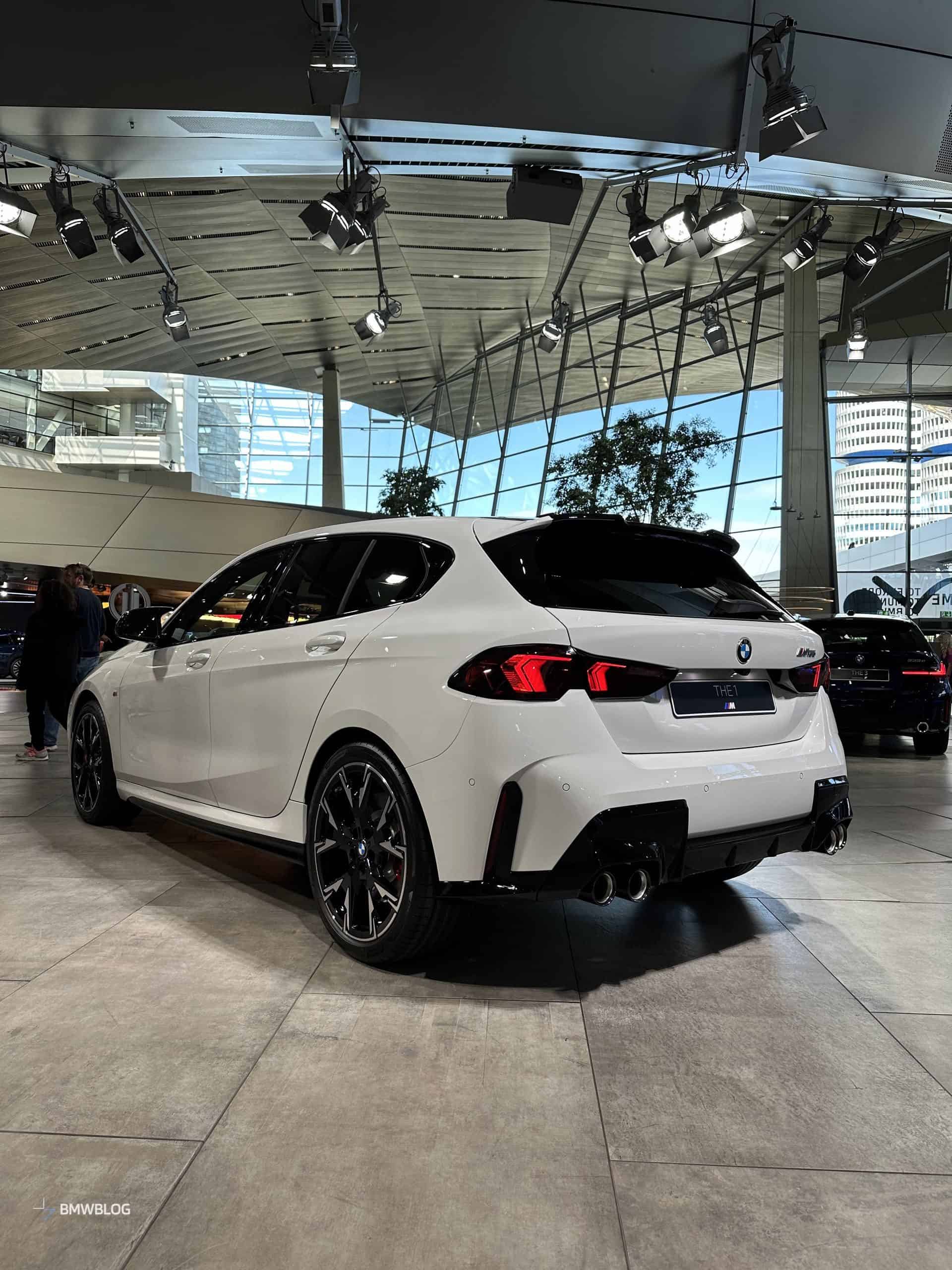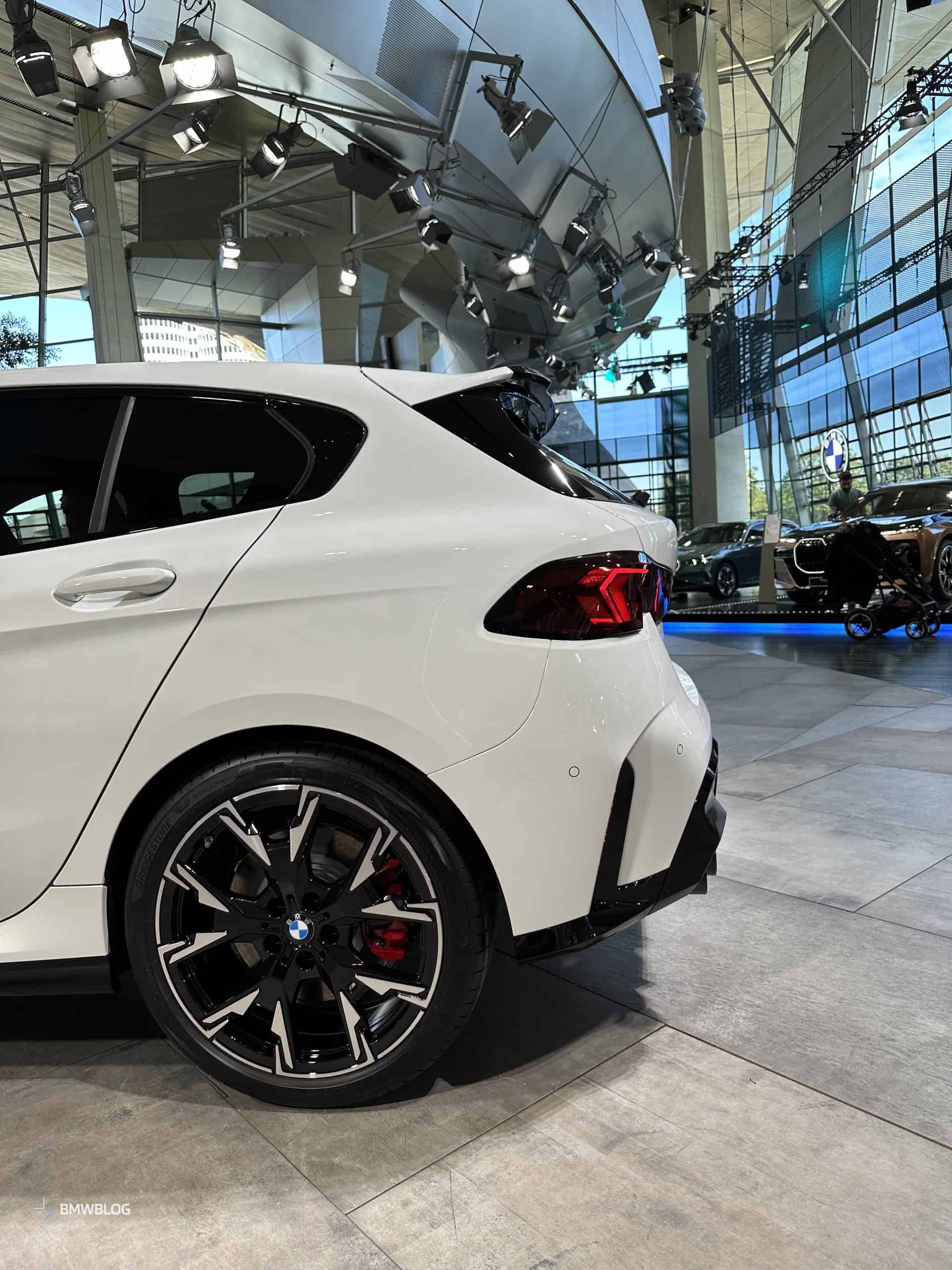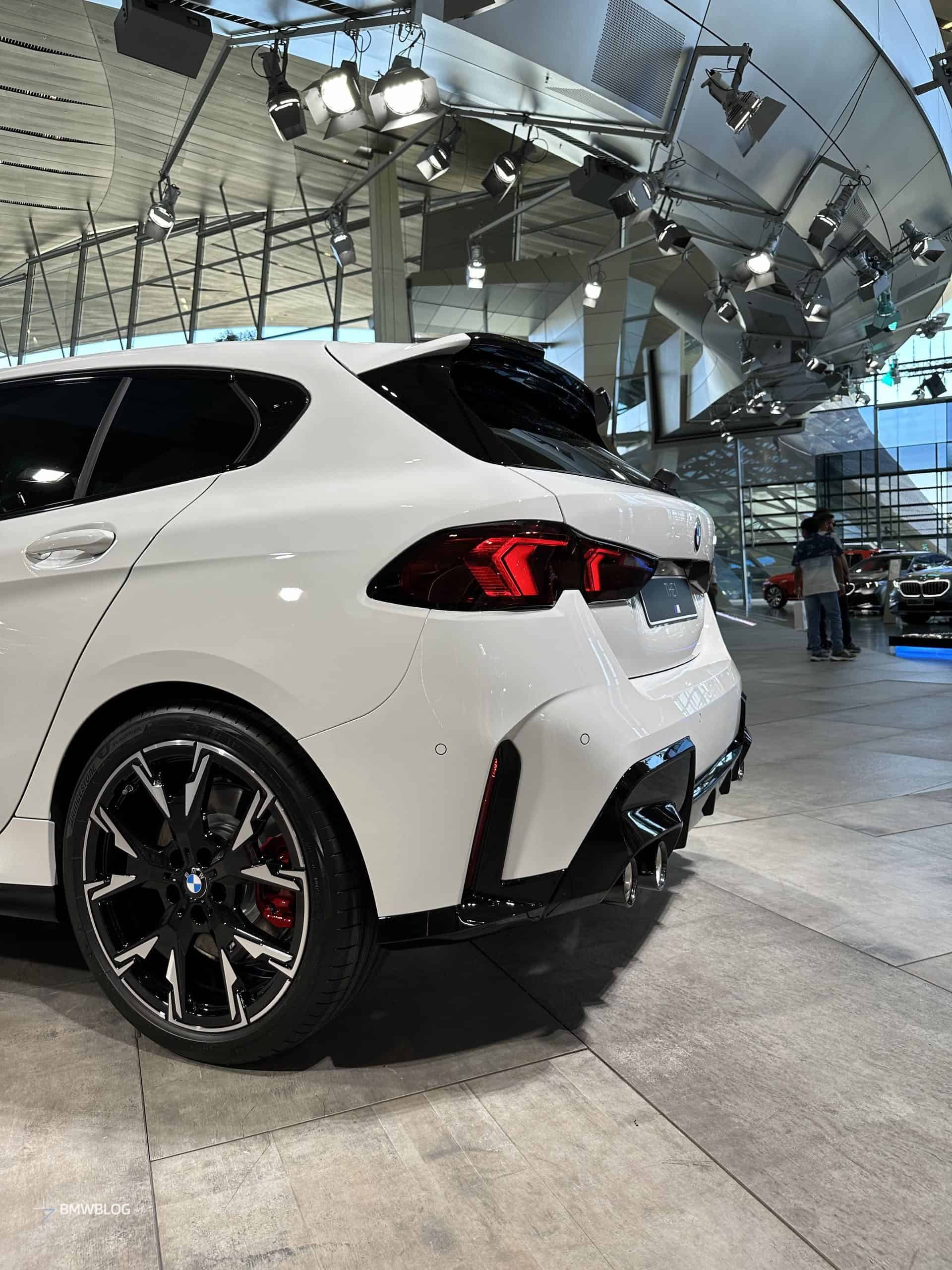 We had the chance to get up close and personal with the M135 in its most basic color this week at the BMW Welt in Munich. It wasn’t a standard configuration since the car had the optional 19-inch wheels (Style 976 M). You can tell by the headlights’ blue inner accents the compact performance hatchback had adaptive LEDs with a matrix glare-free high beam.