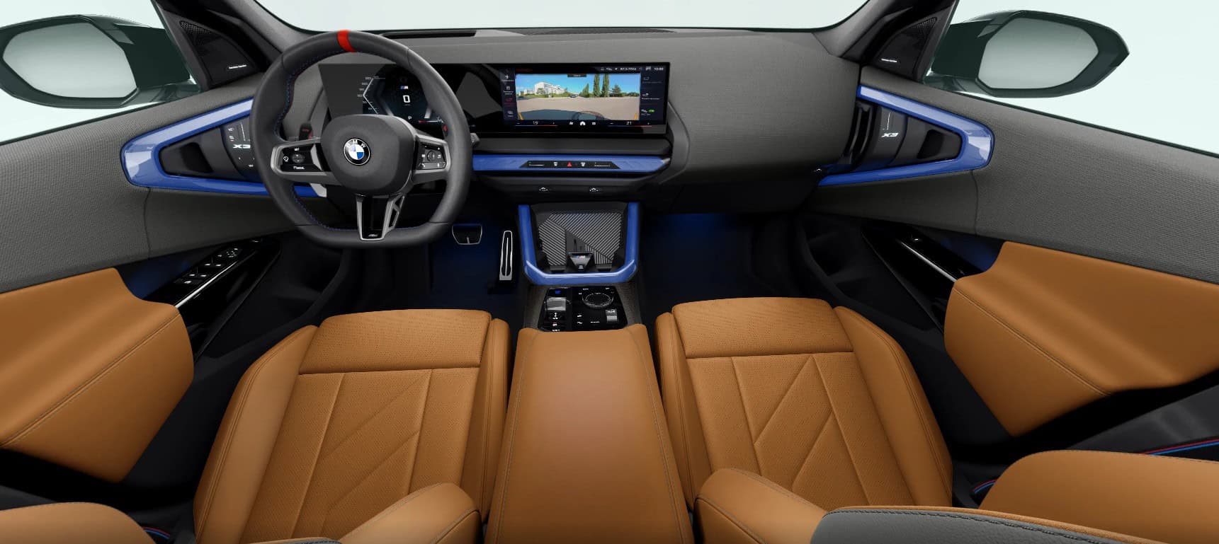 We opted for the Frozen Pure Grey Metallic paint, a matte color from the Individual catalog available for a steep €2,880. Our pricey build also has 21-inch aerodynamic Individual wheels with a two-tone look, which will set you back an extra €1,650. Inside, the fully loaded X3 M50 has real leather. This Merino upholstery in Amber/Atlas Gray is another Individual upgrade for which BMW will charge you €2,400.
