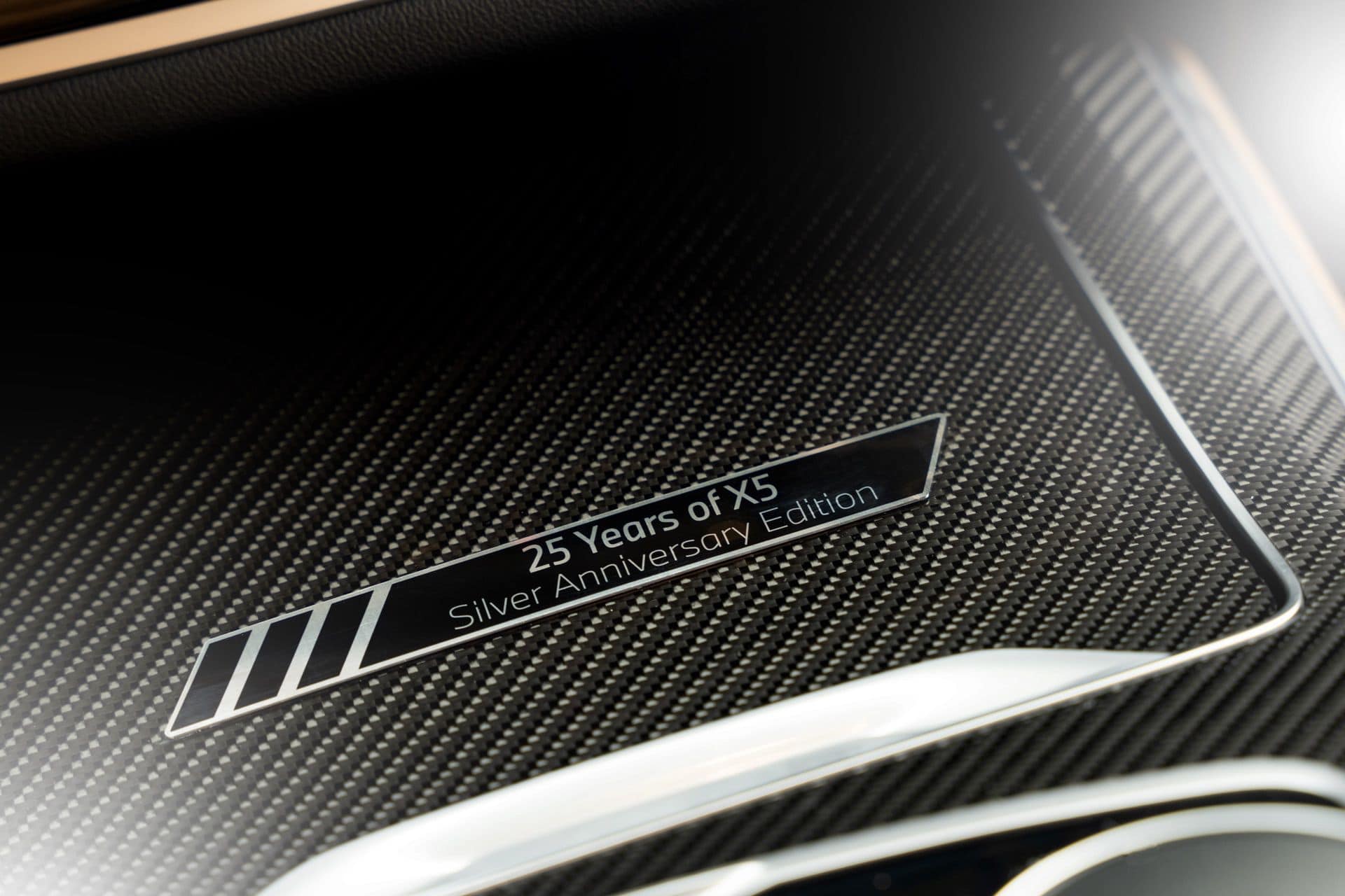 Beyond the off-road goodies, this X5 Silver Anniversary Edition gets an Individual Lime Rock Grey metallic paint. Those all-terrain tires we mentioned come with 20-inch wheels borrowed from the M Sport Package. Speaking of M goodies, the Extended Shadowline dark accents are typically seen on X5 configurations with the M Sport Package. In addition, the carbon fiber trim inside is taken straight out of an X5 M60i or an X5 M.