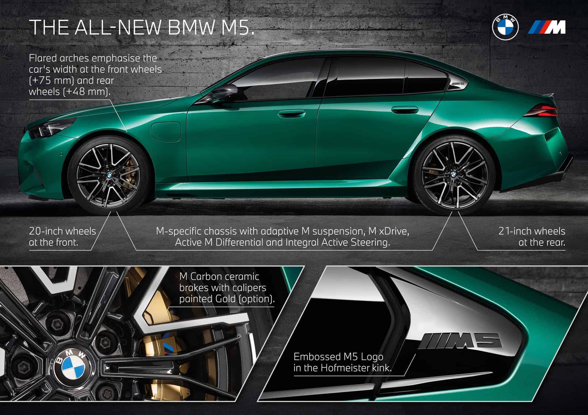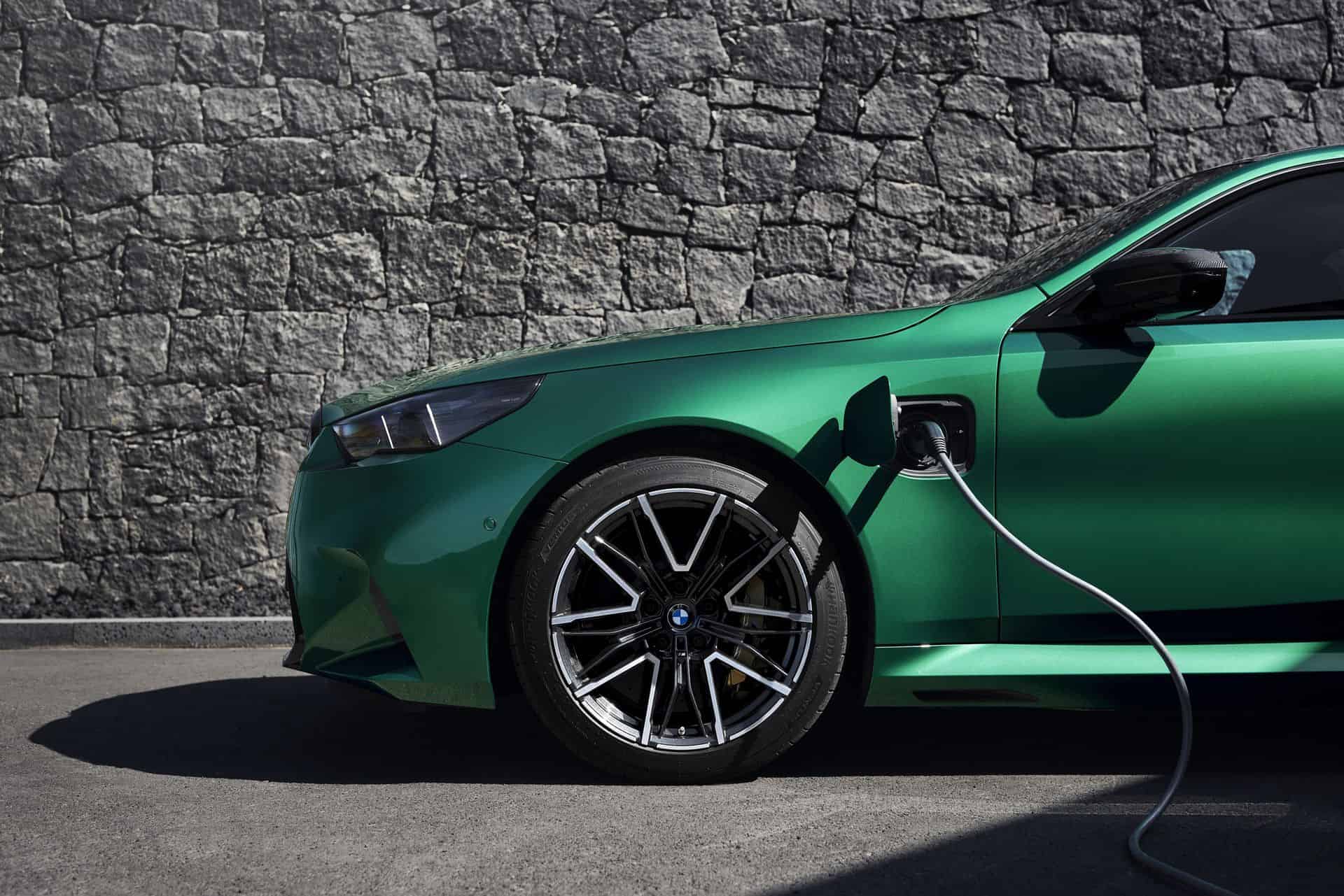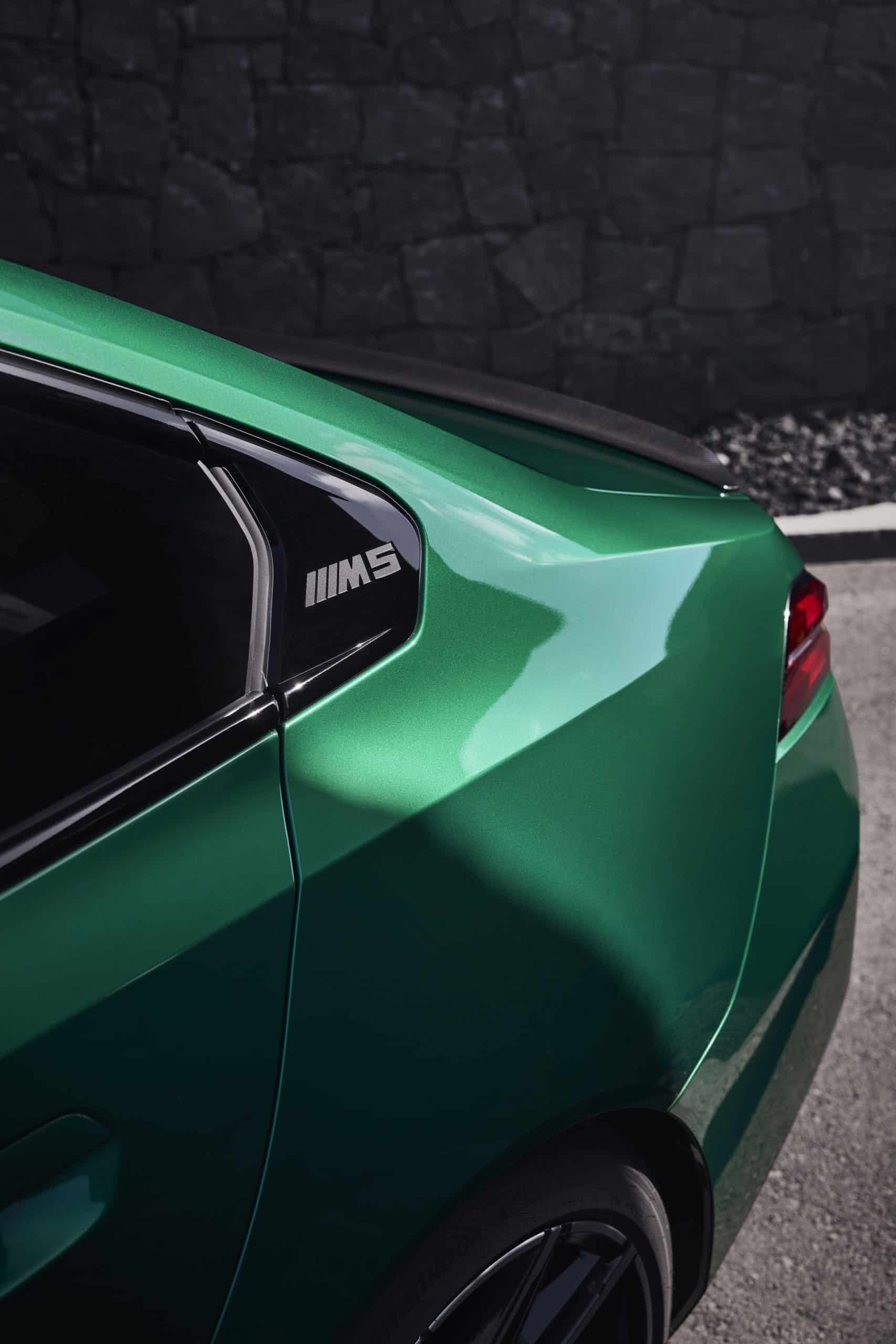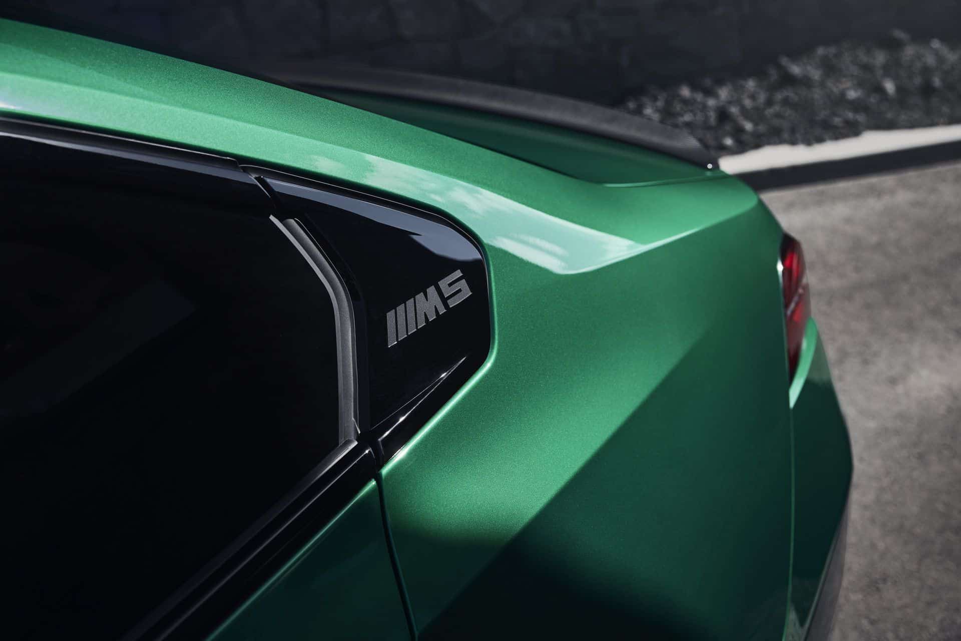 The body sides, including the front and rear wheel arches, have been entirely redesigned exclusively for the 2025 BMW M5. This redesign has led to an increase in width—3 inches at the front wheels and 1.9 inches at the rear—compared to the standard BMW 5 Series. As a result, no additional flares on the wheel arches are necessary to accommodate the wider tires.