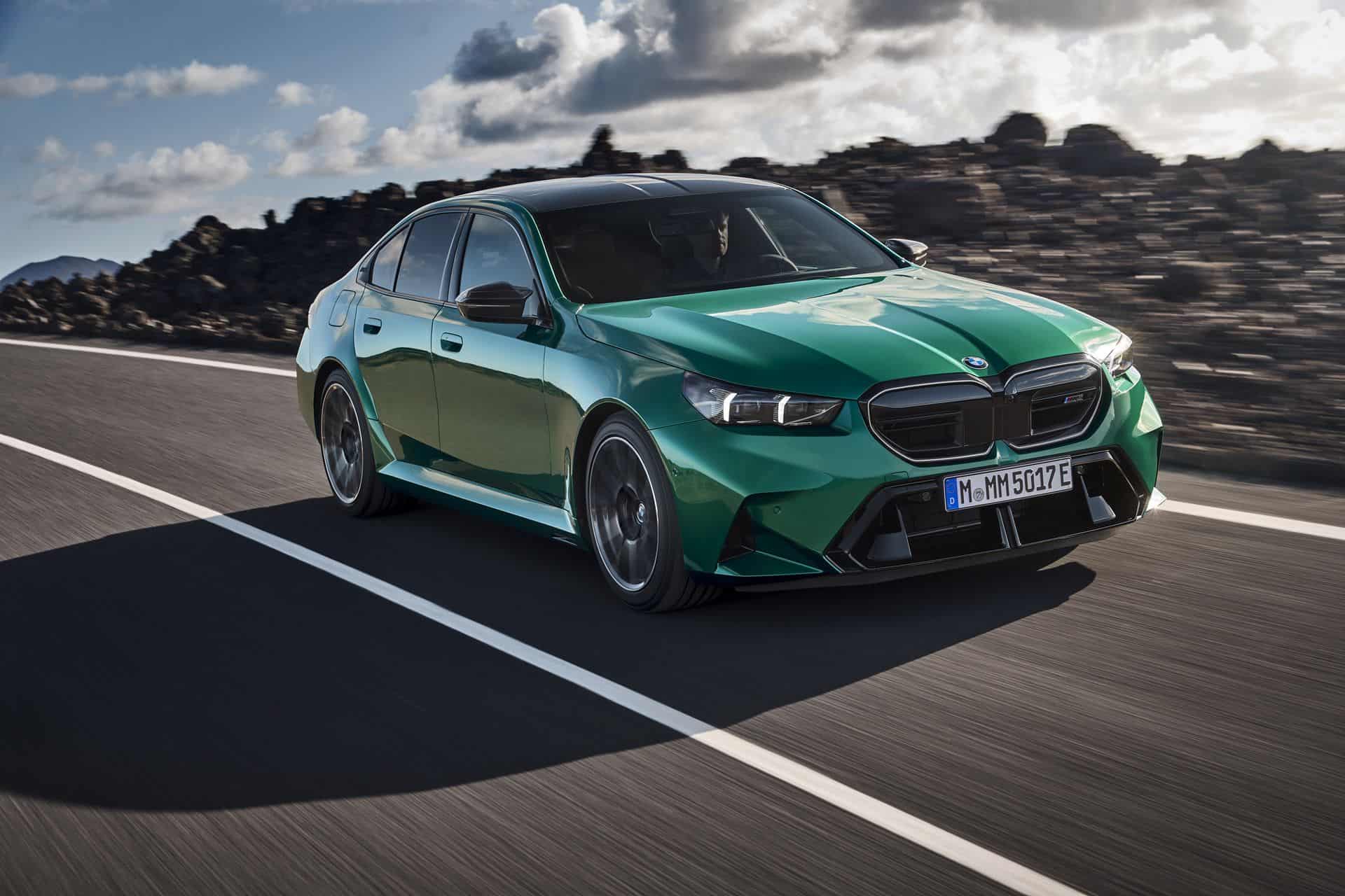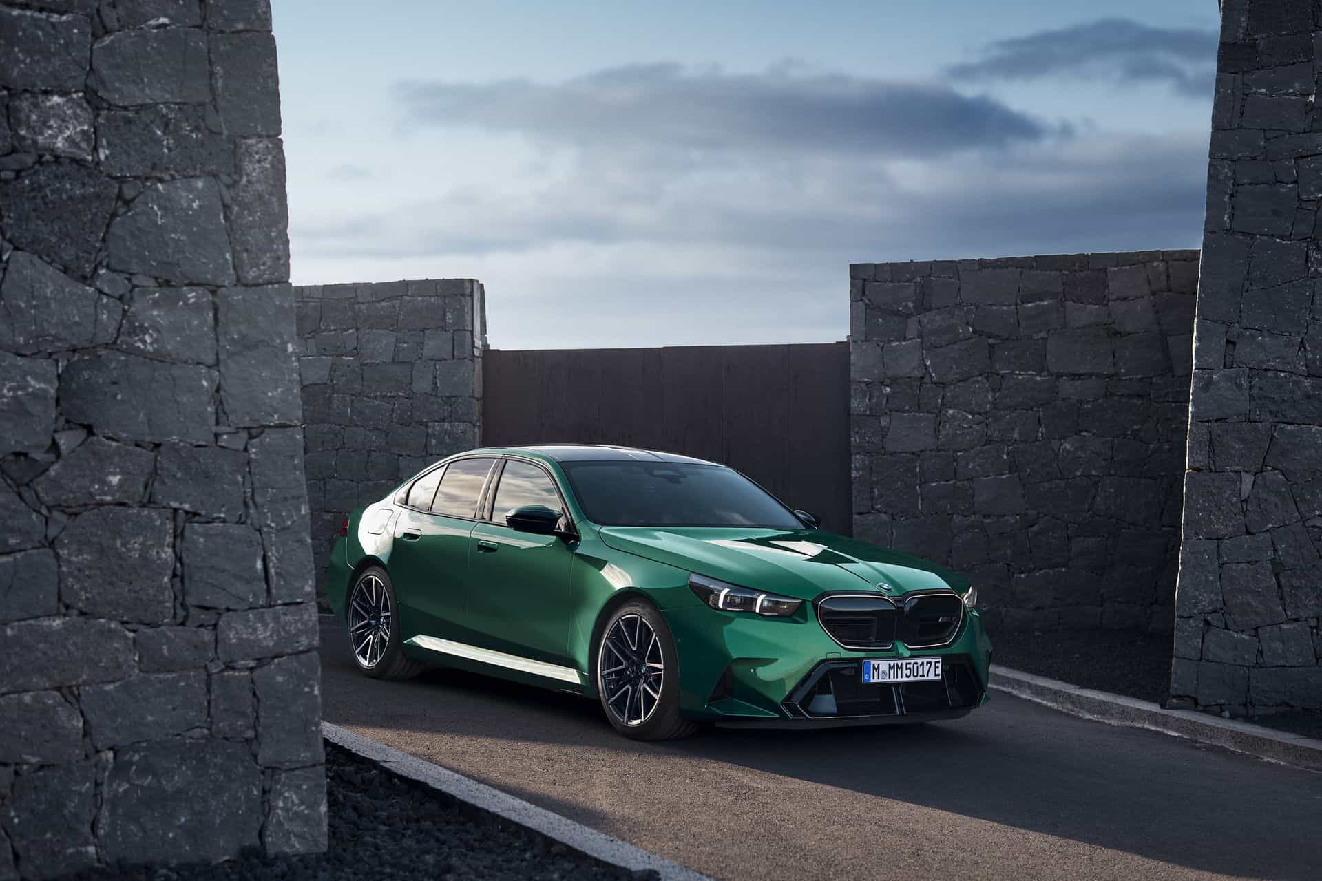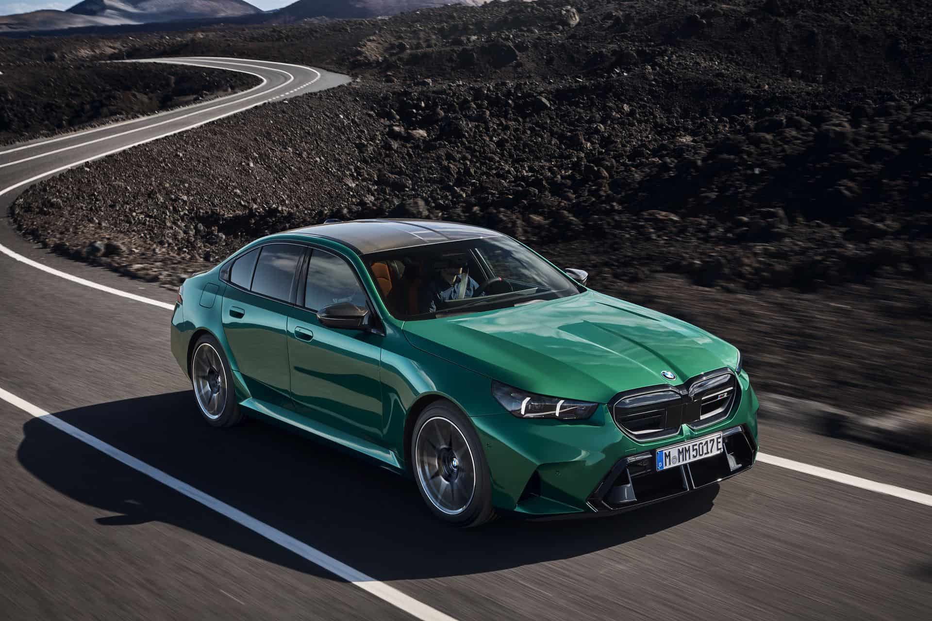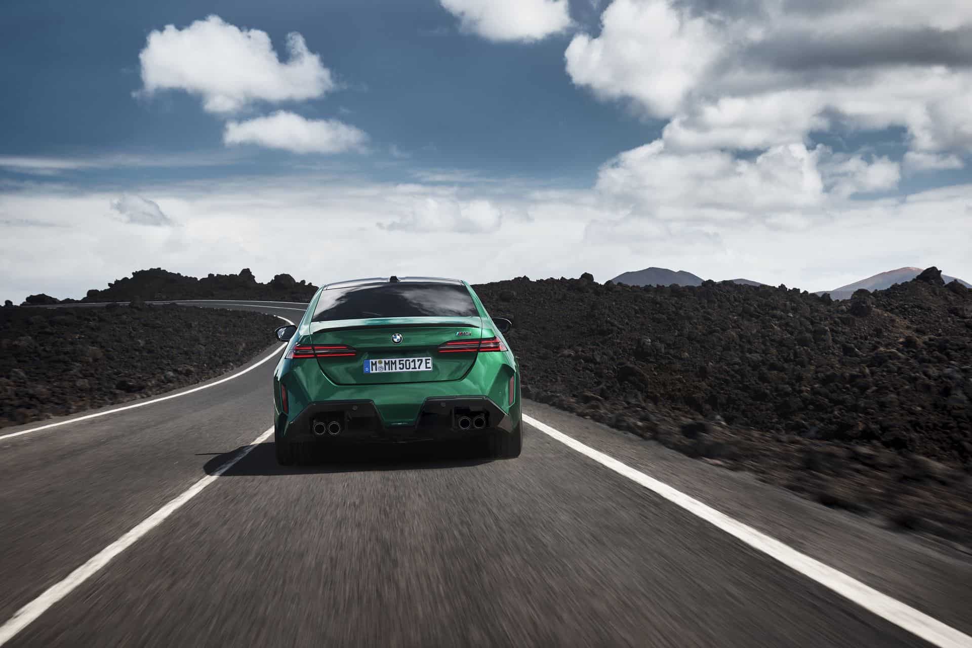 The body sides, including the front and rear wheel arches, have been entirely redesigned exclusively for the 2025 BMW M5. This redesign has led to an increase in width—3 inches at the front wheels and 1.9 inches at the rear—compared to the standard BMW 5 Series. As a result, no additional flares on the wheel arches are necessary to accommodate the wider tires.