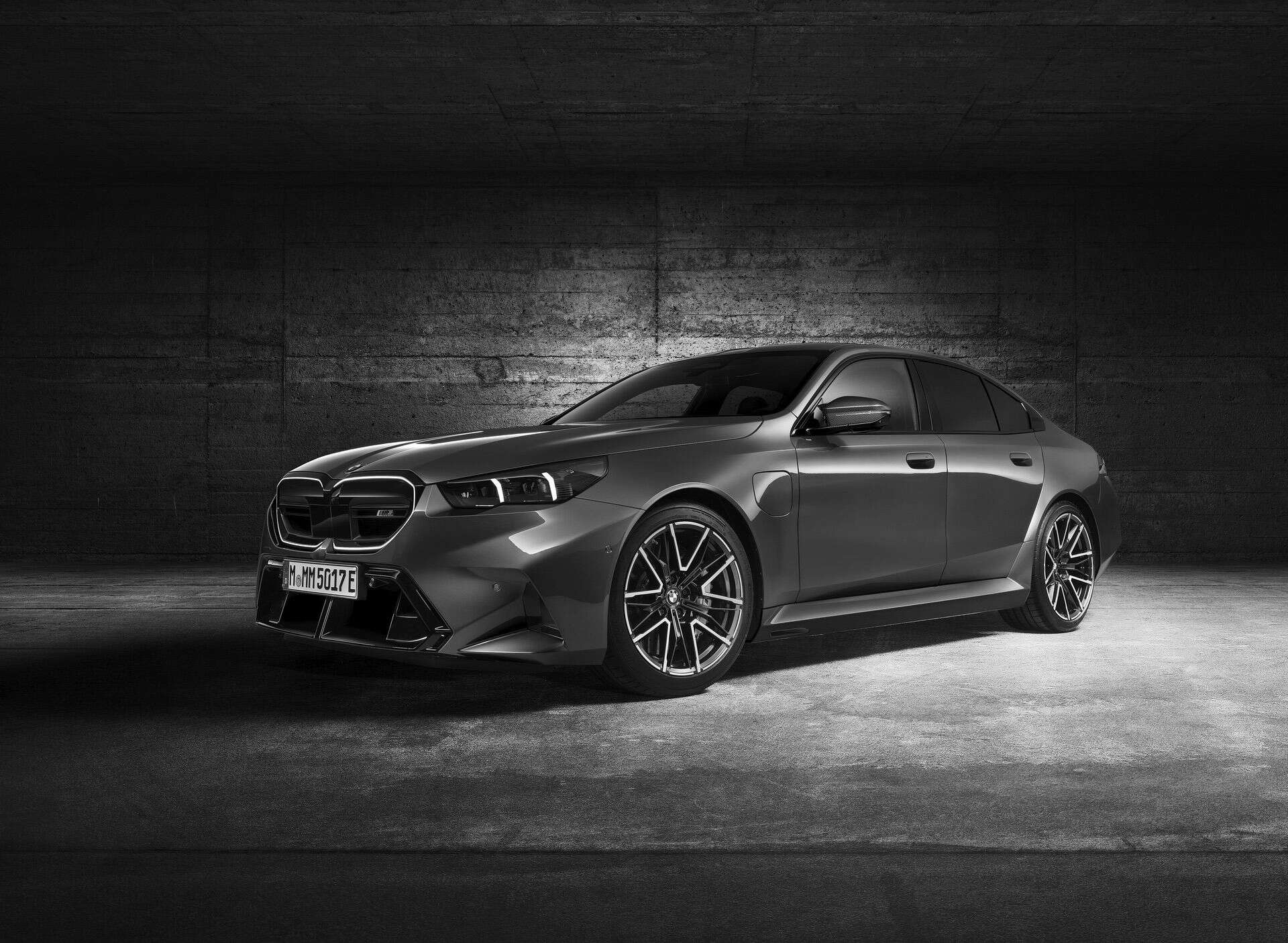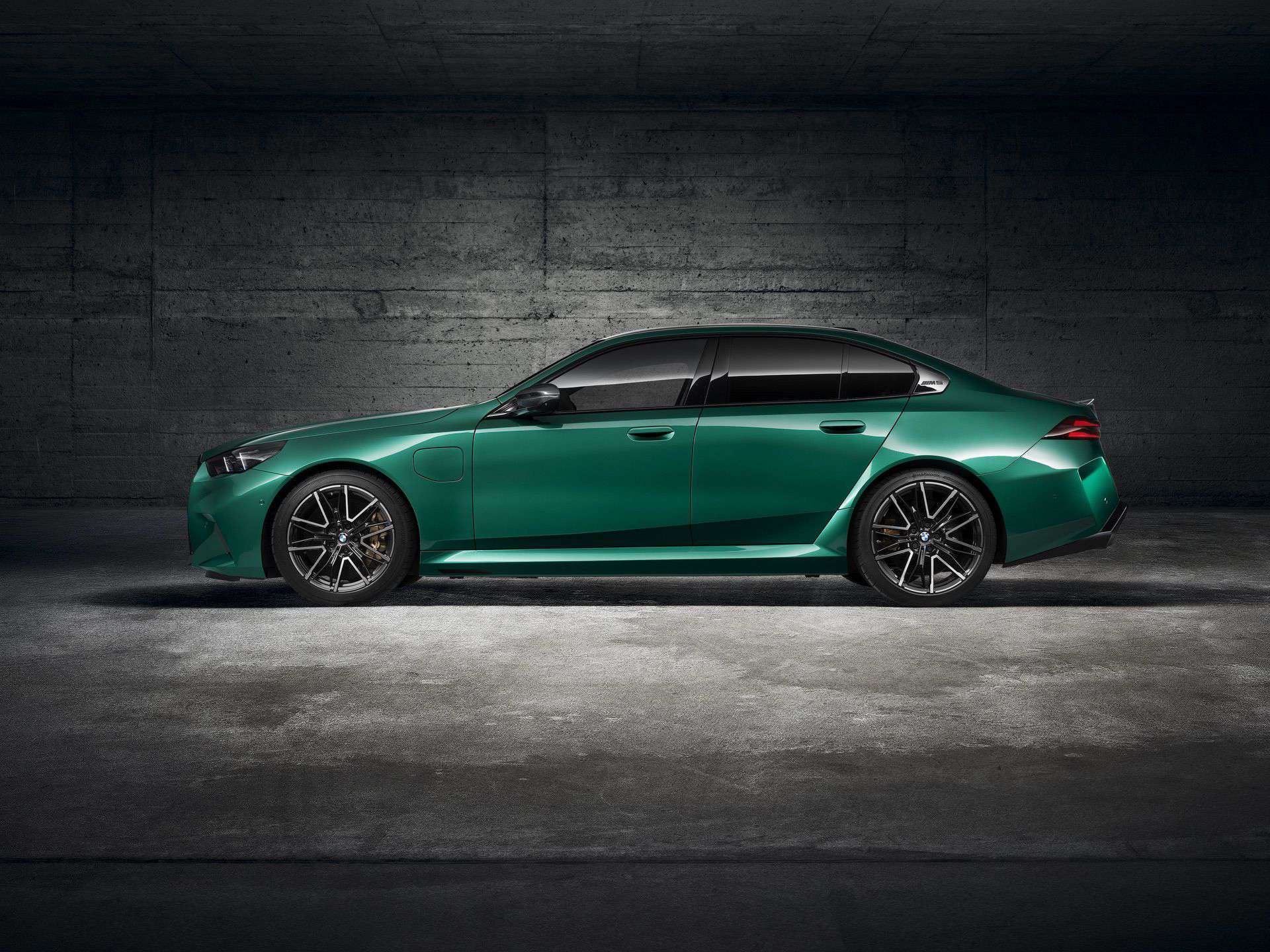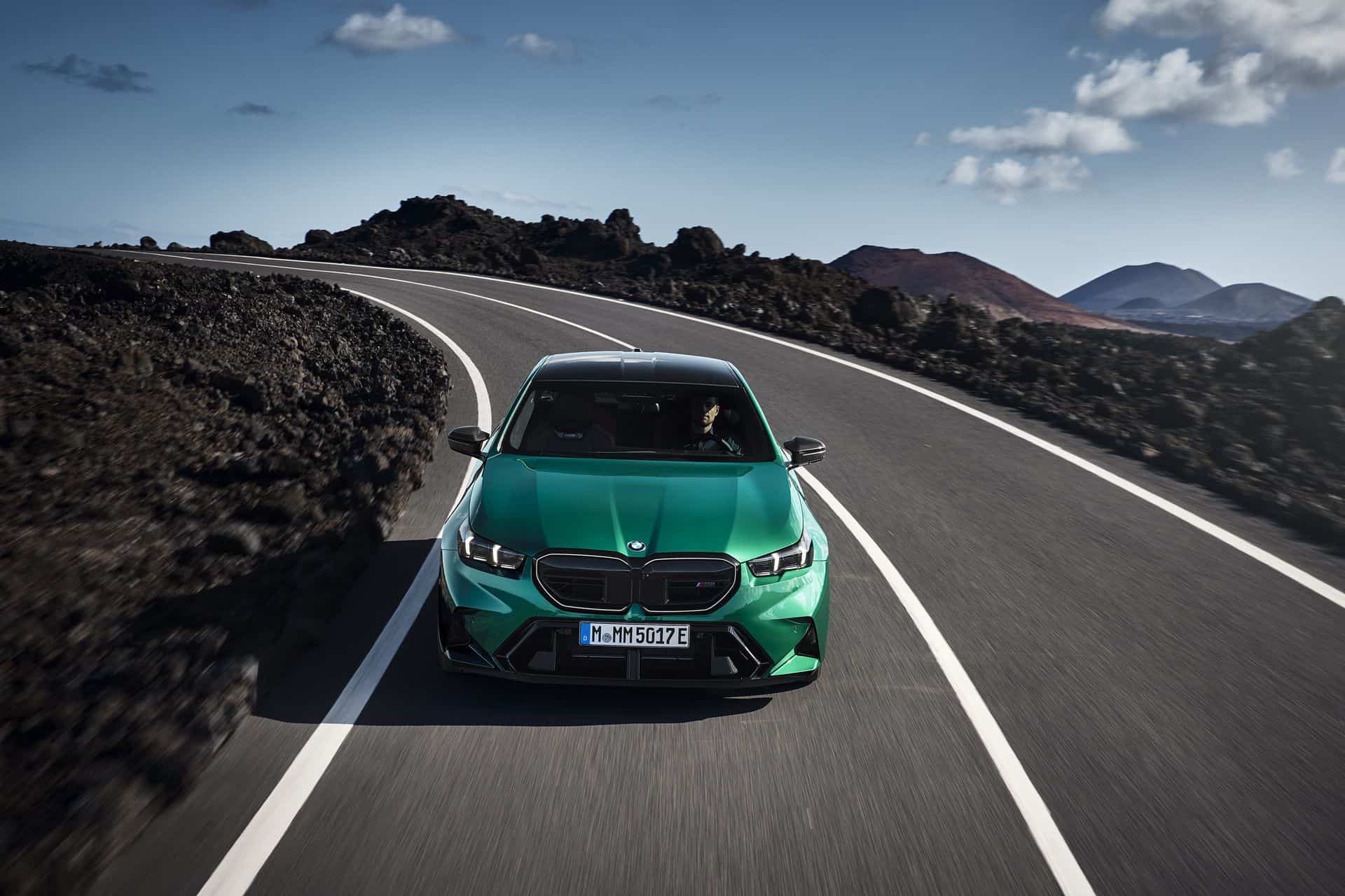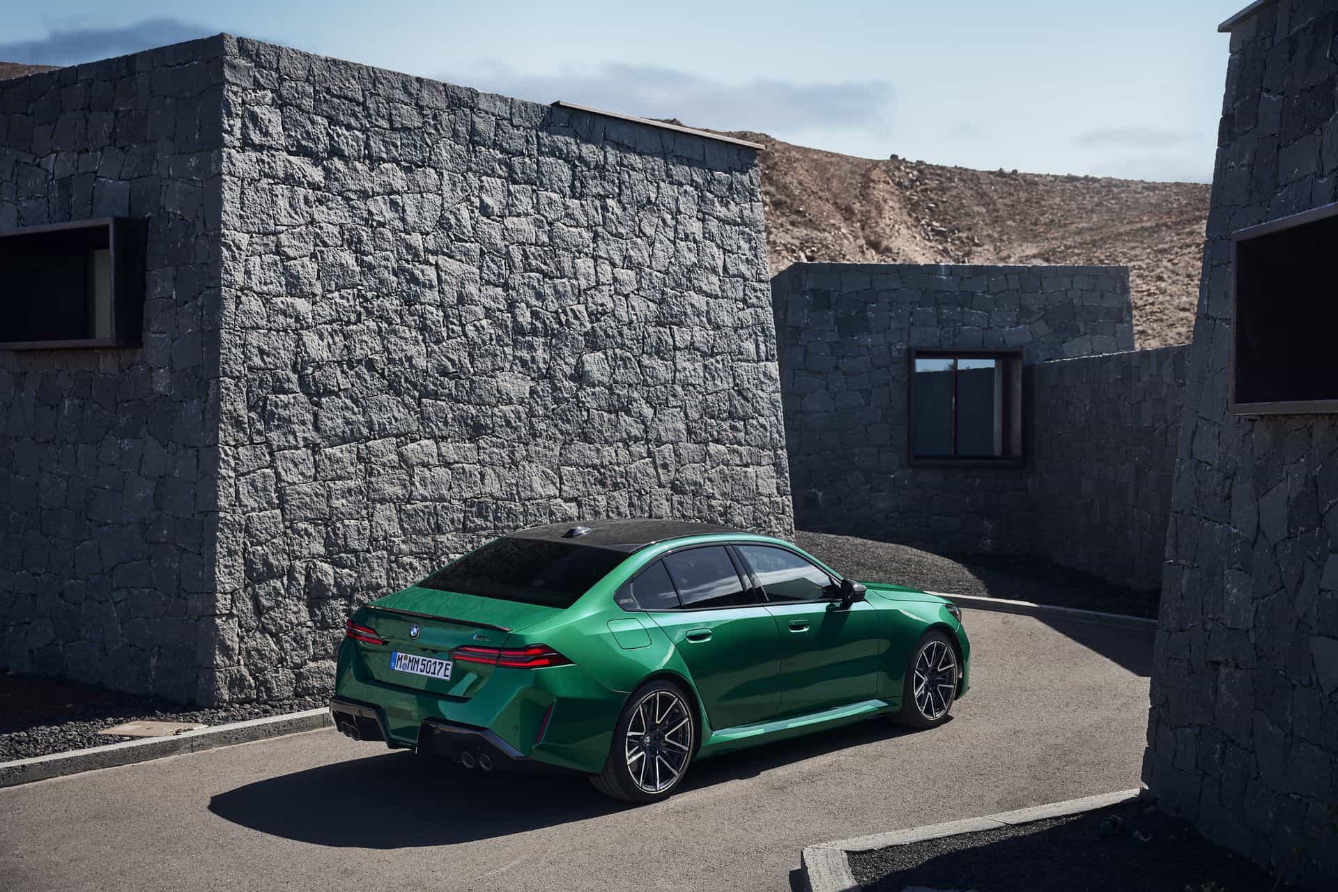 The body sides, including the front and rear wheel arches, have been entirely redesigned exclusively for the 2025 BMW M5. This redesign has led to an increase in width—3 inches at the front wheels and 1.9 inches at the rear—compared to the standard BMW 5 Series. As a result, no additional flares on the wheel arches are necessary to accommodate the wider tires.