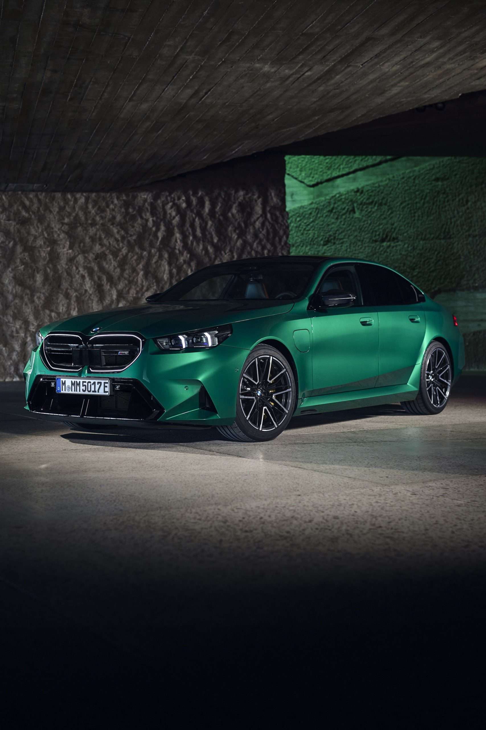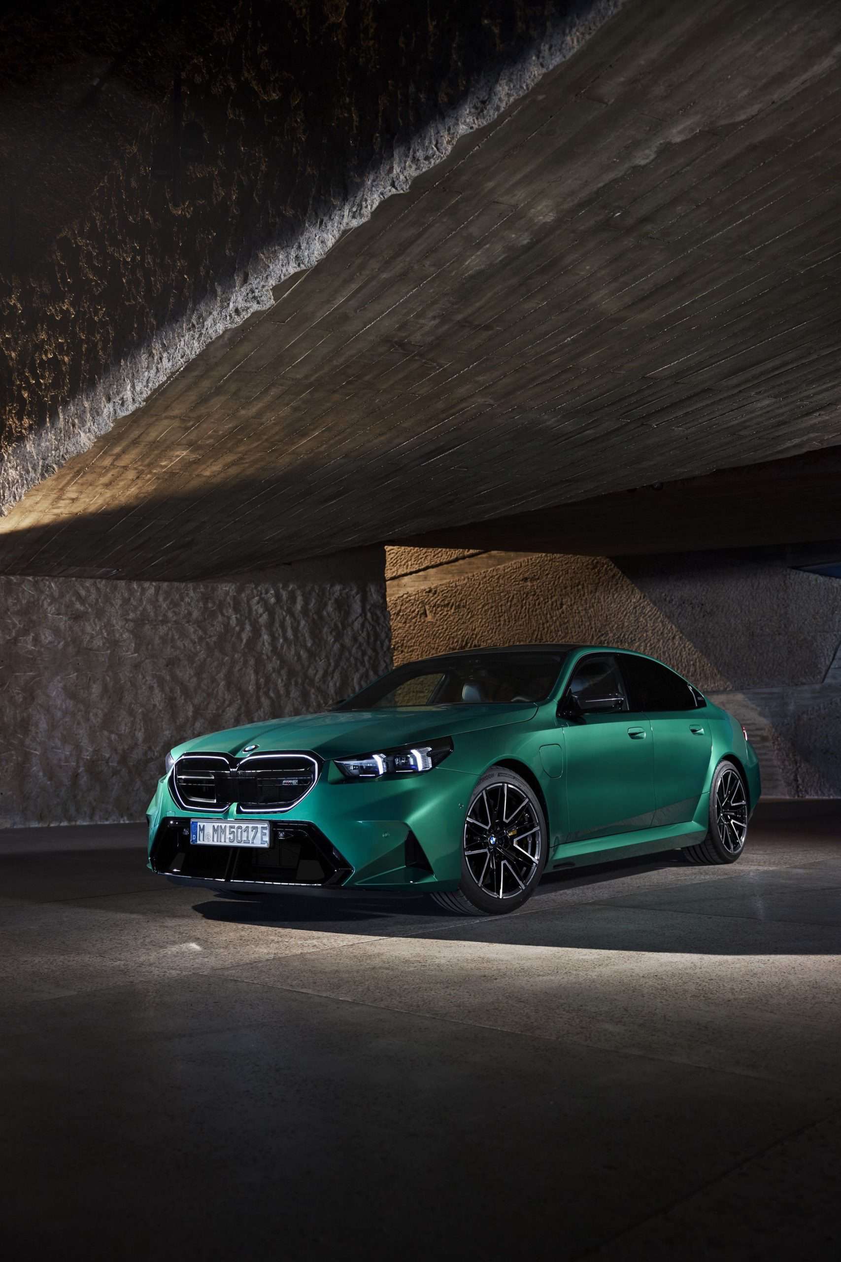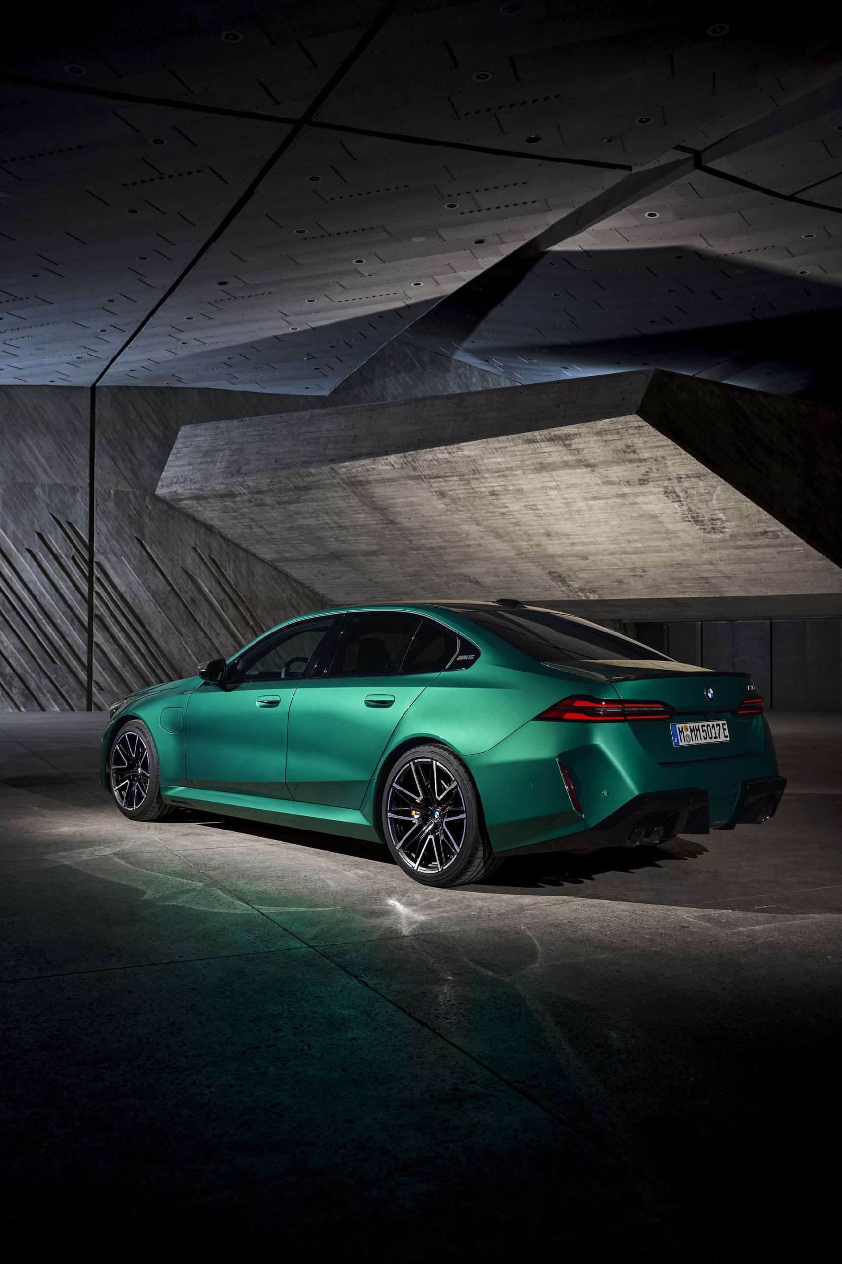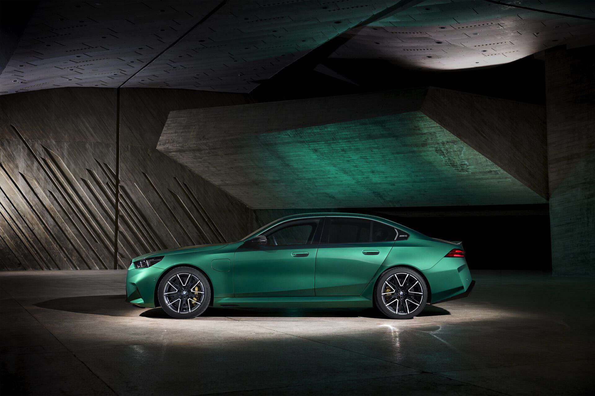 The body sides, including the front and rear wheel arches, have been entirely redesigned exclusively for the 2025 BMW M5. This redesign has led to an increase in width—3 inches at the front wheels and 1.9 inches at the rear—compared to the standard BMW 5 Series. As a result, no additional flares on the wheel arches are necessary to accommodate the wider tires.