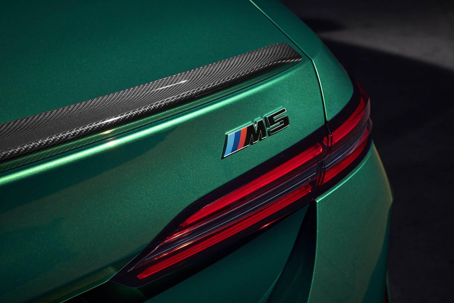 The new BMW M5 features standard interior trim elements in Aluminum Rhombicle. Optional trims include M Carbon Fiber with high-gloss silver threads and BMW Individual Dark Oak high-gloss fine-wood trim. All interior trim variants are accented with Dark Silver. BMW will fit the new G90 M5 with the latest iDrive 8.5 Operating System. The new BMW M5 includes a standard welcome scenario with orchestrated exterior and interior lights, ending with an M-specific Welcome Light Carpet projected onto the ground. The Goodbye Animation gradually dims the interior lighting.
