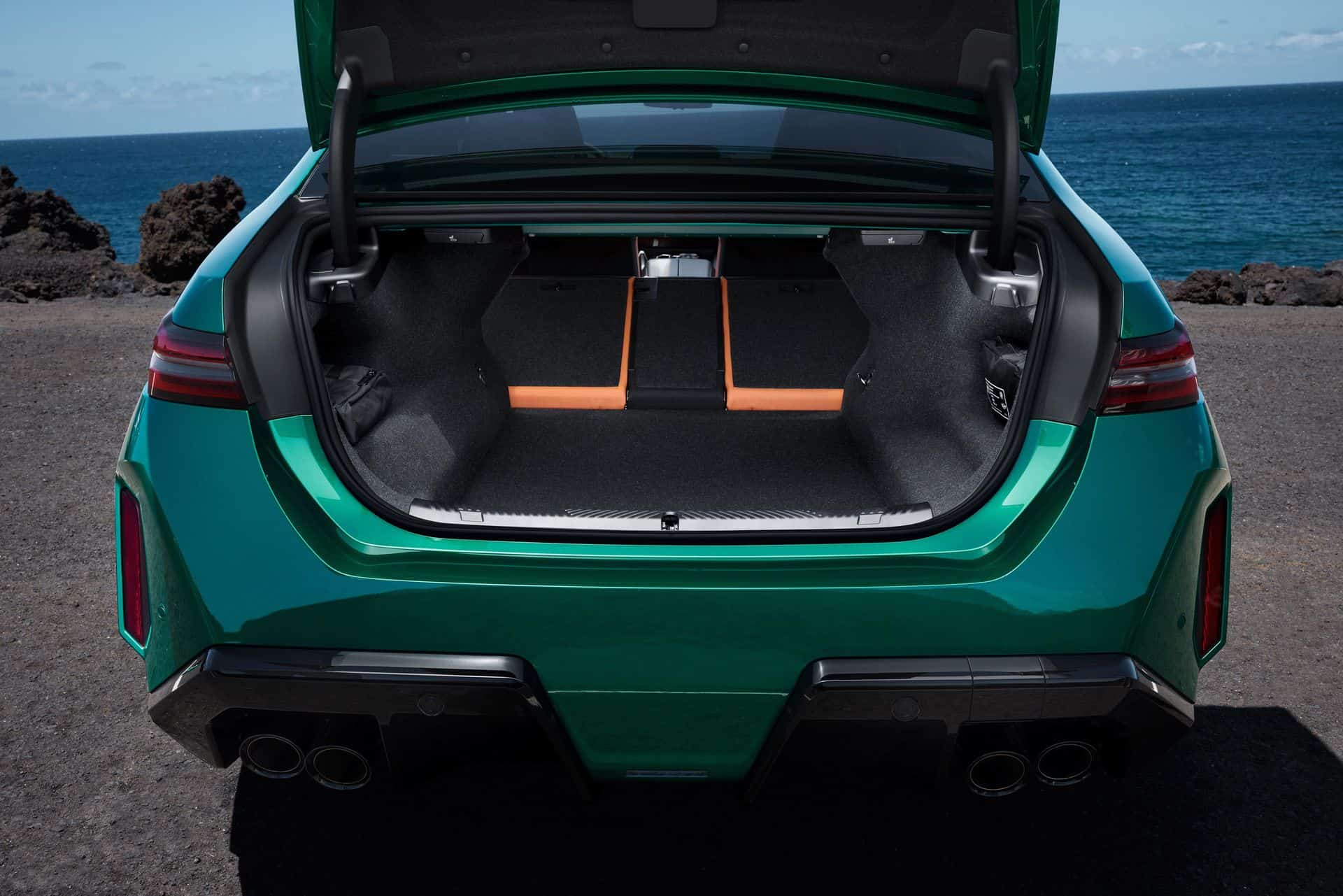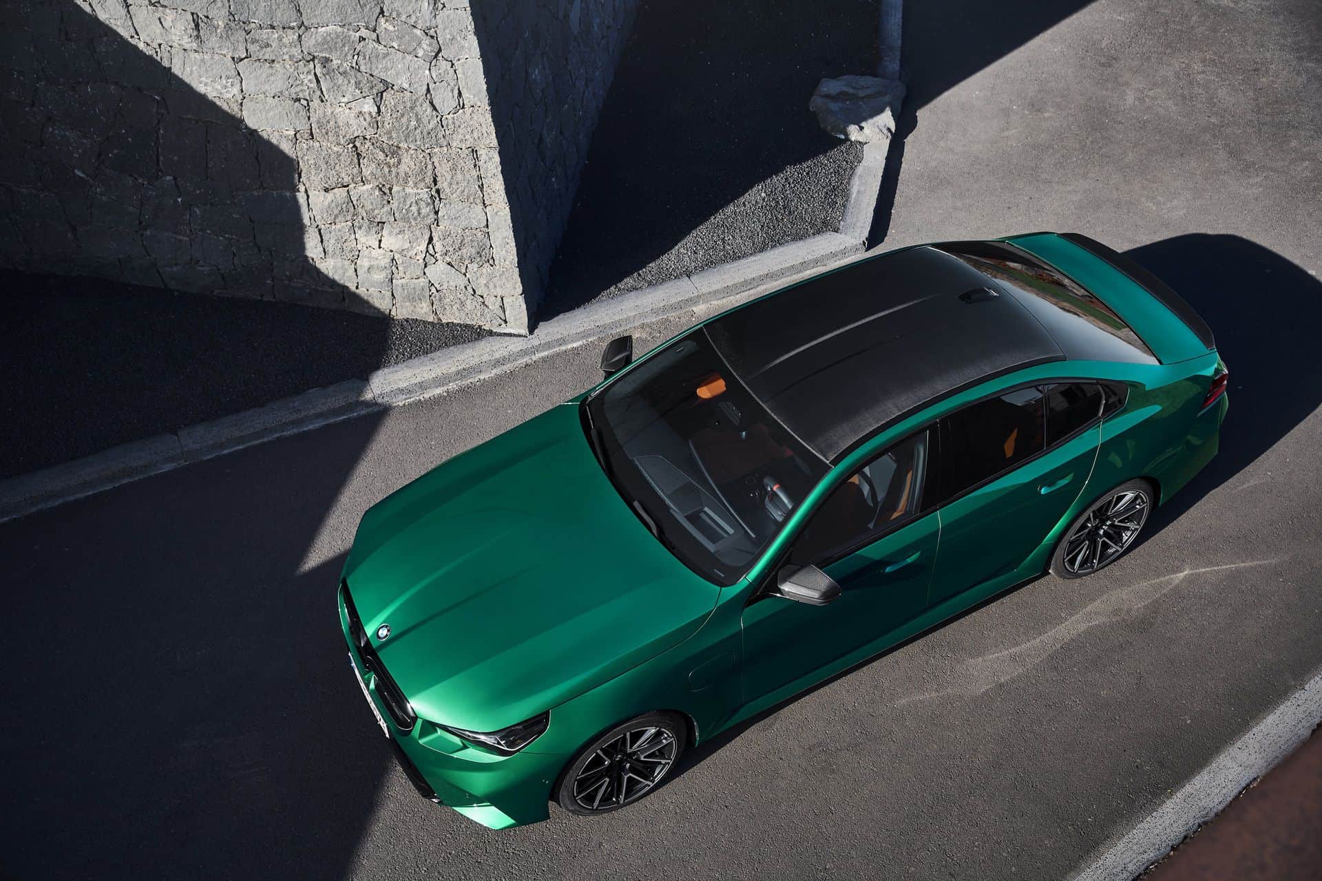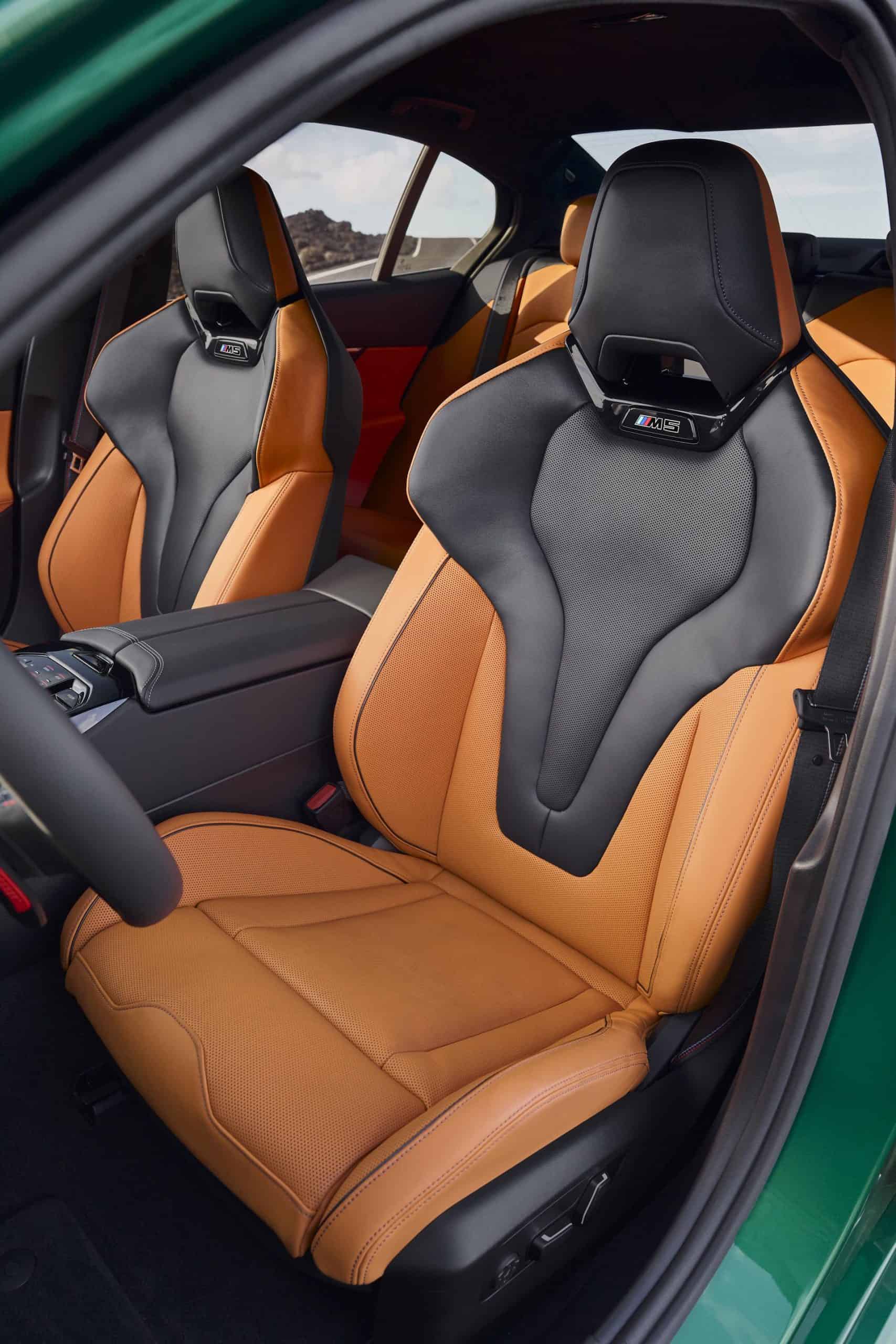 If you don’t want the carbon roof, BMW mounts a panoramic glass roof as standard, complete with an electrically sliding roller blind. Elsewhere, the Full Merino Metallic leather trim is making its debut on the M5 and comes with a bi-color finish. Customers have the option to equip the standard M Multifunction Seats with Extended Merino Leather in one of four shades: Black, Silverstone/Black bi-color, Red/Black bi-color, and Kyalami Orange/Black bi-color. However, this Black/Dark Violet or Taupe Grey/Deep Lagoon Pearl Effect upholstery won’t be available until next spring.