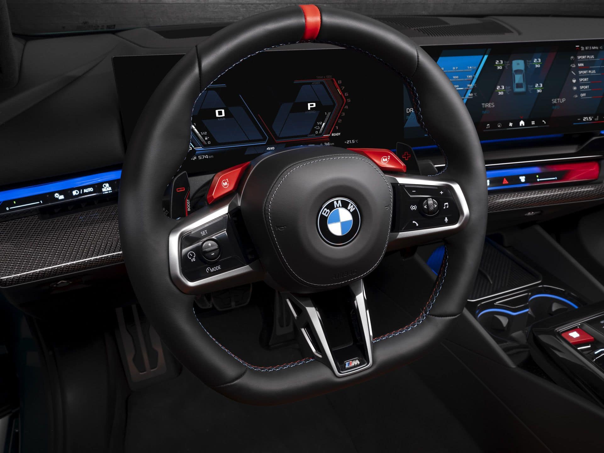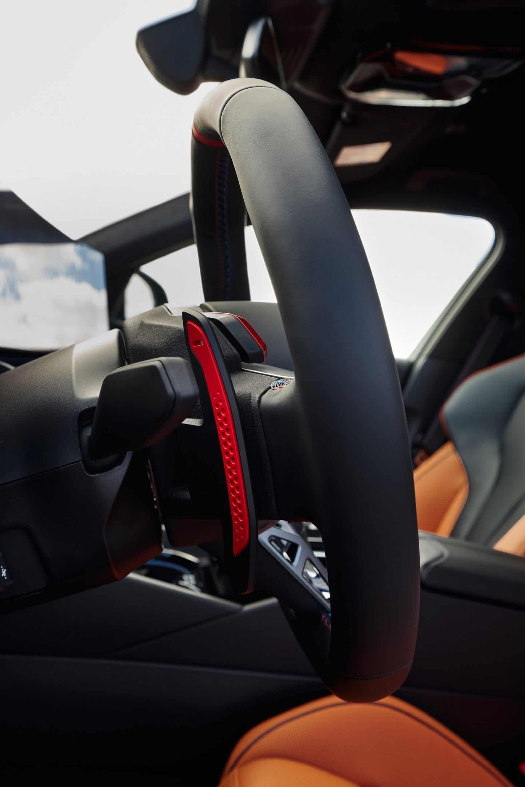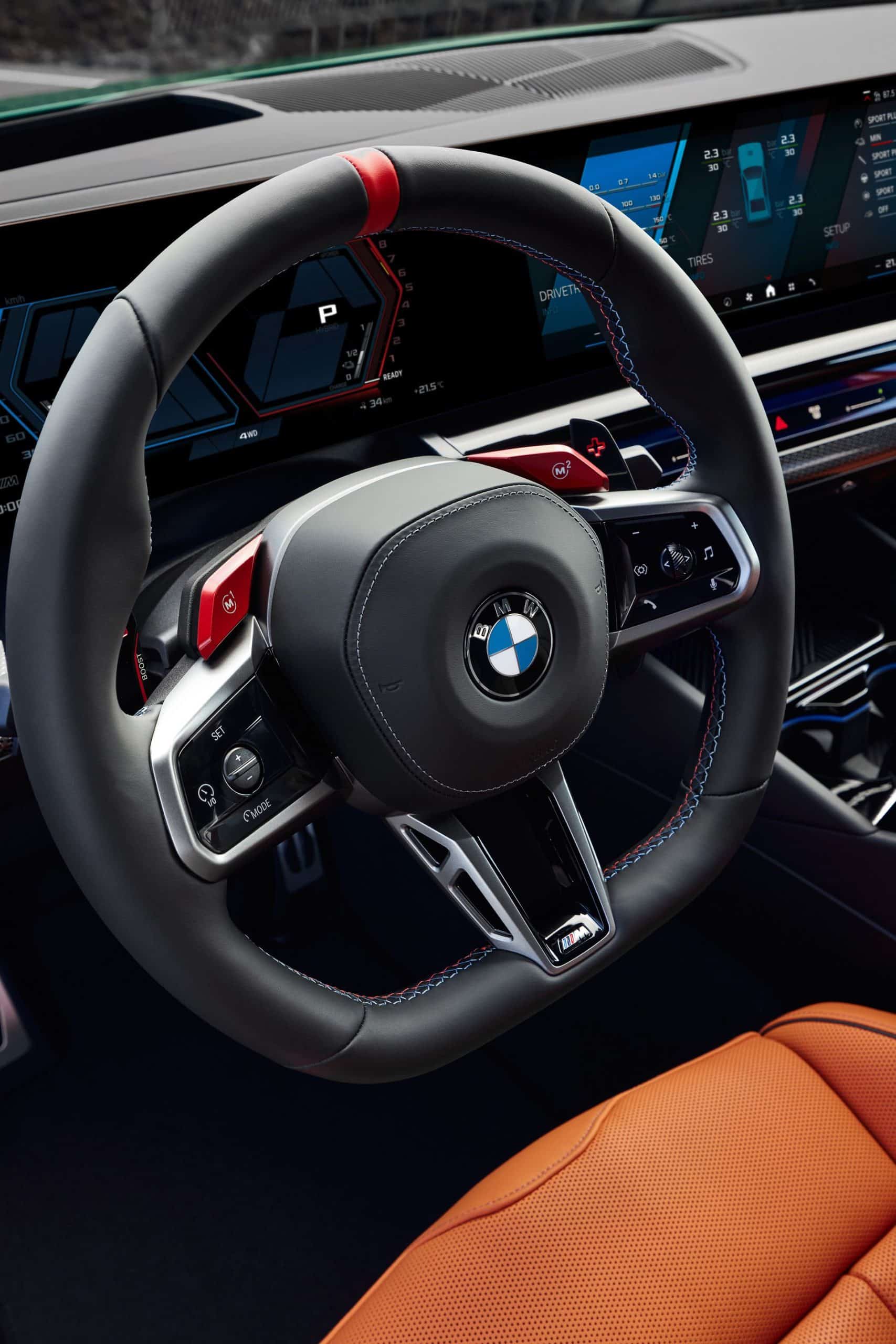 Inside, BMW spruced up the cabin compared to a mundane 5 Series by installing a flat-bottomed steering wheel. Wrapped in leather and featuring decorative stitching in the M colors, the wheel also has a red 12 o’clock mark. The shift paddles we mentioned earlier have a new design, and so does the small gear selector replacing the bulky lever of the “F90.”