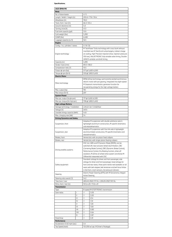 By combining a twin-turbo, 4.4-liter gas engine with an electric motor, BMW M obtained a total system output of 717 horsepower and 738 pound-feet (1,000 Newton meters). A closer look at the specs sheet shows the “S68” (S68B44T0) combustion engine is good for 577 hp and 553 lb-ft (750 Nm). Its peak torque is available between 1,800 and 5,400 rpm. The engine delivers its maximum output from 5,600 to 6,500 rpm and has a rev limit of 7,200 rpm. Built into the eight-speed automatic transmission, the e-motor produces 194 hp and 207 lb-ft (280 Nm).