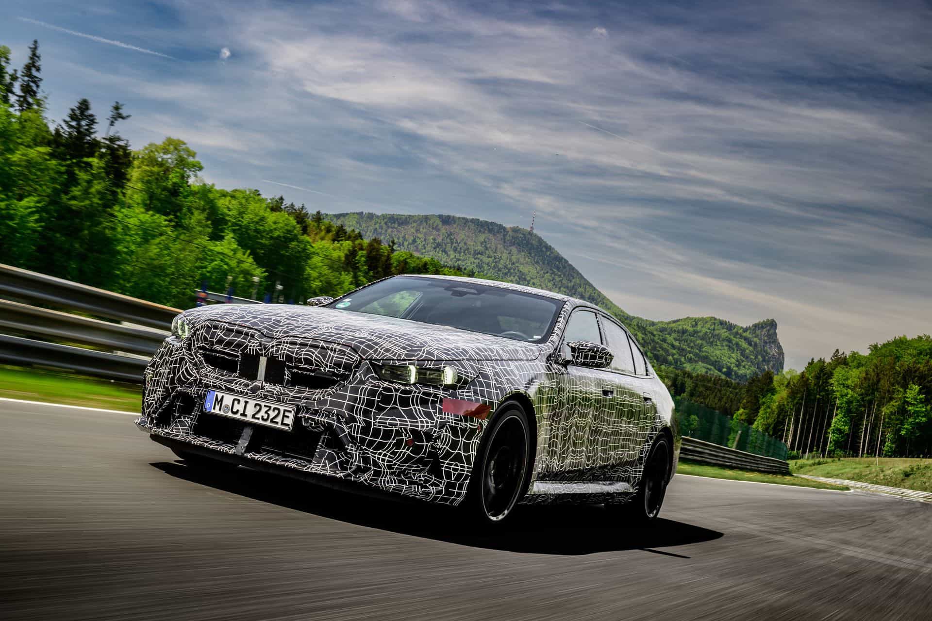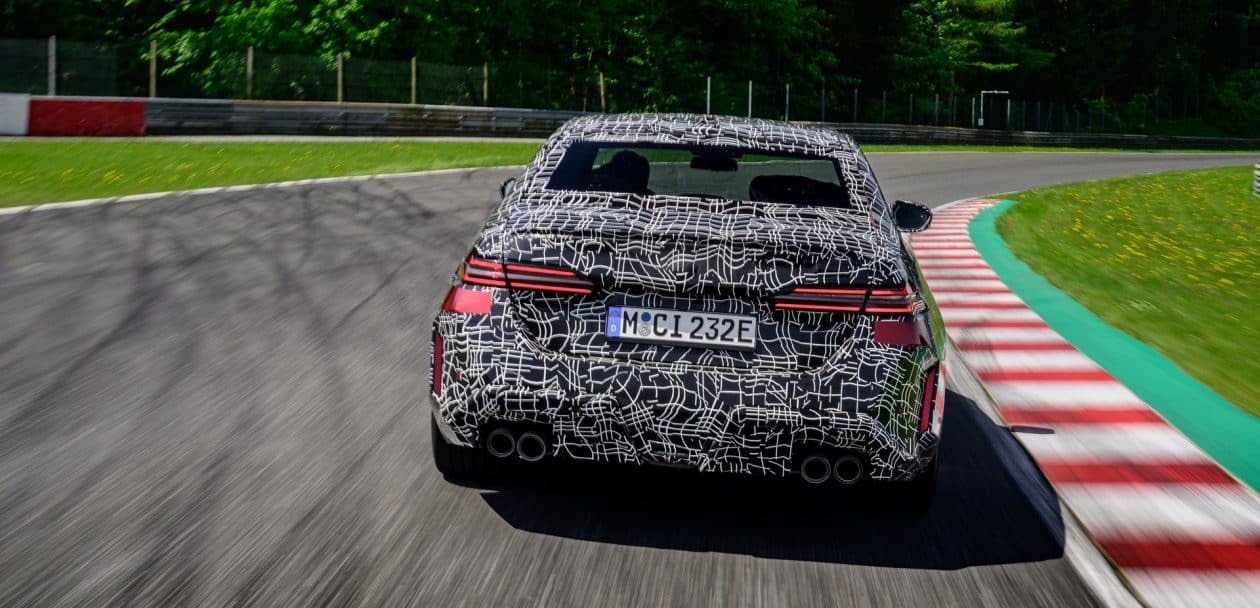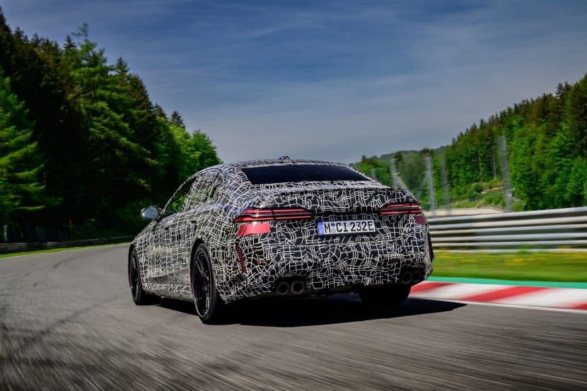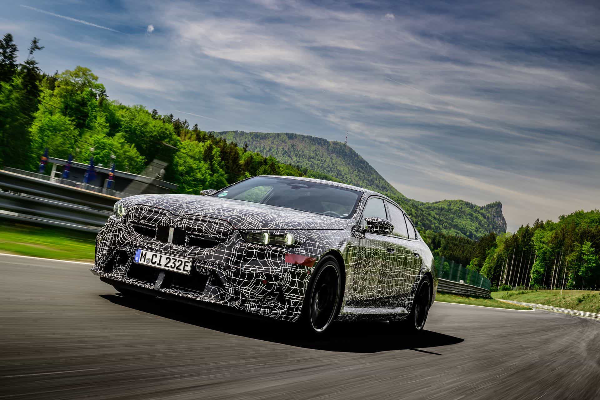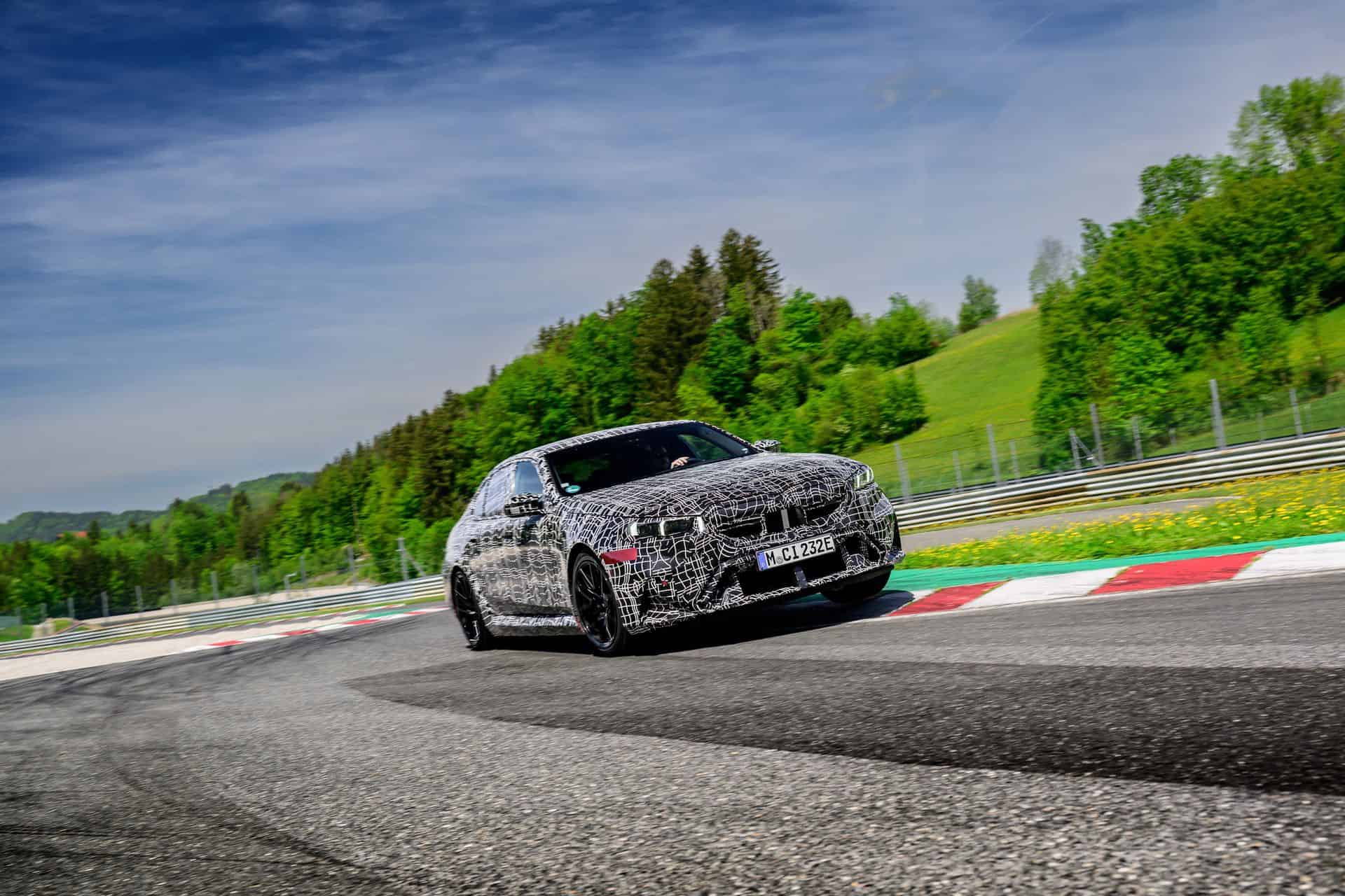 In May, BMW invited us to a track day at the iconic Salzburgring. At the time, the new M5 was still under wraps or hidden in a backroom where I had a chance to film it, but a camouflaged prototype was ready for us. The near-production-ready test mule featured the drivetrain we will see on the road this summer. By combining the S68 twin-turbo, 4.4-liter gas engine with an electric motor, the G90 M5 achieves a total system output of 717 horsepower and 738 pound-feet (1,000 Newton meters) of torque. The S68 combustion engine produces 577 hp and 553 lb-ft (750 Nm) of torque, with peak torque available between 1,800 and 5,400 rpm. The engine delivers its maximum output from 5,600 to 6,500 rpm and has a rev limit of 7,200 rpm. Built into the eight-speed automatic transmission, the e-motor generates 194 hp and 207 lb-ft (280 Nm) of torque.