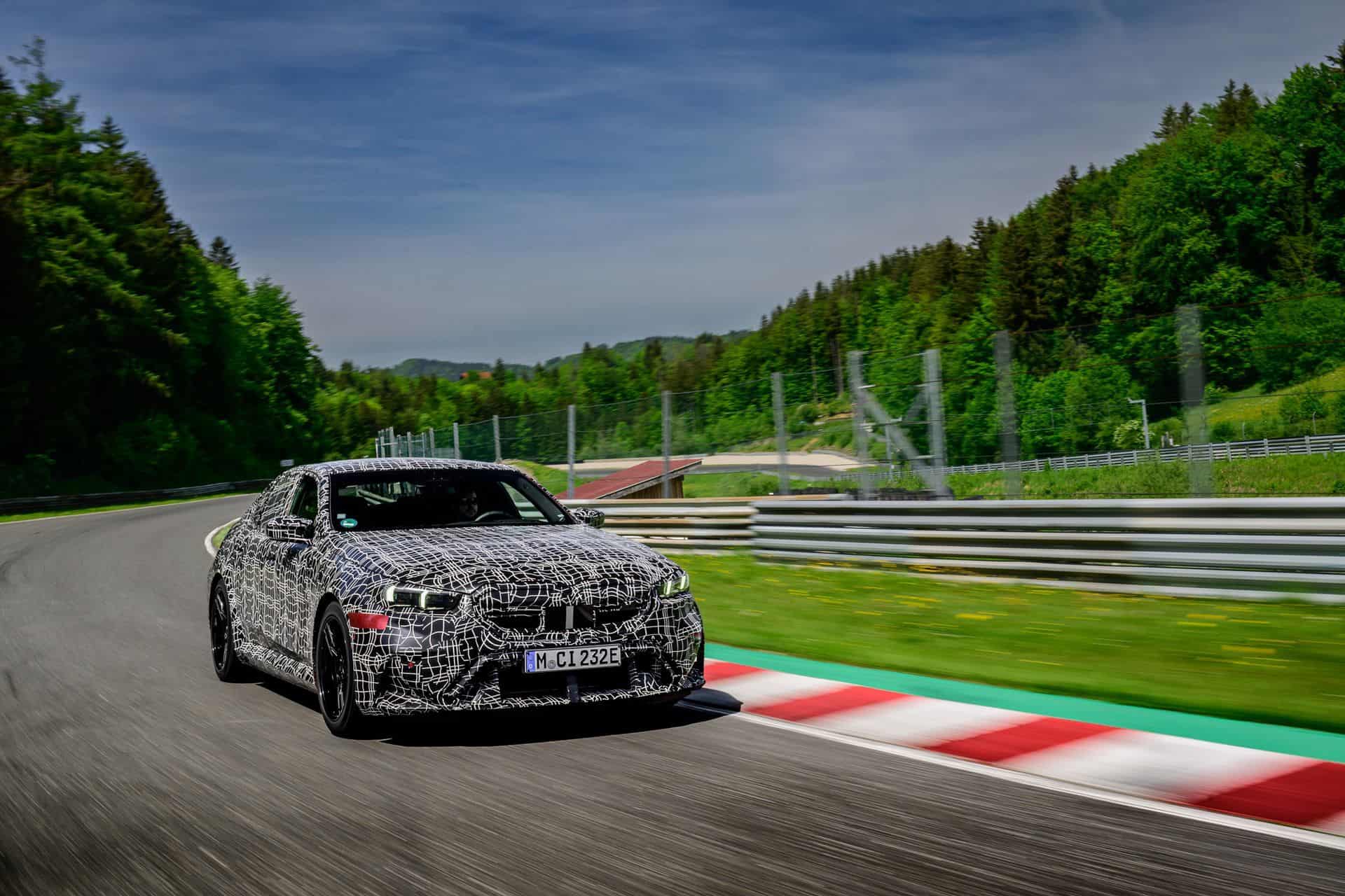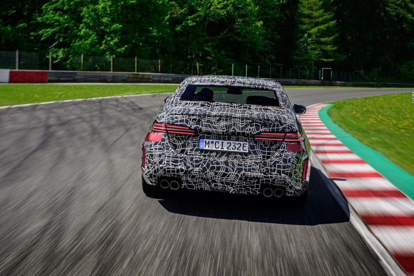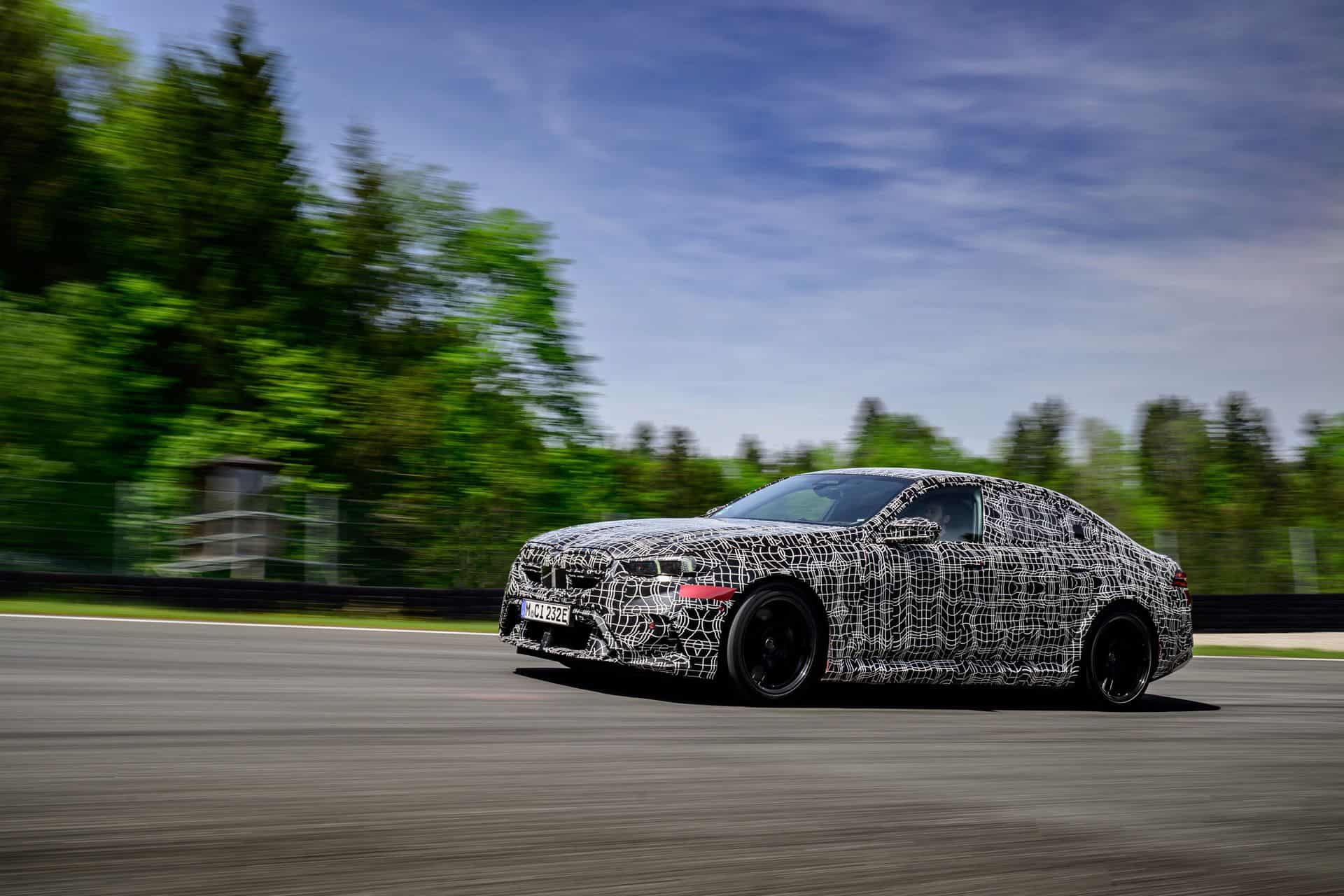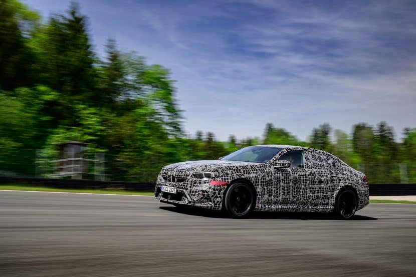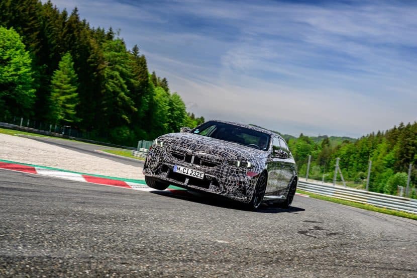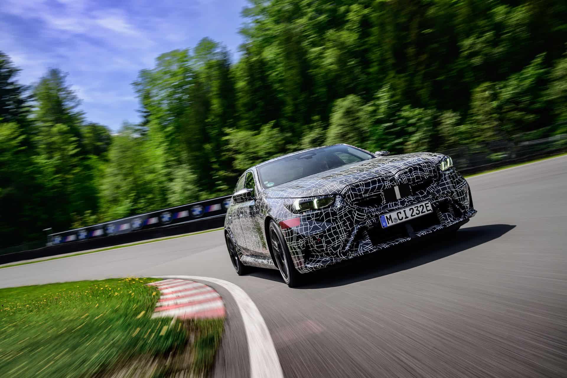 In May, BMW invited us to a track day at the iconic Salzburgring. At the time, the new M5 was still under wraps or hidden in a backroom where I had a chance to film it, but a camouflaged prototype was ready for us. The near-production-ready test mule featured the drivetrain we will see on the road this summer. By combining the S68 twin-turbo, 4.4-liter gas engine with an electric motor, the G90 M5 achieves a total system output of 717 horsepower and 738 pound-feet (1,000 Newton meters) of torque. The S68 combustion engine produces 577 hp and 553 lb-ft (750 Nm) of torque, with peak torque available between 1,800 and 5,400 rpm. The engine delivers its maximum output from 5,600 to 6,500 rpm and has a rev limit of 7,200 rpm. Built into the eight-speed automatic transmission, the e-motor generates 194 hp and 207 lb-ft (280 Nm) of torque.