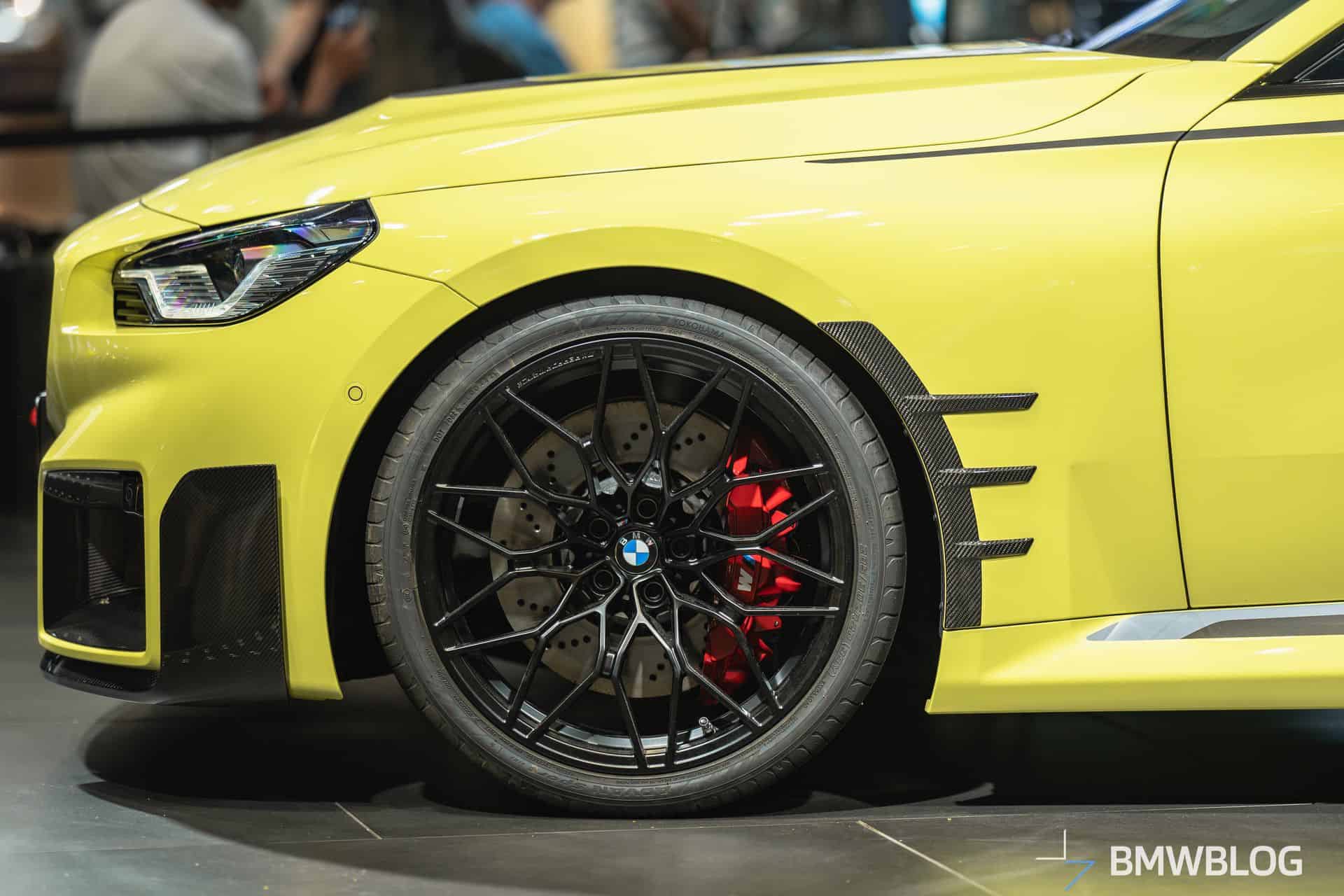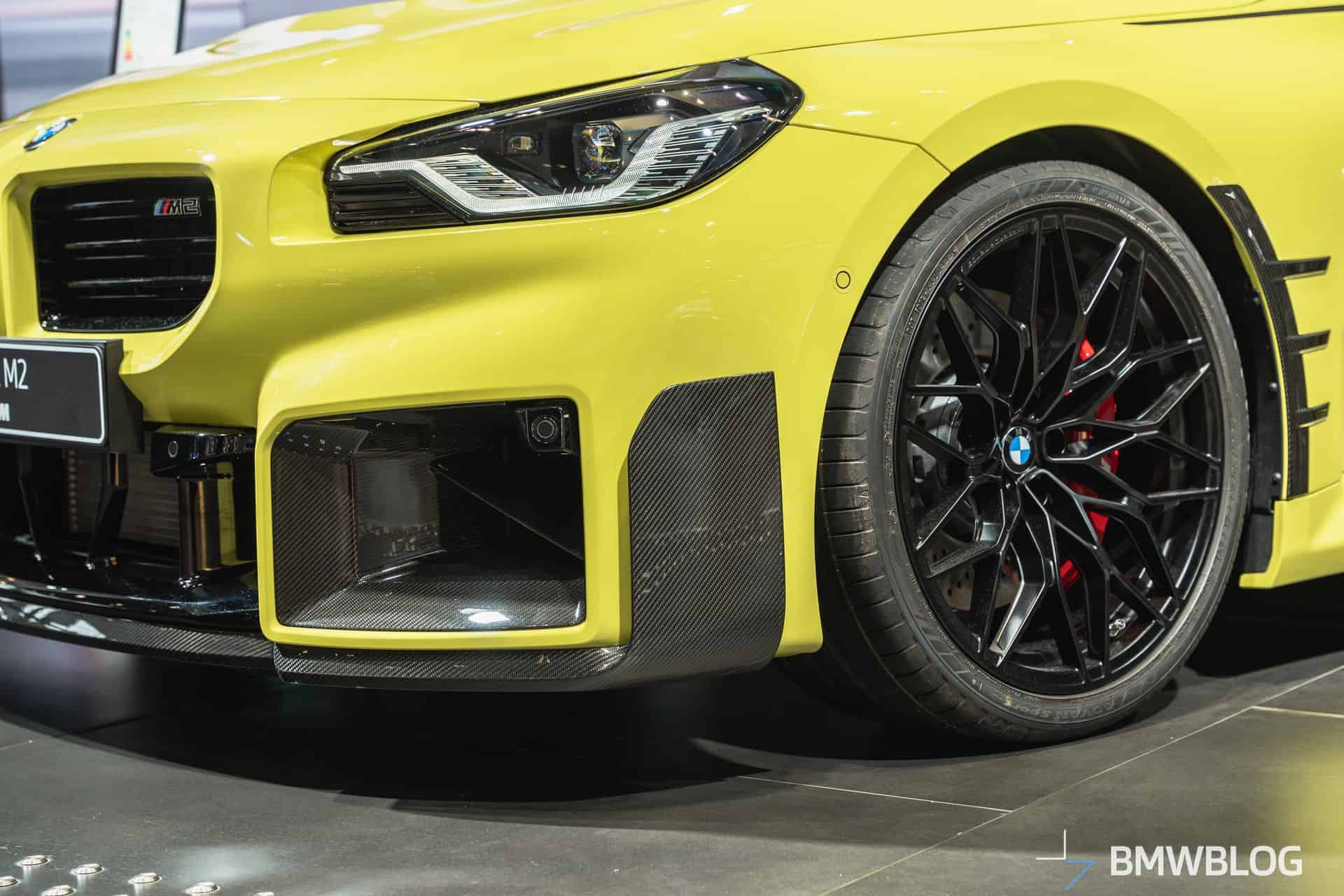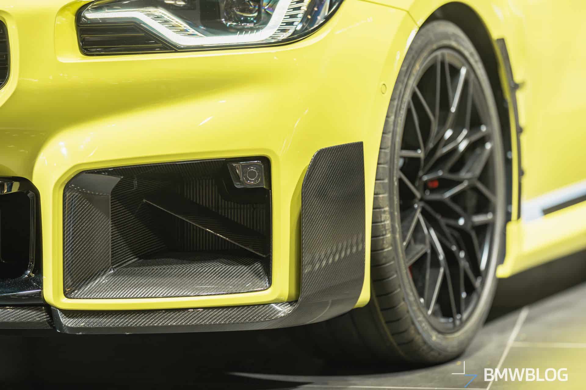 Photographed in Munich at the BMW Welt, the M2 facelift is brimming with optional items. It gets the side spats behind both front and rear wheels, along with side skirt attachments. All these extra goodies are made from carbon fiber, which is the same we can say about the front air intakes. The front also hosts a beefier splitter made from the same lightweight material.