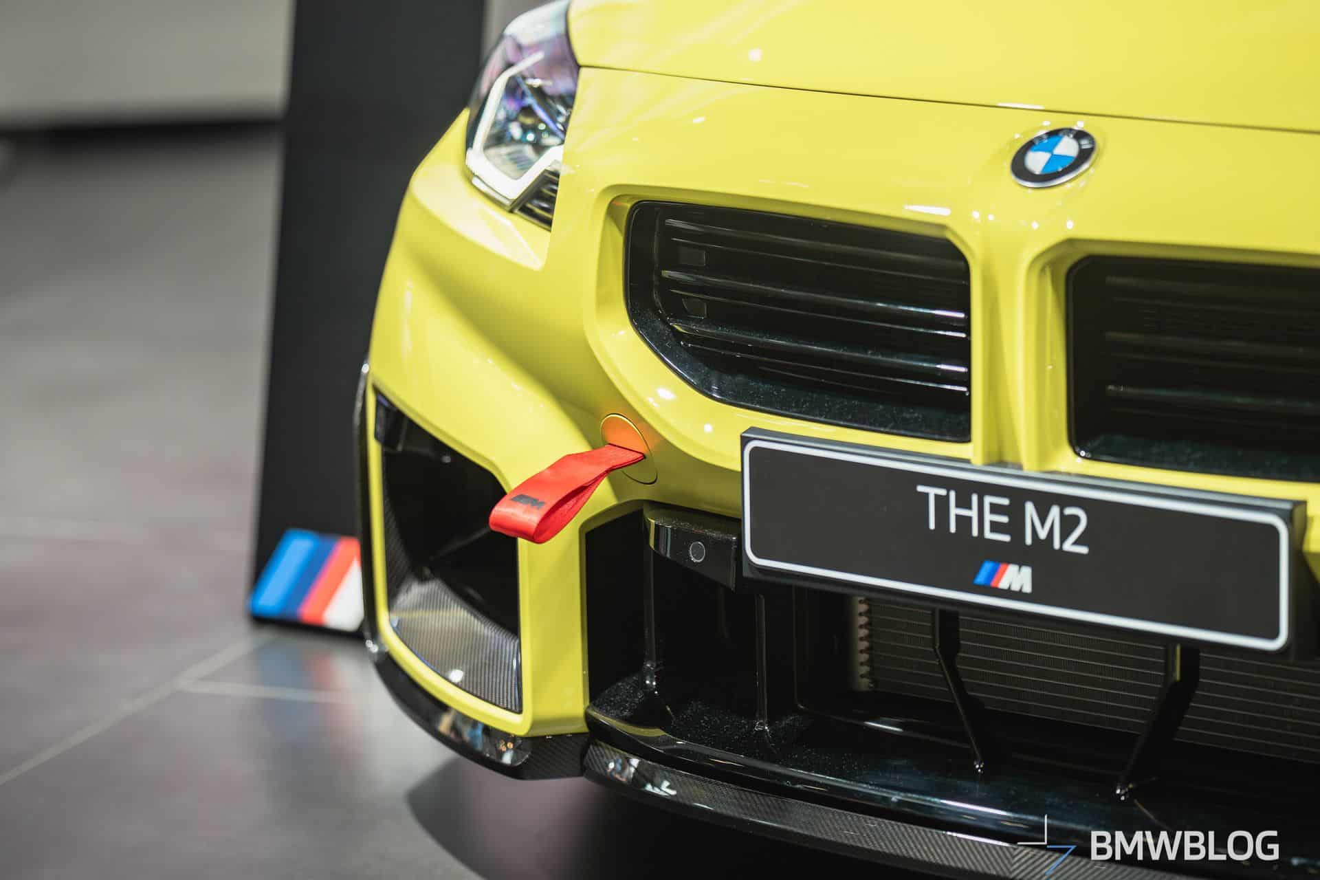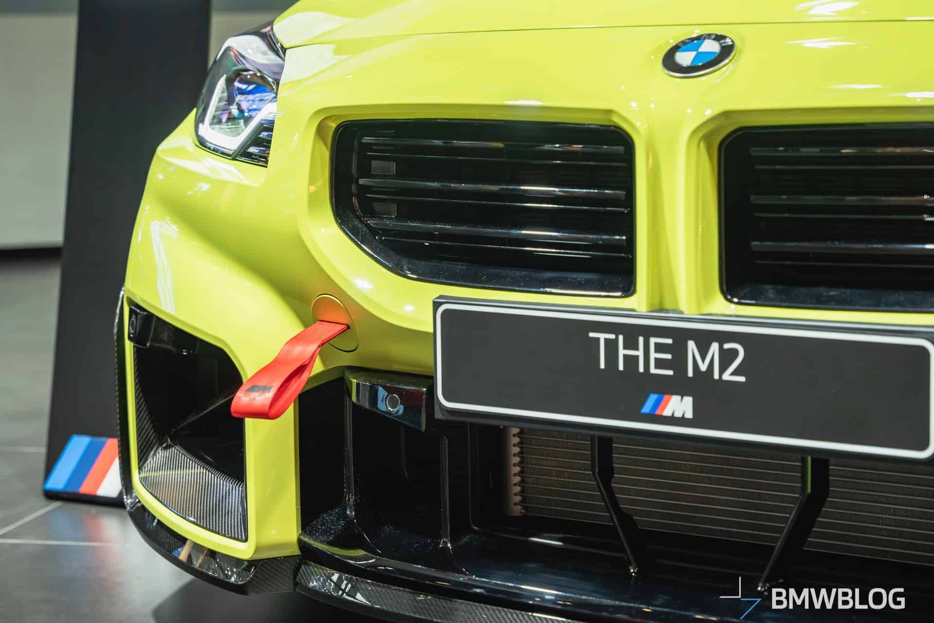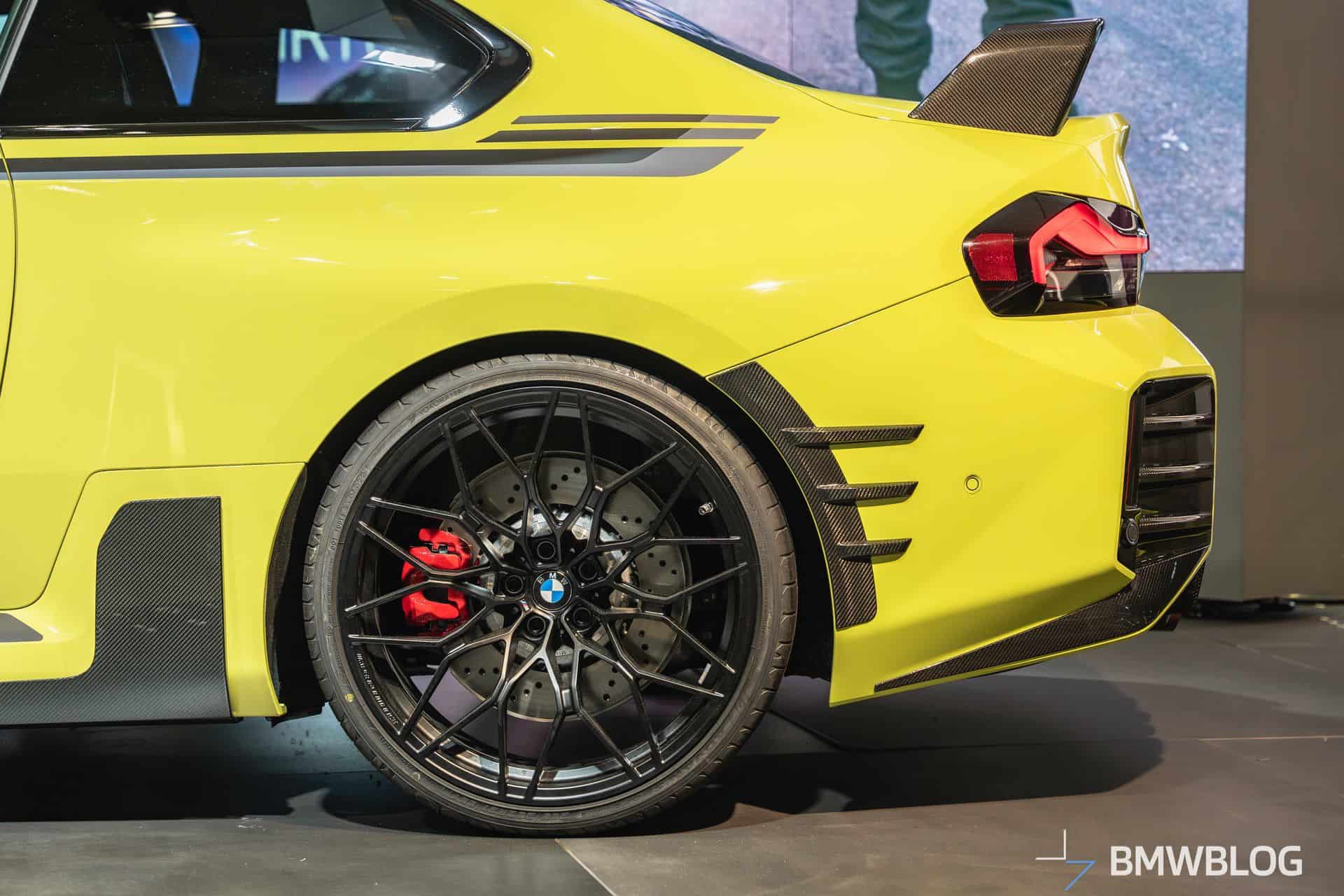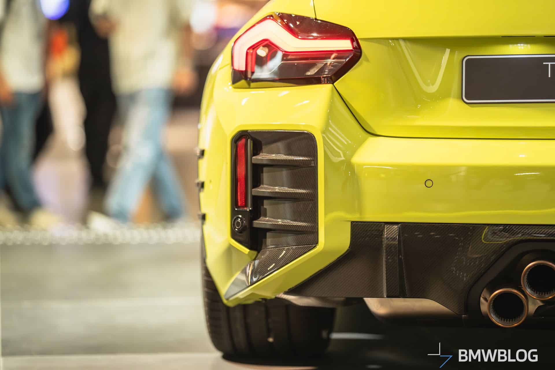 Photographed in Munich at the BMW Welt, the M2 facelift is brimming with optional items. It gets the side spats behind both front and rear wheels, along with side skirt attachments. All these extra goodies are made from carbon fiber, which is the same we can say about the front air intakes. The front also hosts a beefier splitter made from the same lightweight material.