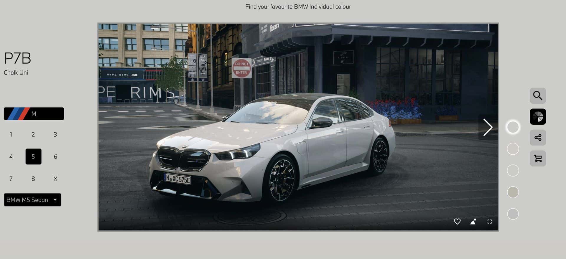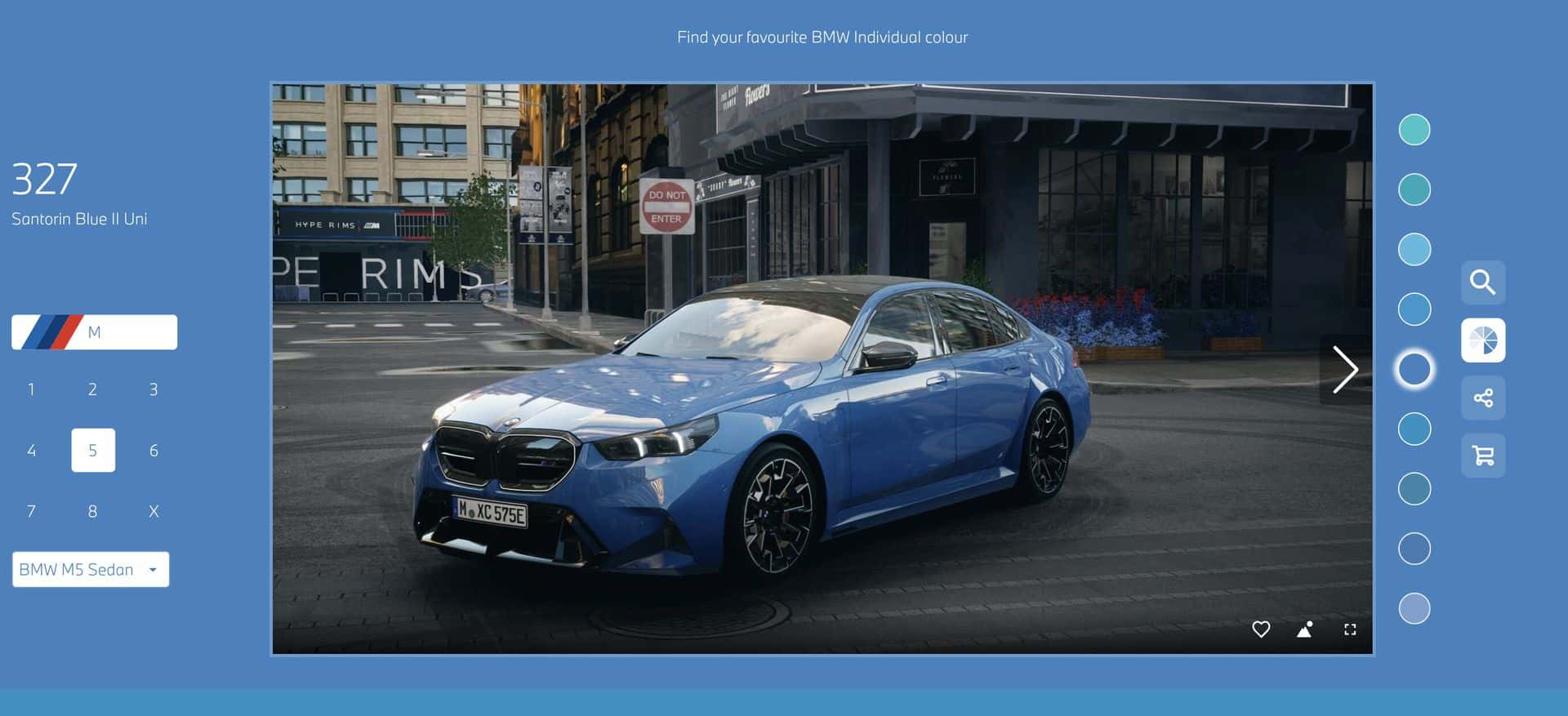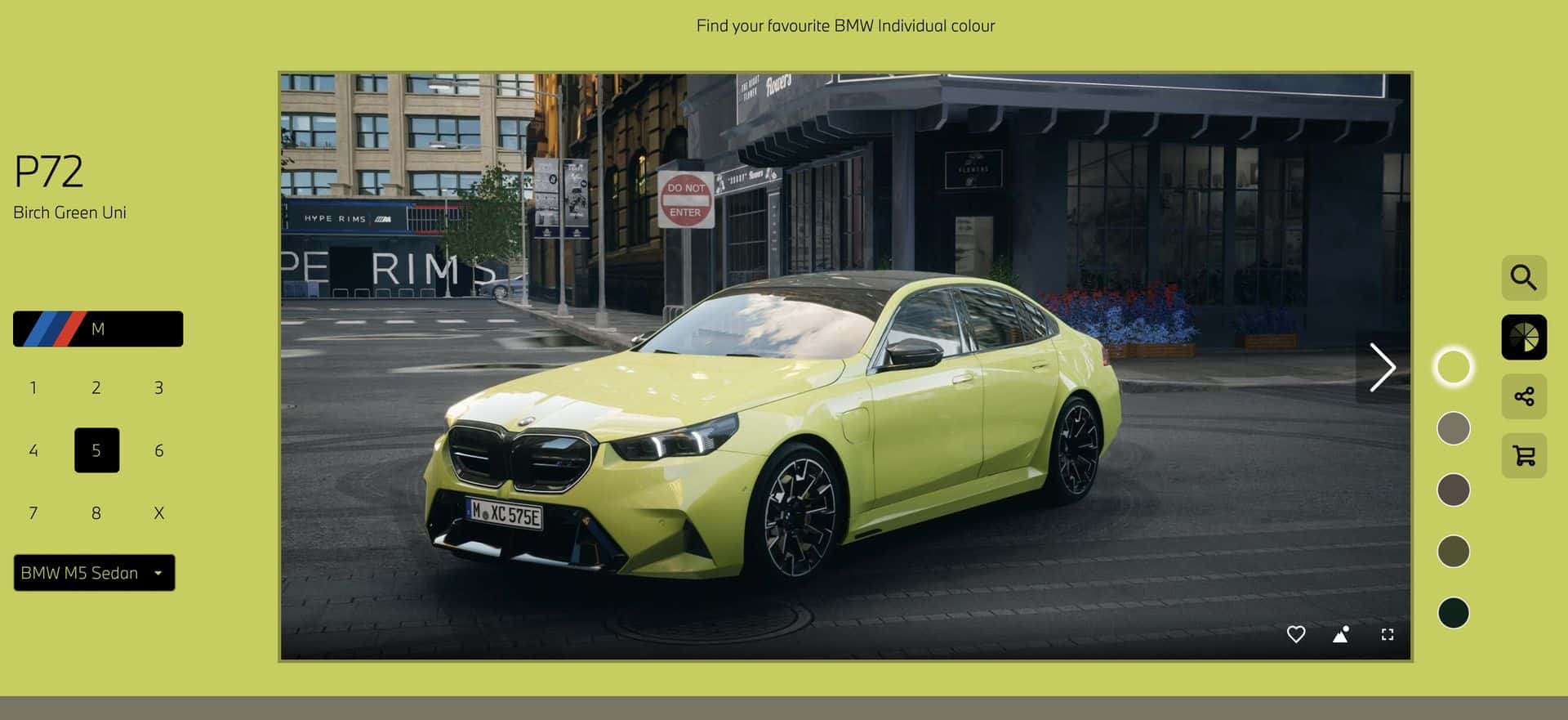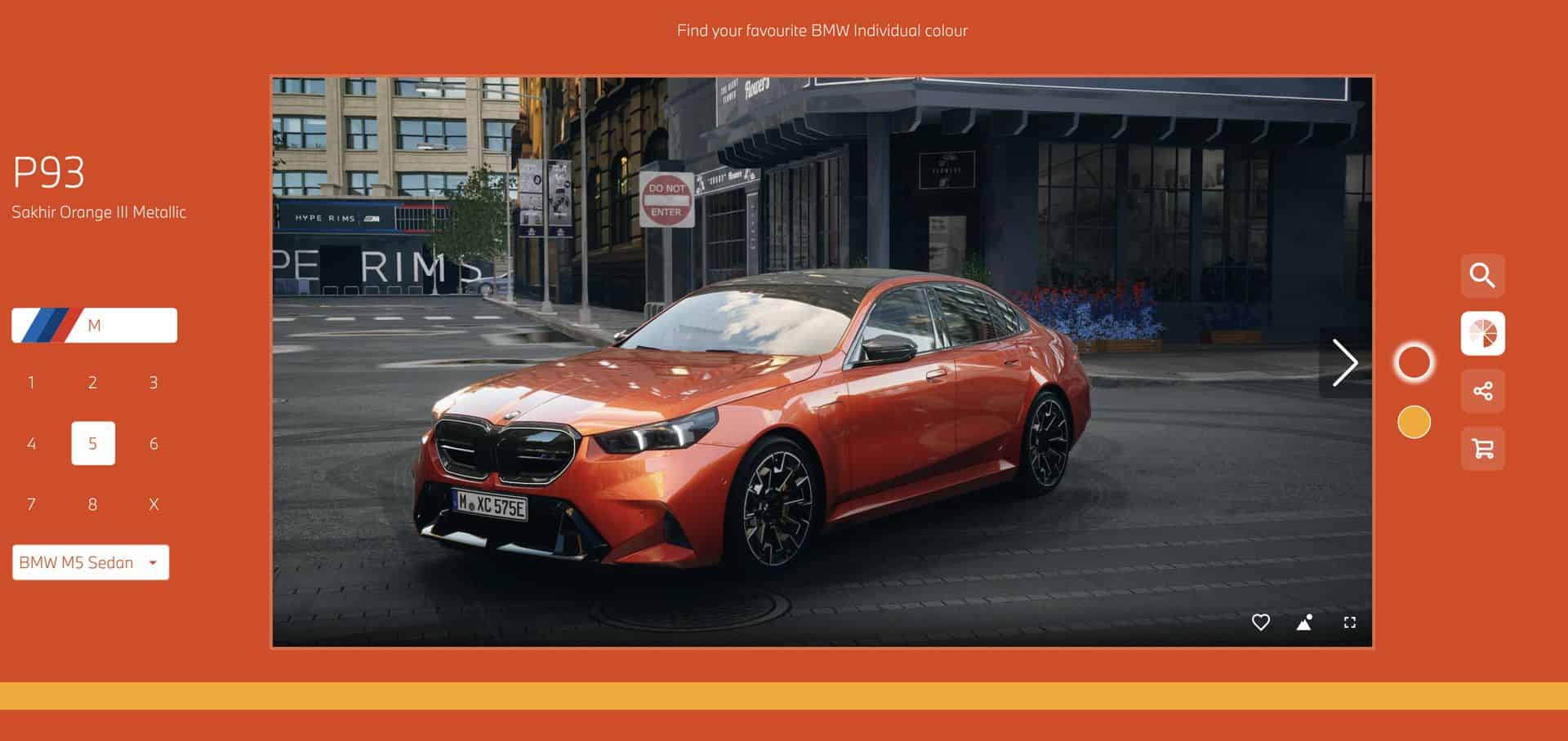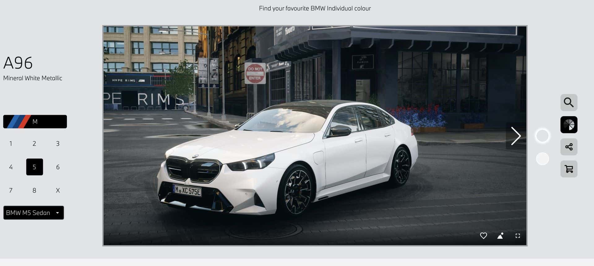 The color palette ranges from classic and understated shades like white and black to more vibrant and eye-catching hues such as green and orange. Additionally, BMW offers a variety of finishes, including solid, metallic, and Frozen colors with a matte finish. Each car featured on the visualizer is equipped with the optional carbon fiber roof.