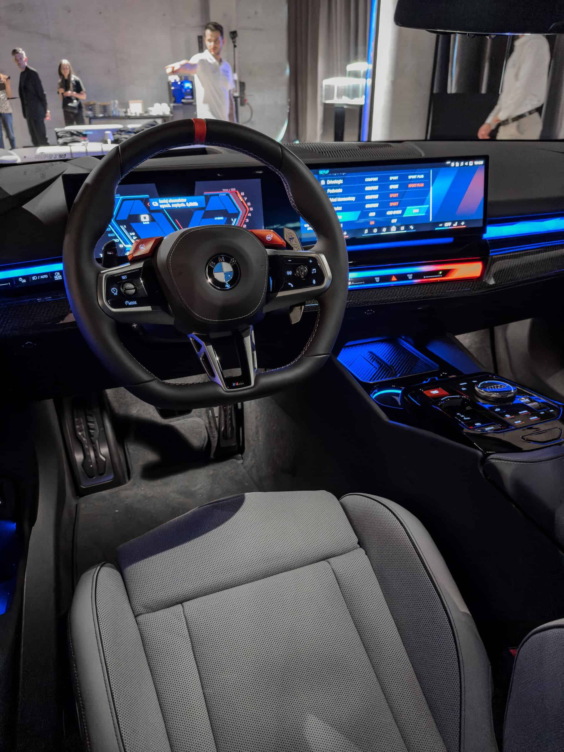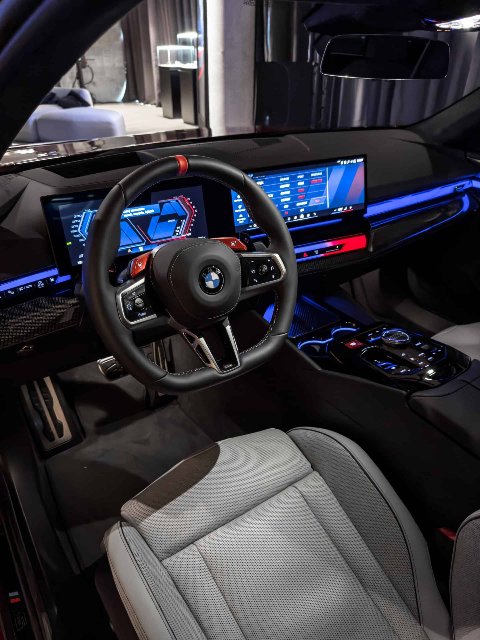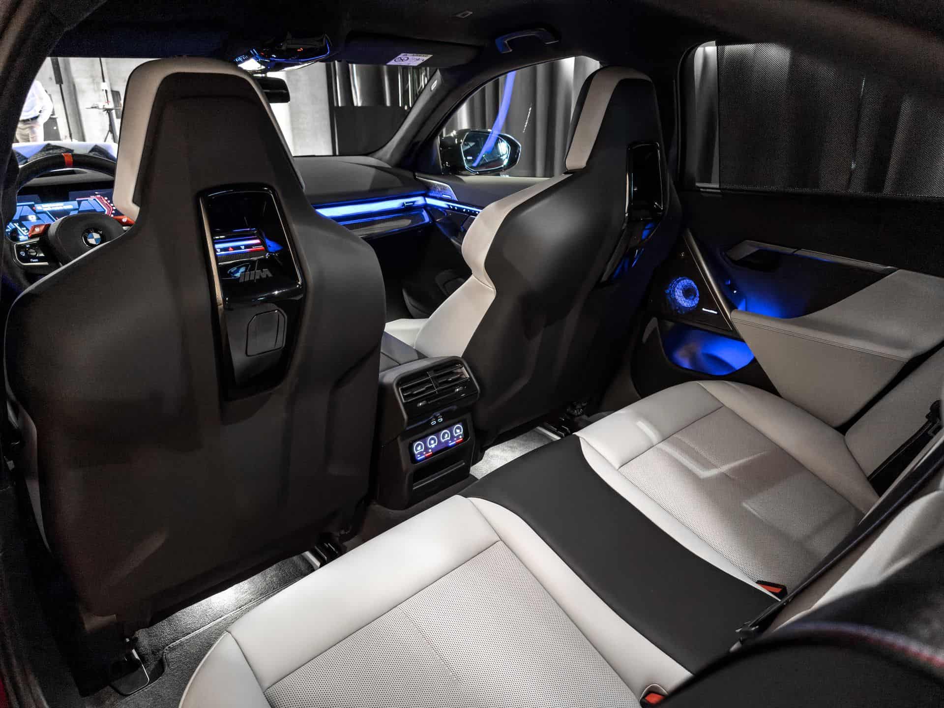 It’s safe to say this 2025 M5 has a daring spec given the combination between Silverstone and Black Merino leather. For the dashboard, BMW opted for a carbon fiber trim with a high-gloss finish. In case you haven’t noticed, the G90 is the first M product with a small gear selector. Right next to it is an M-branded rotary knob for the iDrive controller we don’t remember seeing before.