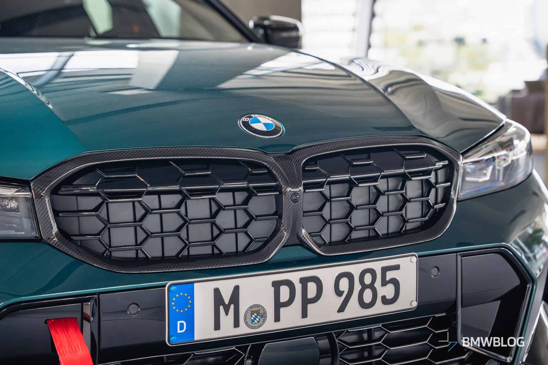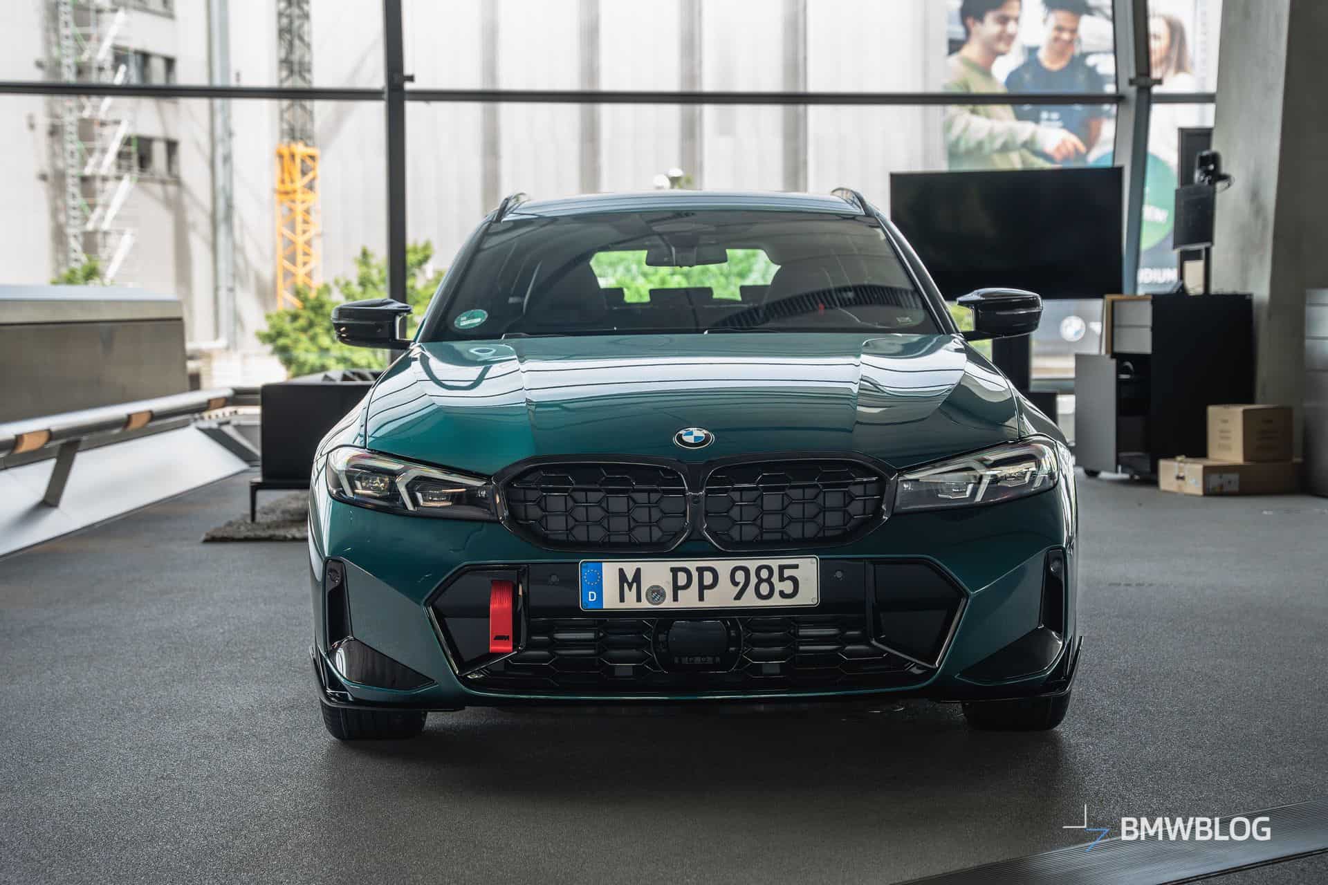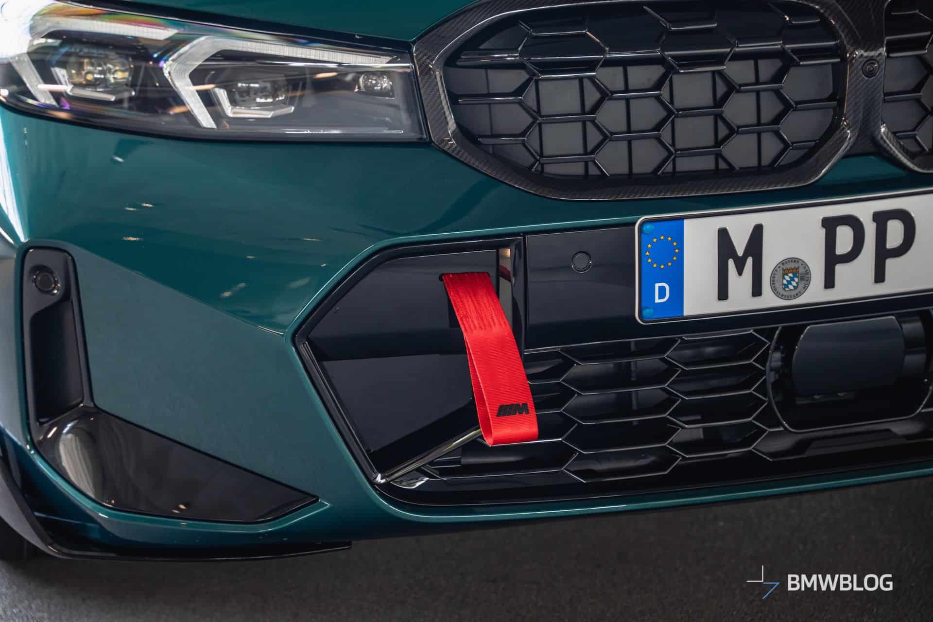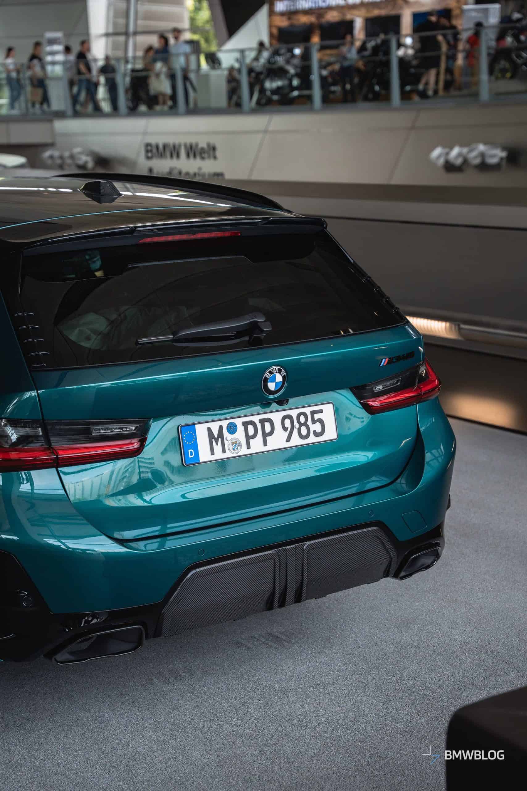 We spotted the desirable wagon in Munich at the BMW Welt. It has a discreet body kit with a carbon fiber kidney grille and a not-so-subtle red tow strap with M branding. At the rear, it flaunts a blacked-out M340i badge and a carbon diffuser with three vertical fins. The body decals are not the only change noticeable on the sides since the 19-inch wheels are also an upgrade from the M Performance Parts catalog.