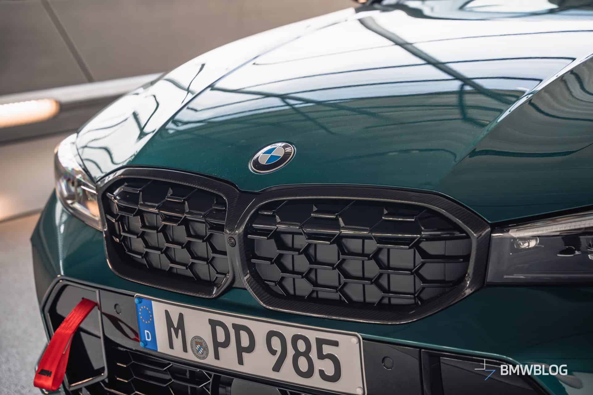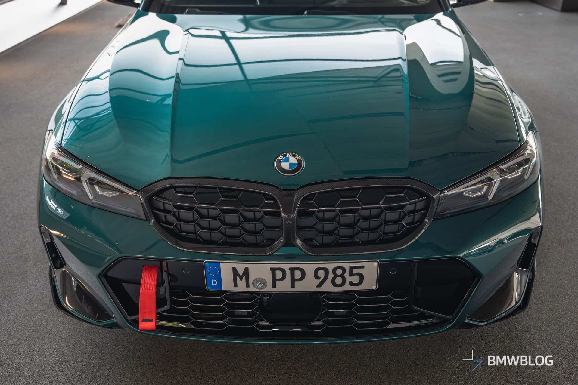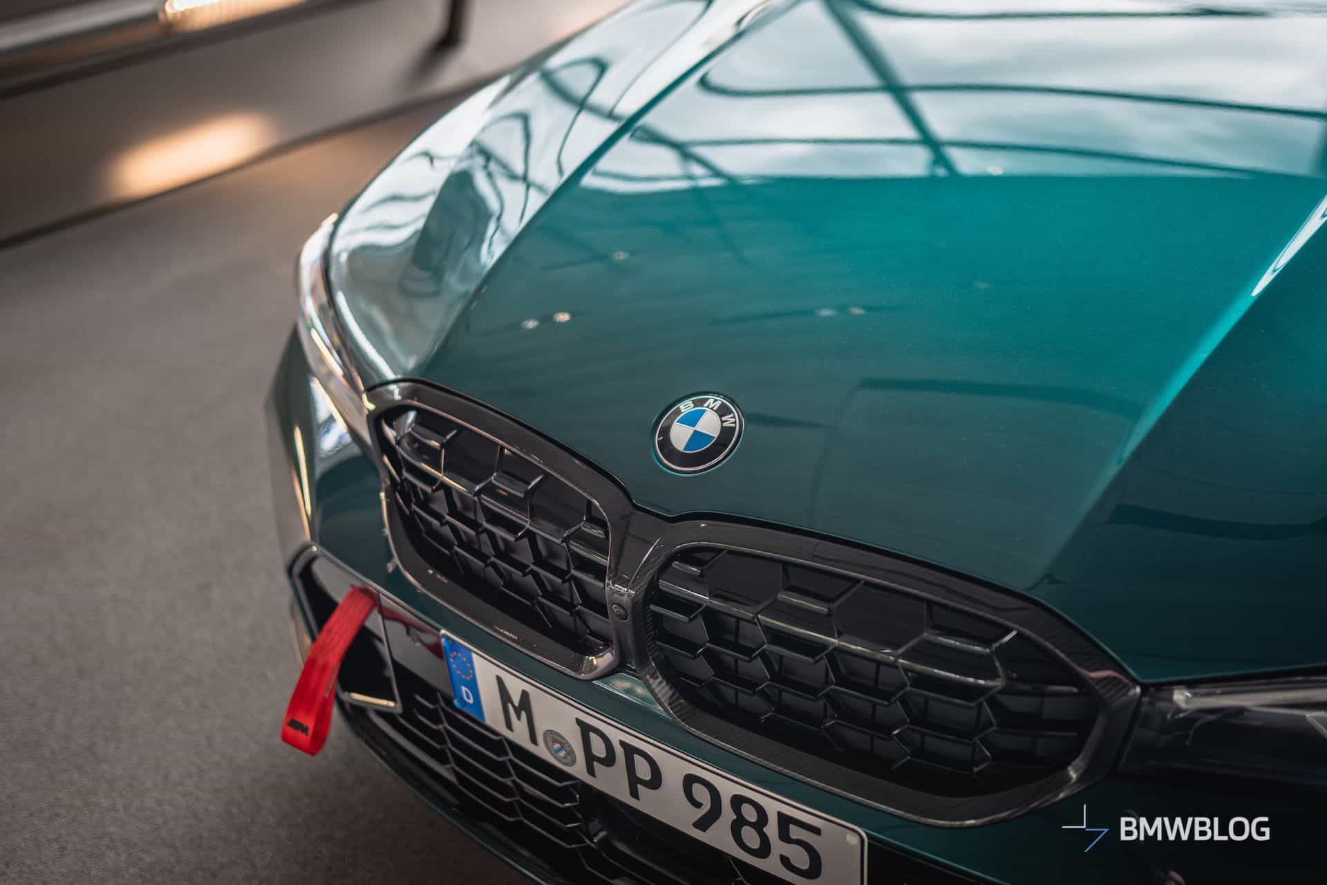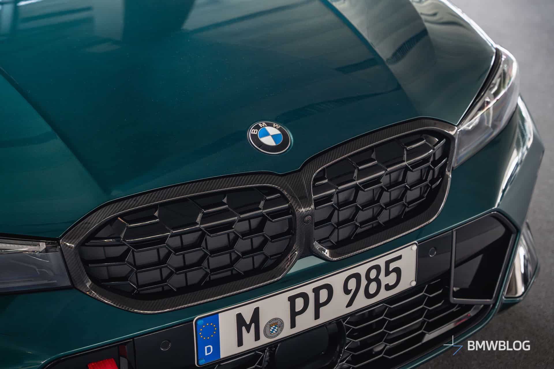 We spotted the desirable wagon in Munich at the BMW Welt. It has a discreet body kit with a carbon fiber kidney grille and a not-so-subtle red tow strap with M branding. At the rear, it flaunts a blacked-out M340i badge and a carbon diffuser with three vertical fins. The body decals are not the only change noticeable on the sides since the 19-inch wheels are also an upgrade from the M Performance Parts catalog.
