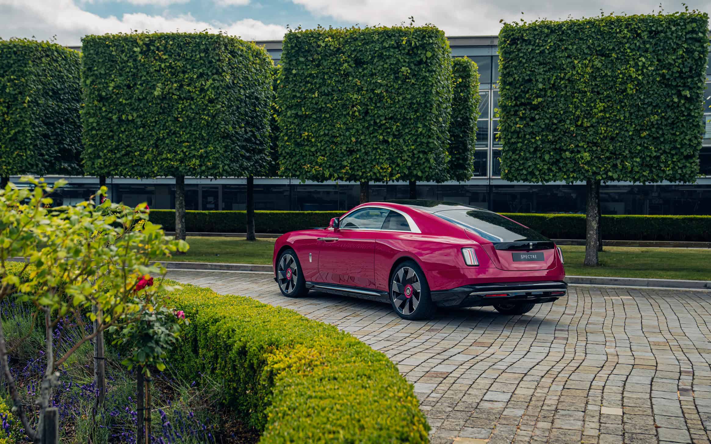 RR’s first electric model, Spectre, also has a bi-color finish by mixing Peony Pearl with Black Diamond. The stately coupe sits on gargantuan 23-inch wheels with body-matching center caps. Inside, the customer opted for Peony Pink and Arctic White colors. The Rolls-Royce of EVs not only has the usual Starlight Headliner but also Starlight Doors with no fewer than 4,796 illuminated stars.