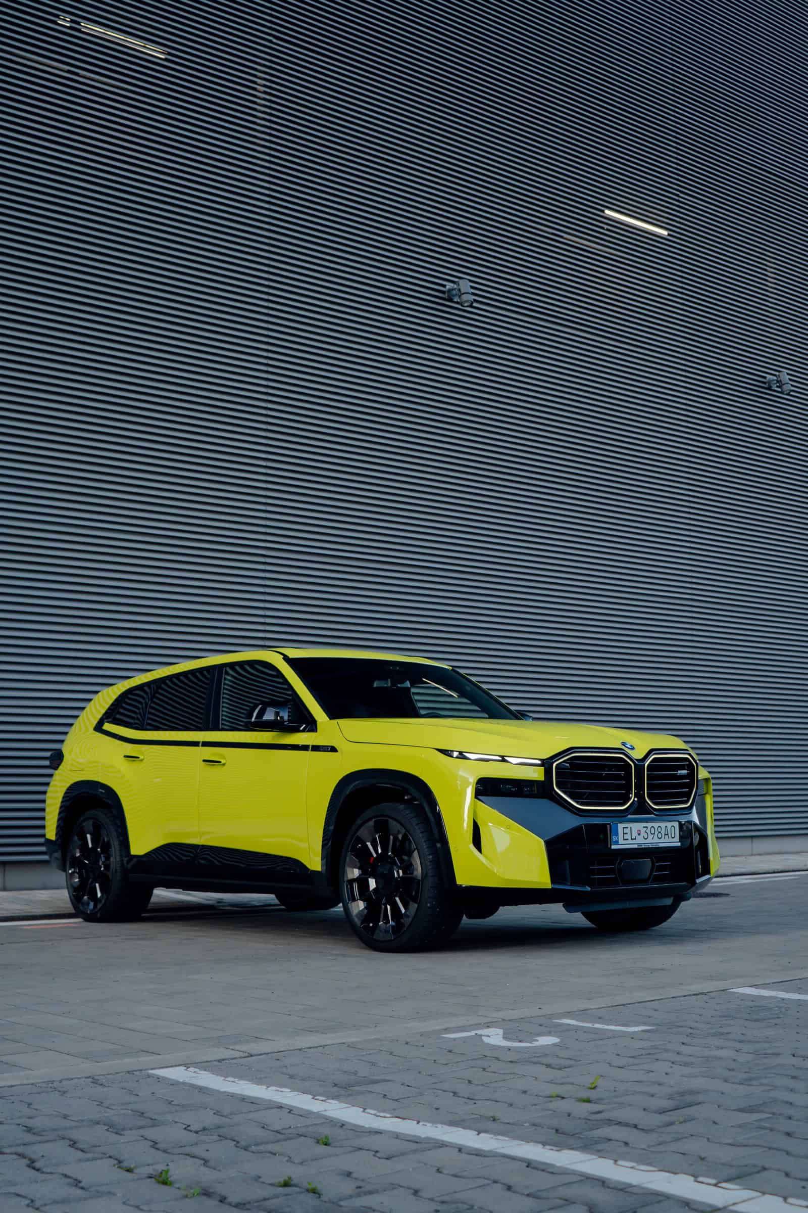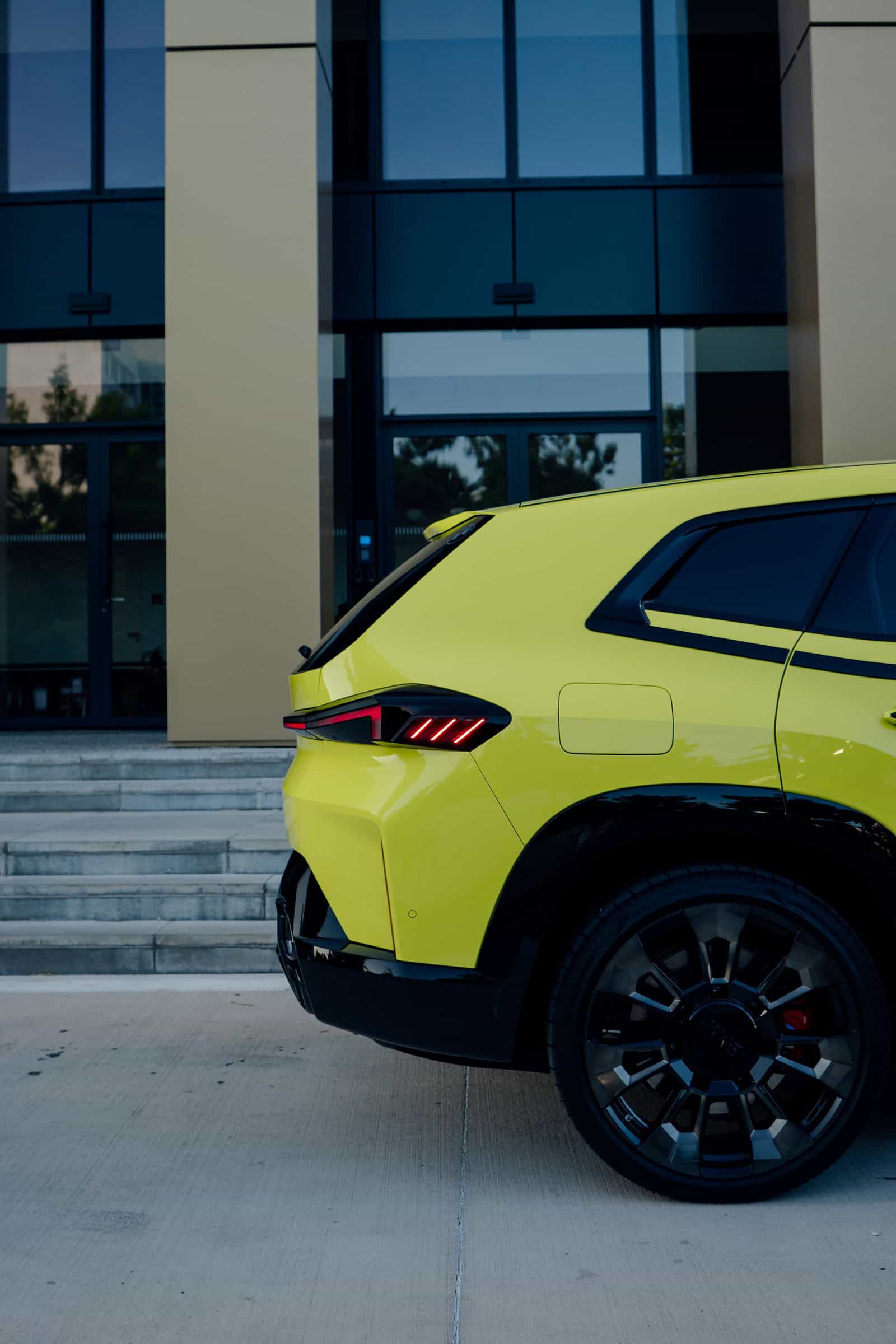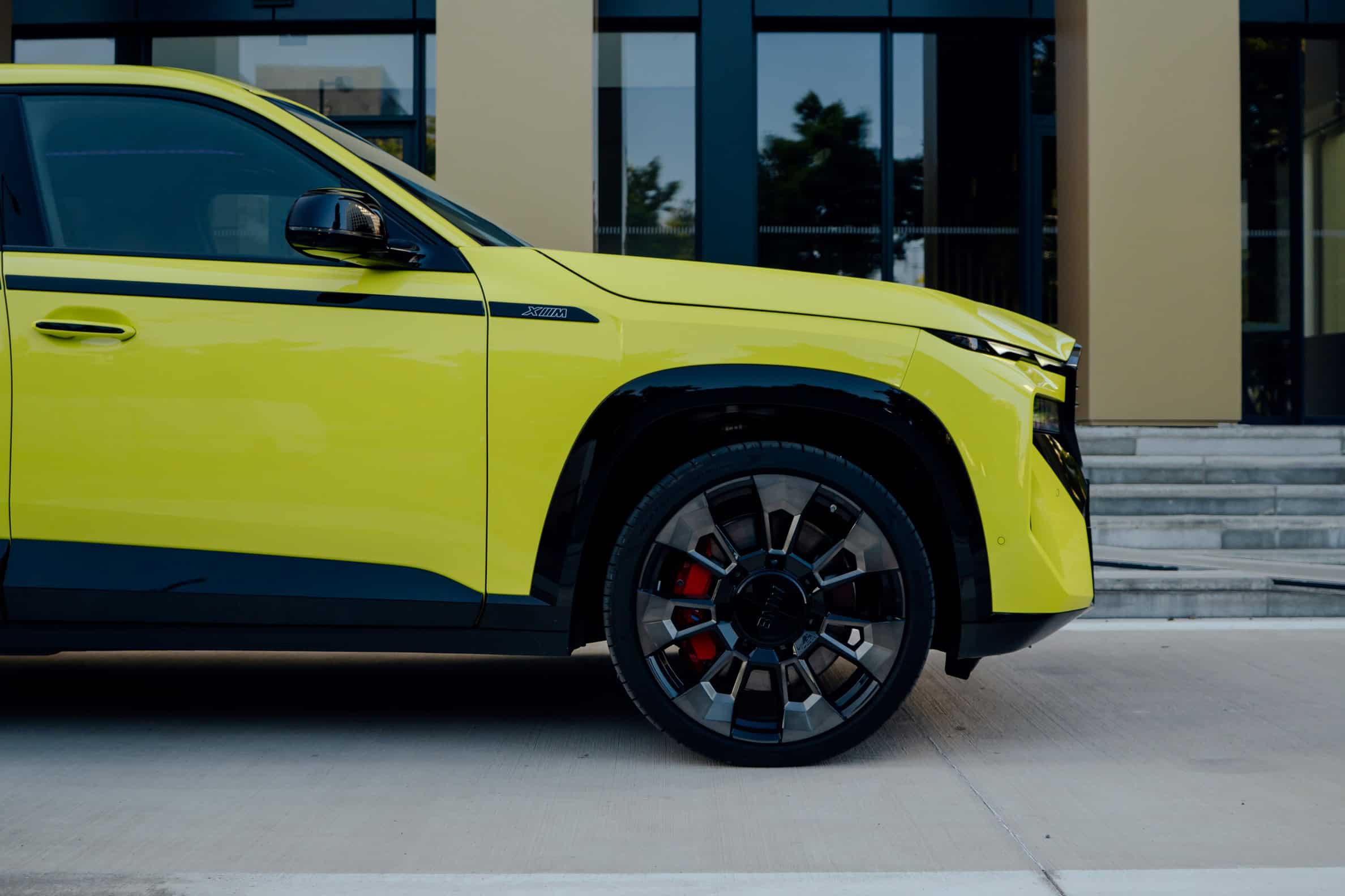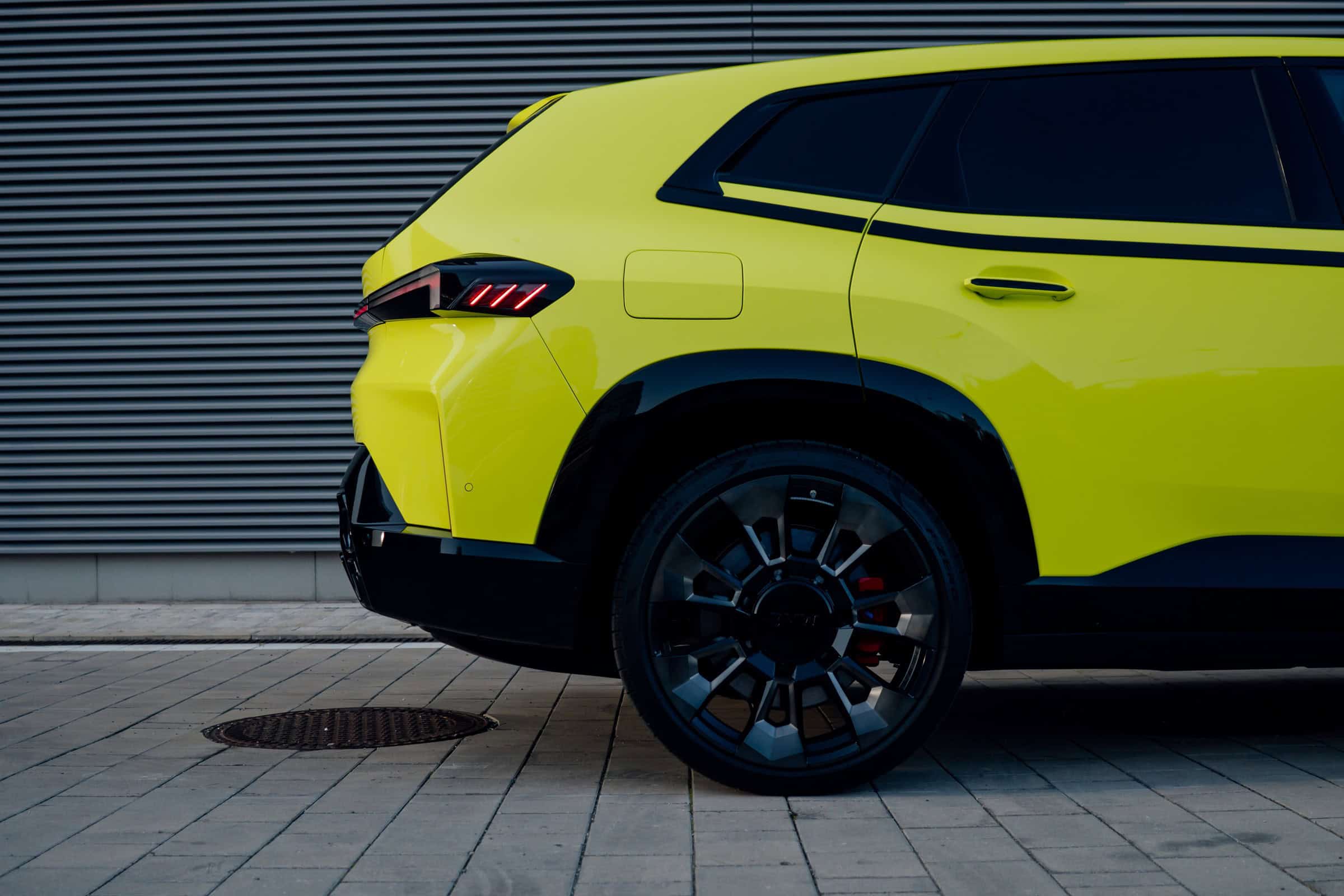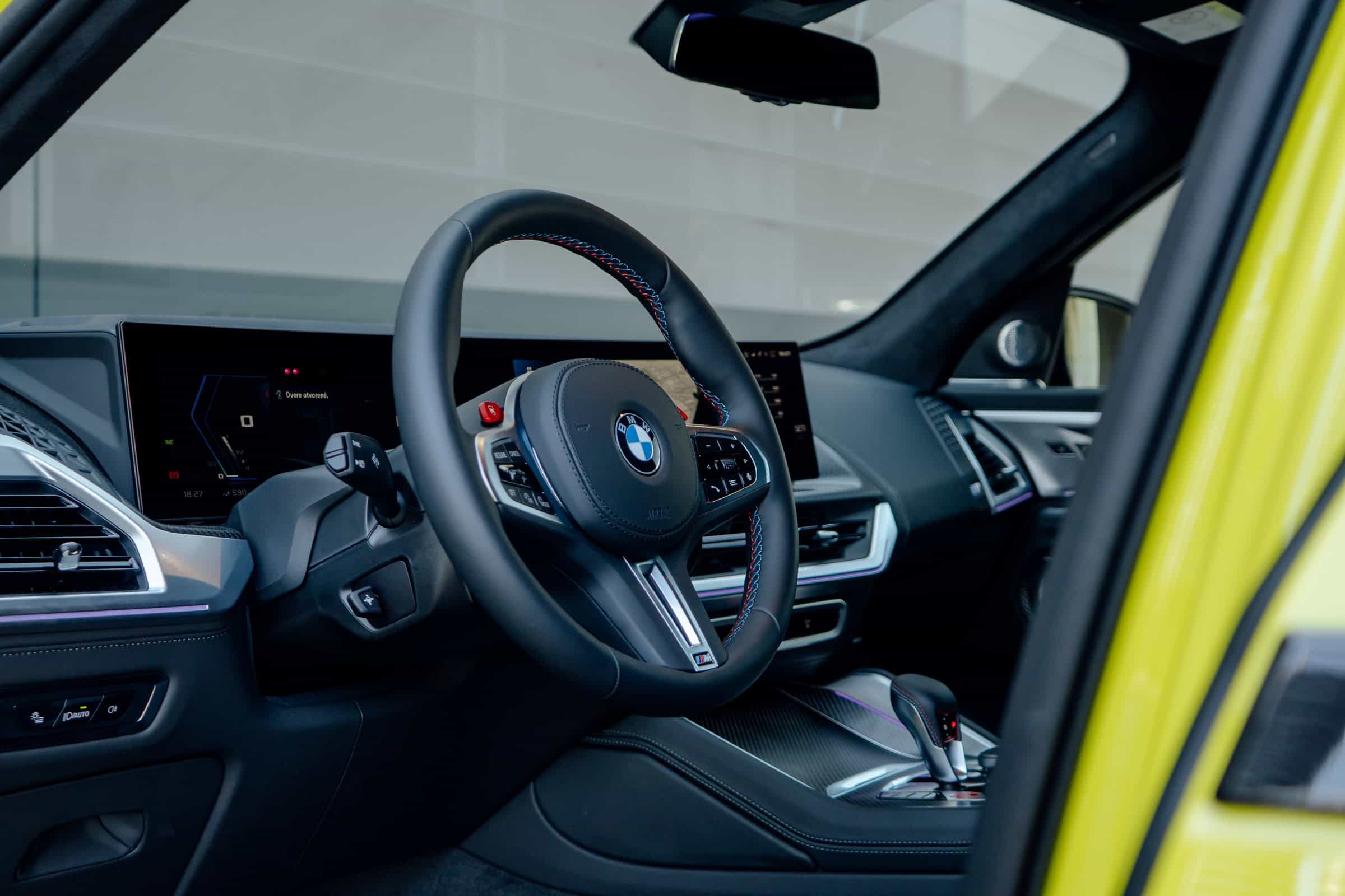 Finished in Sao Paulo Yellow, the XM 50e rides on 23-inch wheels – the largest alloys ever offered from the factory by BMW. The interior is just as striking since the dedicated M model has blue Merino leather with Deep Lagoon upholstery. Unlike the new M5 with its small gear selector, the mechanically related electrified SUV has the old bulky transmission lever.