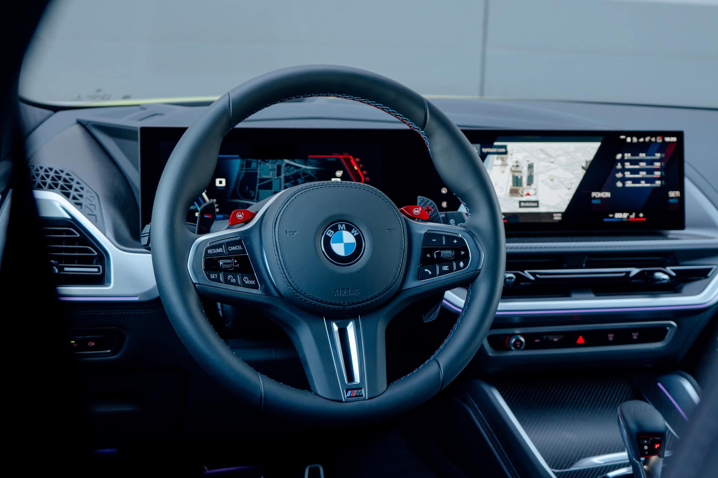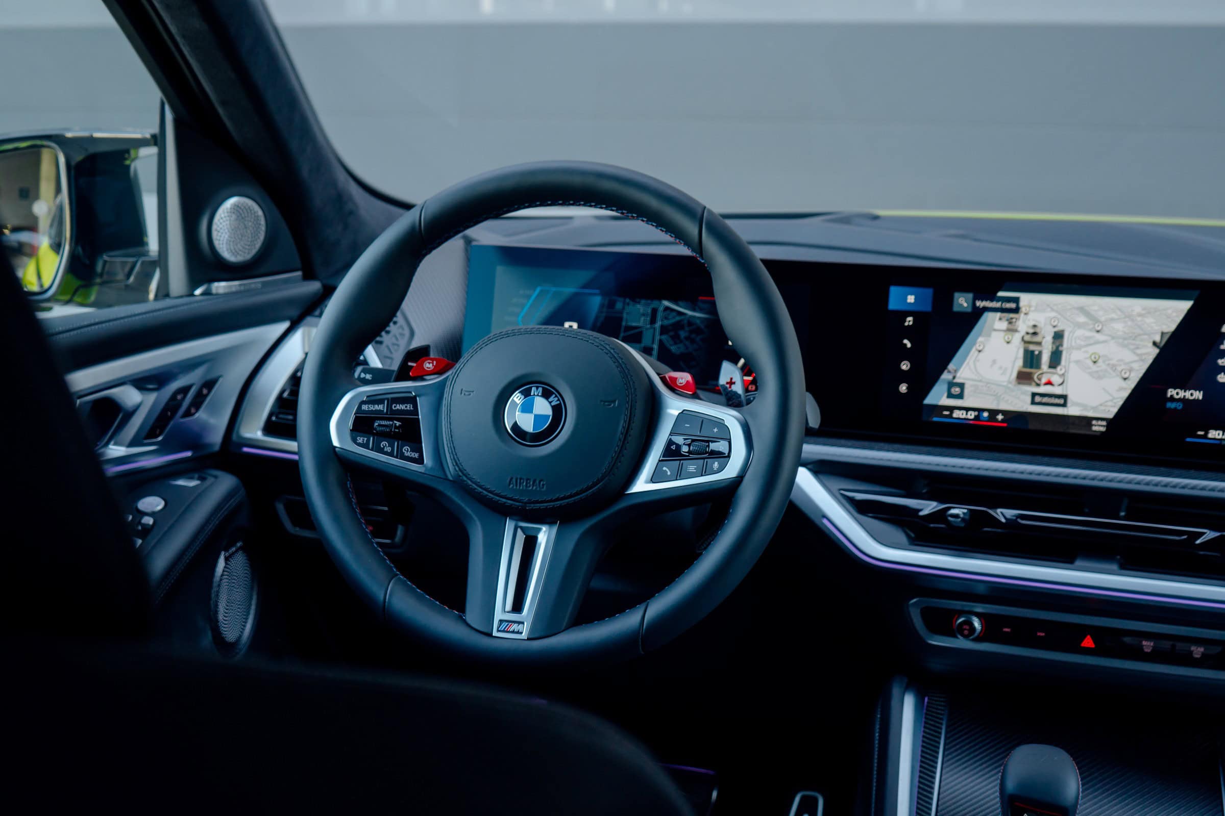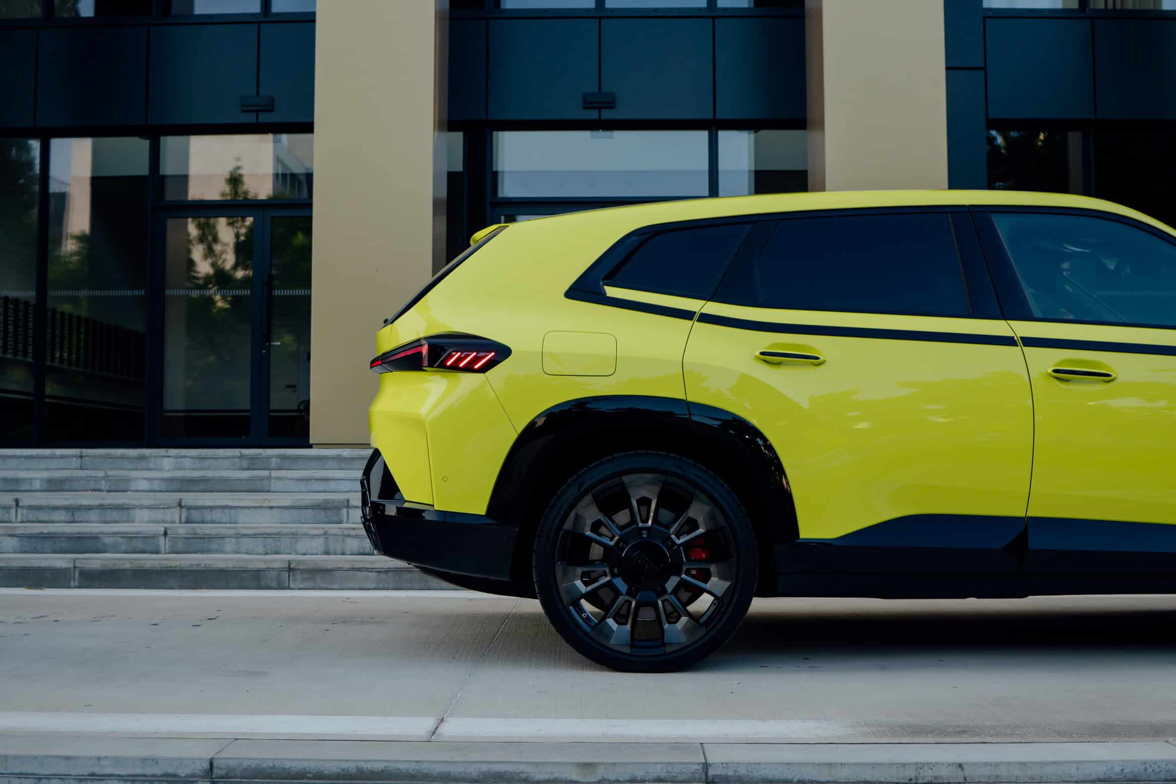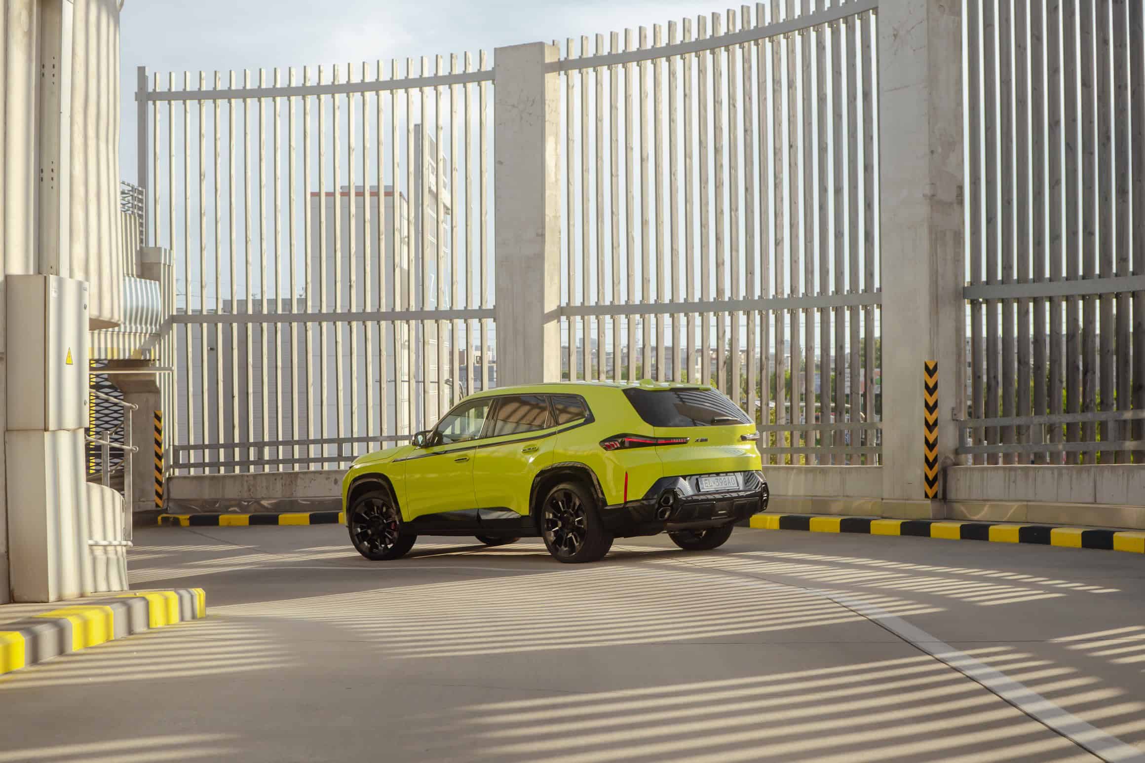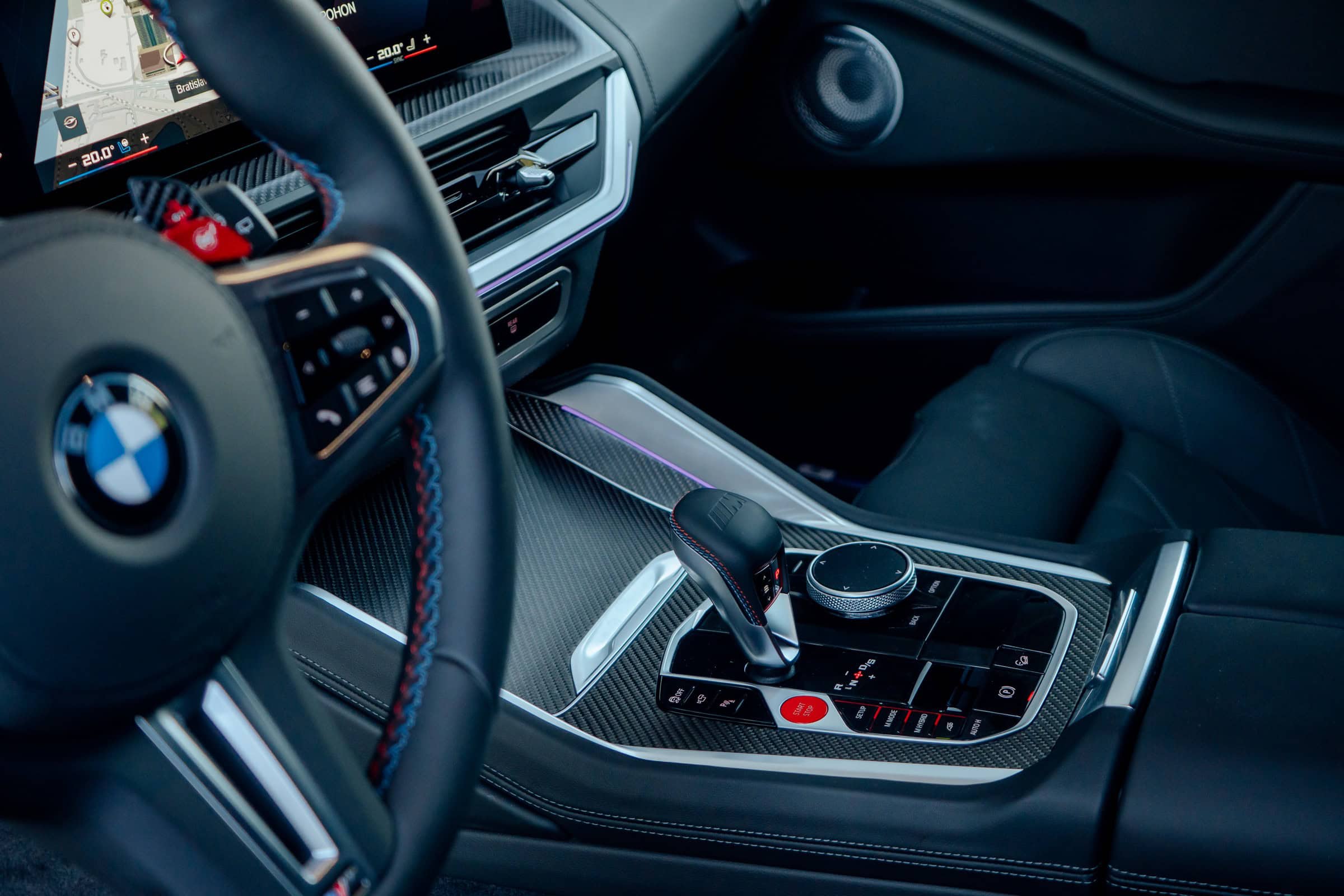 Finished in Sao Paulo Yellow, the XM 50e rides on 23-inch wheels – the largest alloys ever offered from the factory by BMW. The interior is just as striking since the dedicated M model has blue Merino leather with Deep Lagoon upholstery. Unlike the new M5 with its small gear selector, the mechanically related electrified SUV has the old bulky transmission lever.