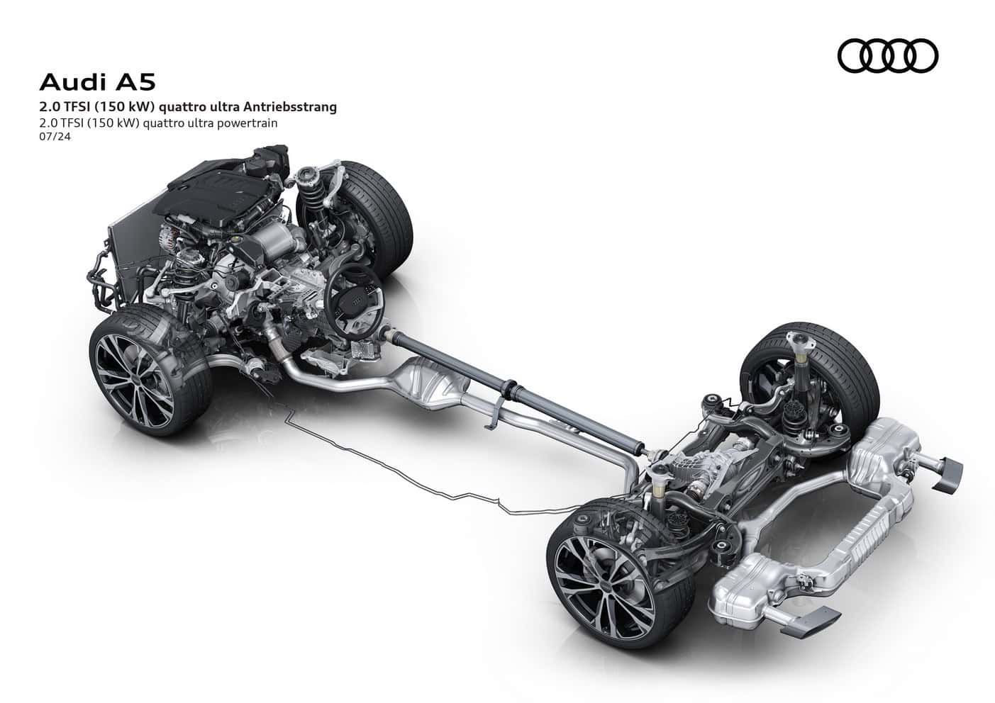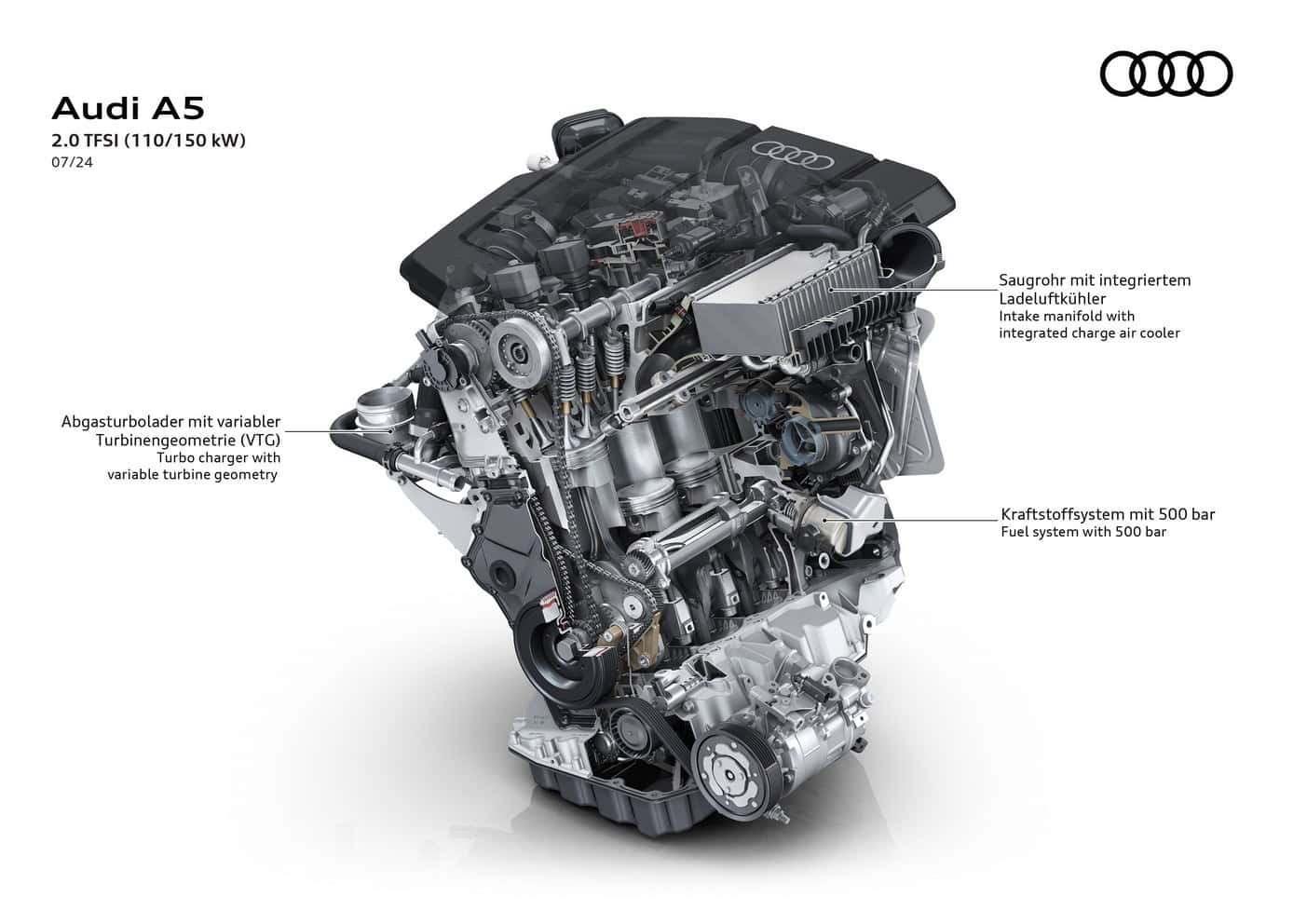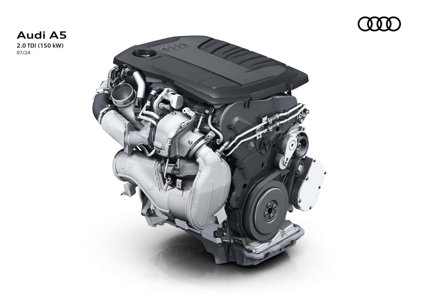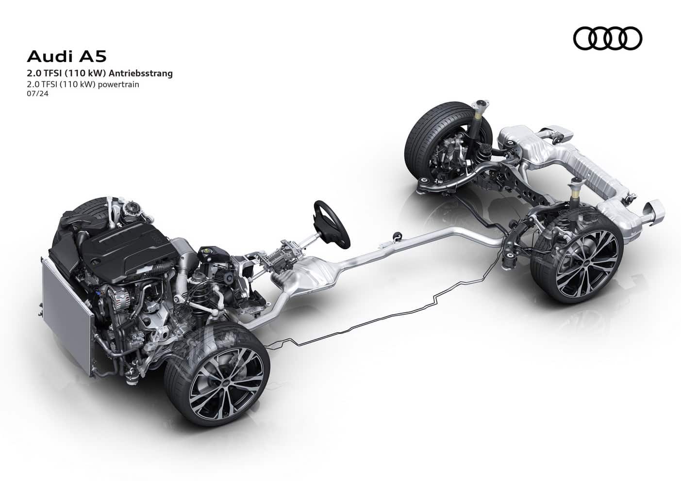 In Europe where preliminary technical specifications have been announced, the base A5 has a turbocharged 2.0-liter gasoline engine. The four-cylinder unit makes 150 hp and 204 hp, with the latter optionally offered with all-wheel drive. Featuring variable turbine geometry, the engine is exclusively linked to a dual-clutch automatic transmission.