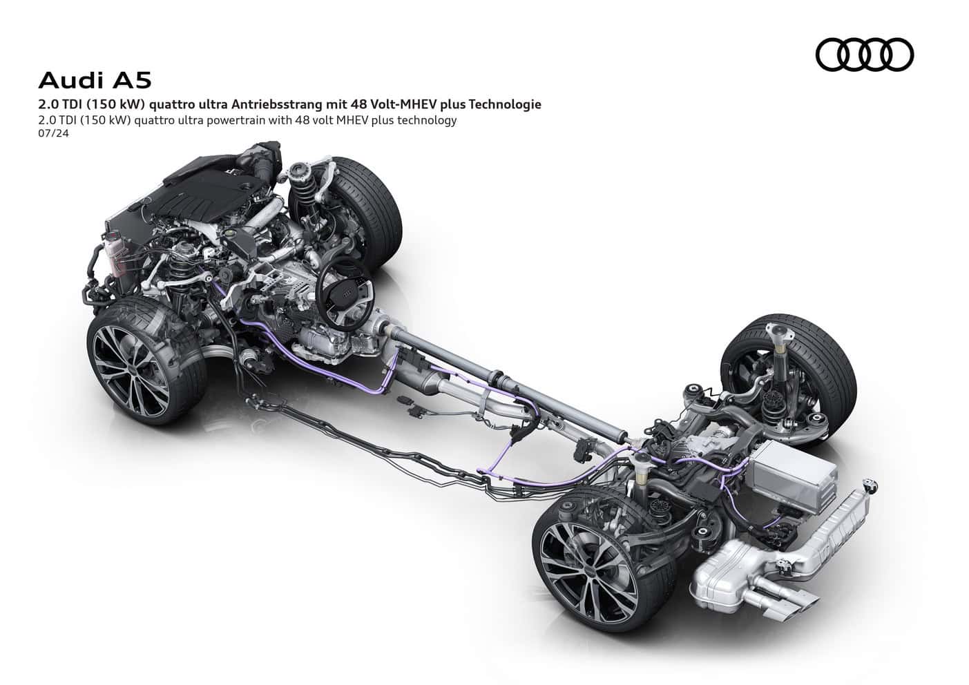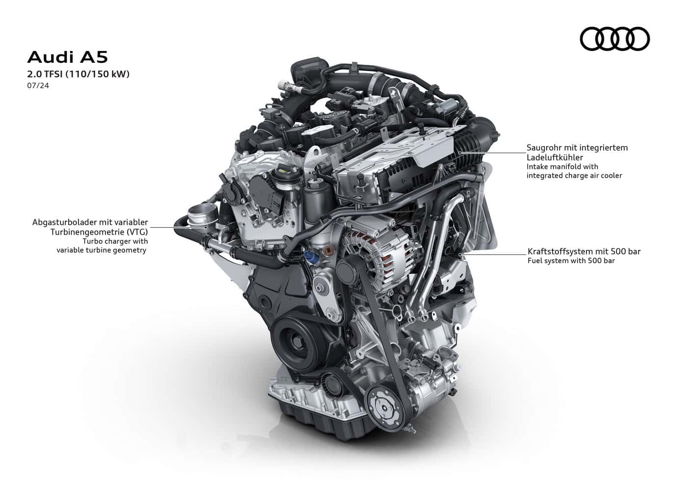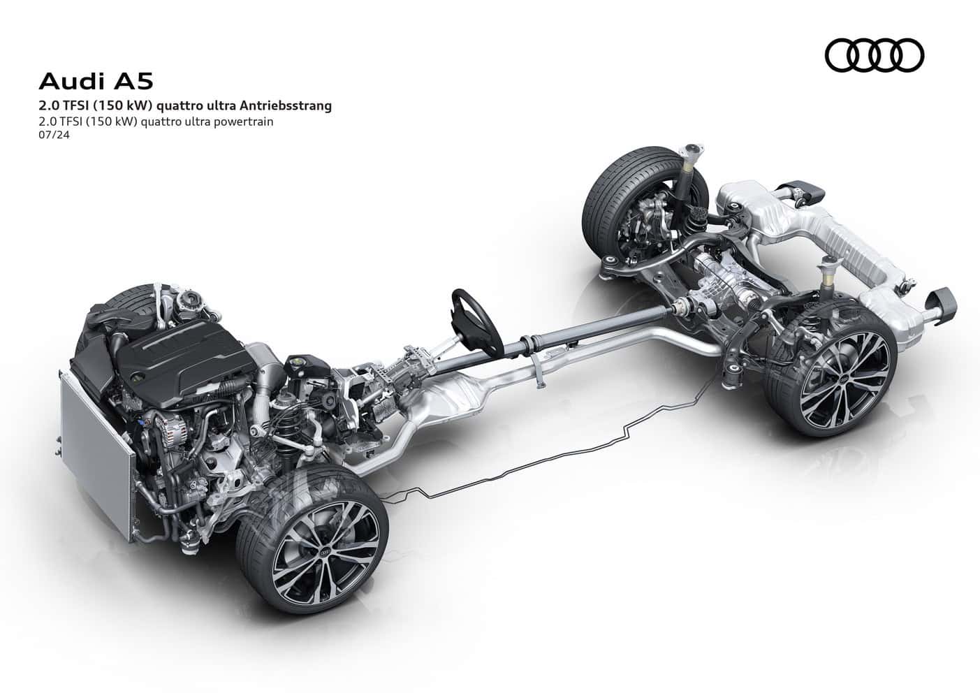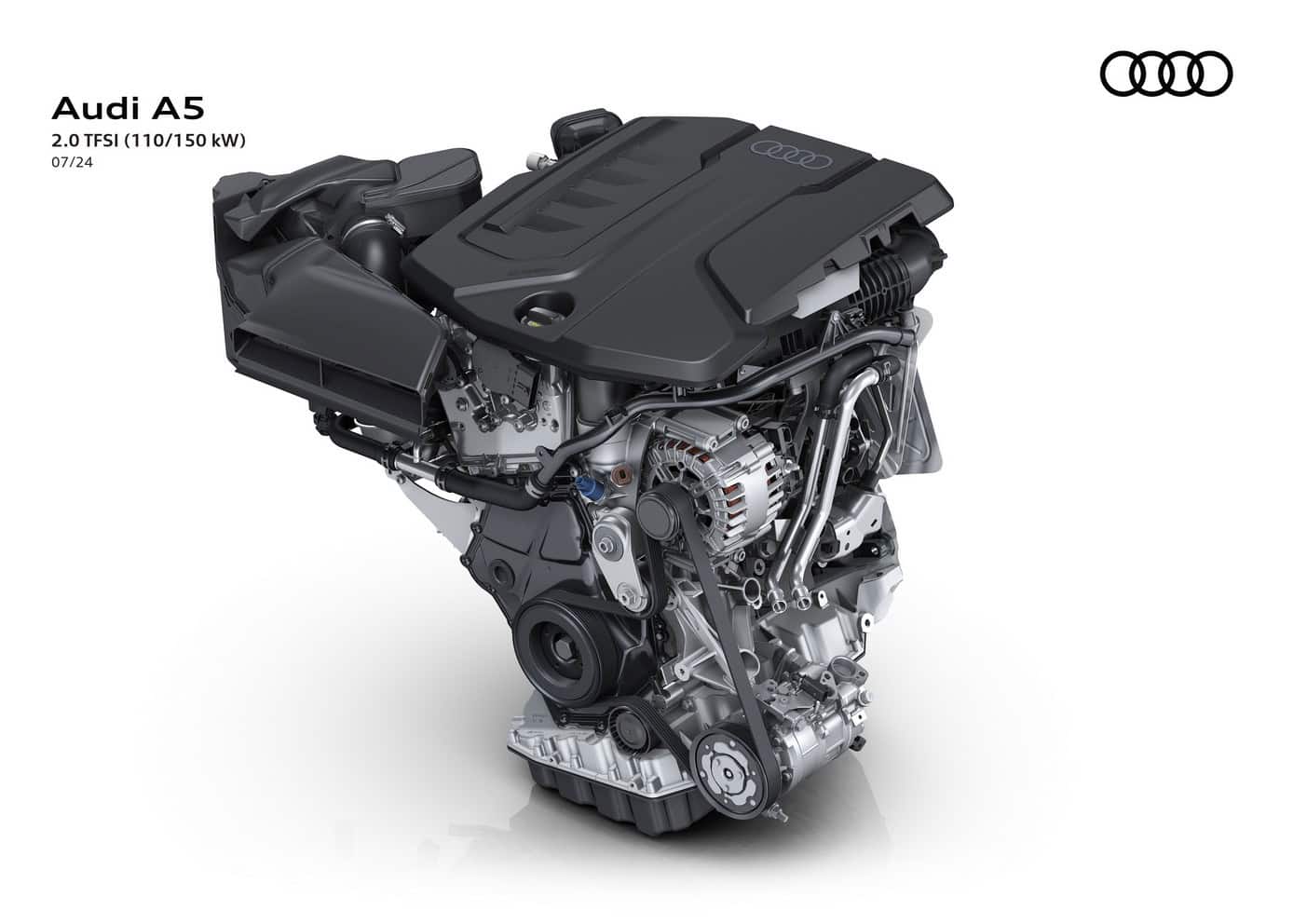 In Europe where preliminary technical specifications have been announced, the base A5 has a turbocharged 2.0-liter gasoline engine. The four-cylinder unit makes 150 hp and 204 hp, with the latter optionally offered with all-wheel drive. Featuring variable turbine geometry, the engine is exclusively linked to a dual-clutch automatic transmission.