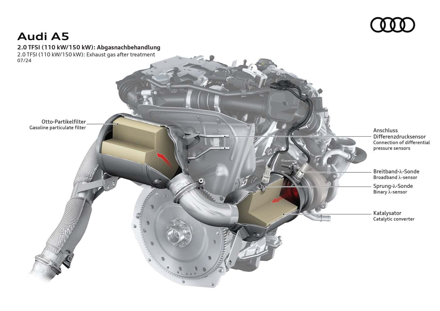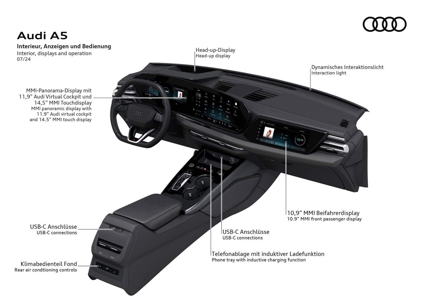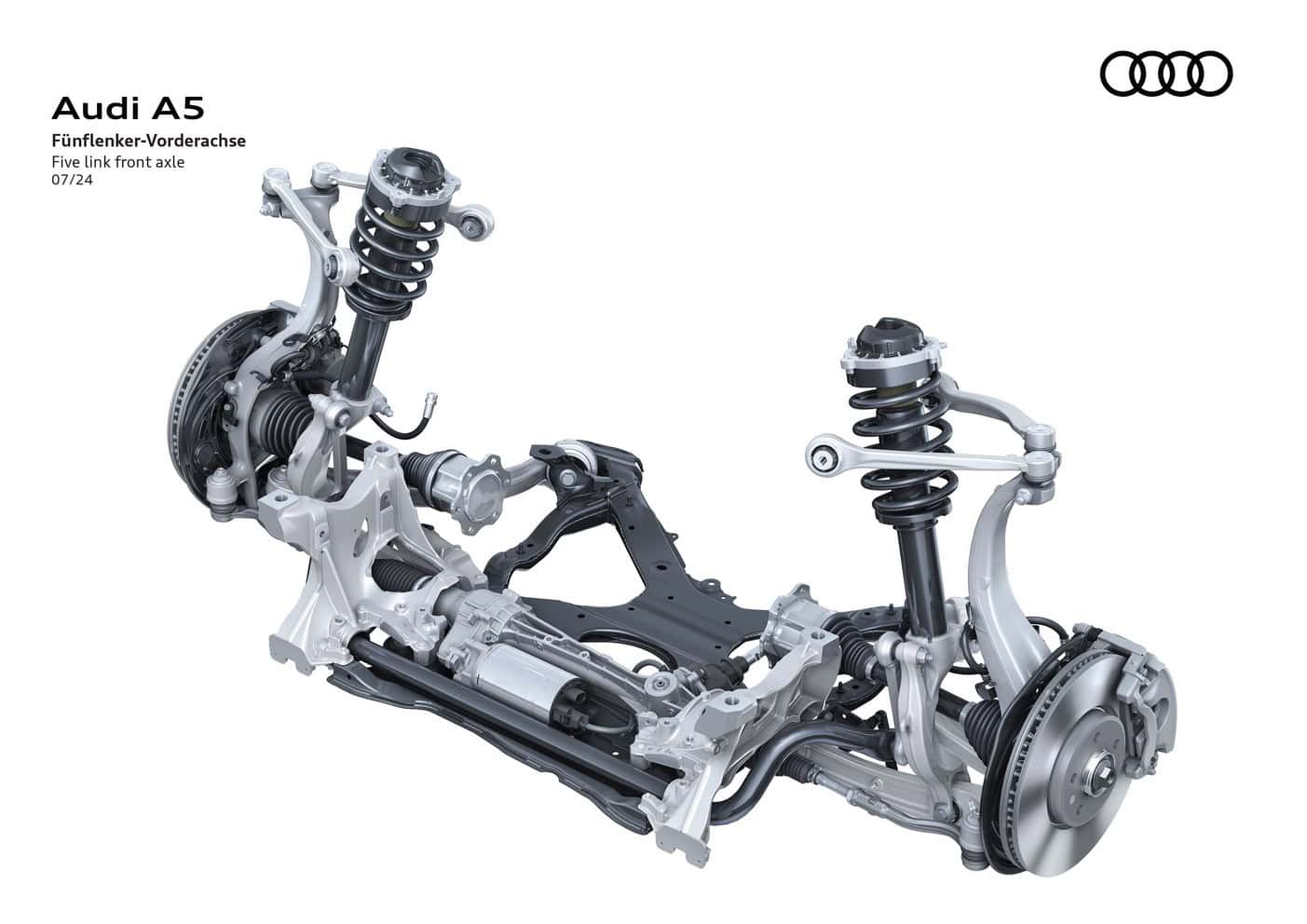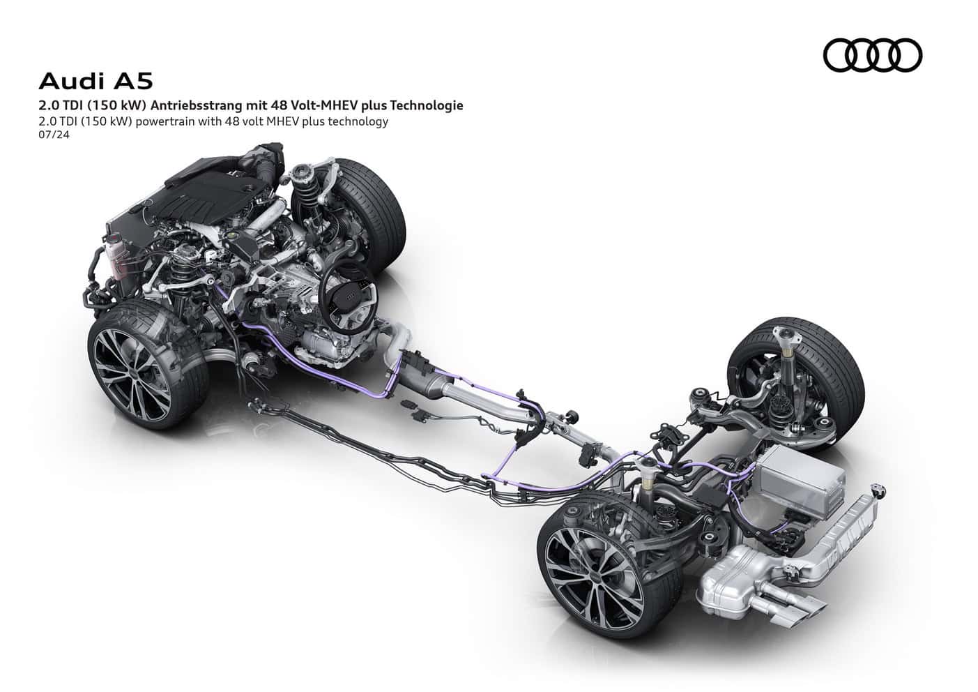In Europe where preliminary technical specifications have been announced, the base A5 has a turbocharged 2.0-liter gasoline engine. The four-cylinder unit makes 150 hp and 204 hp, with the latter optionally offered with all-wheel drive. Featuring variable turbine geometry, the engine is exclusively linked to a dual-clutch automatic transmission.