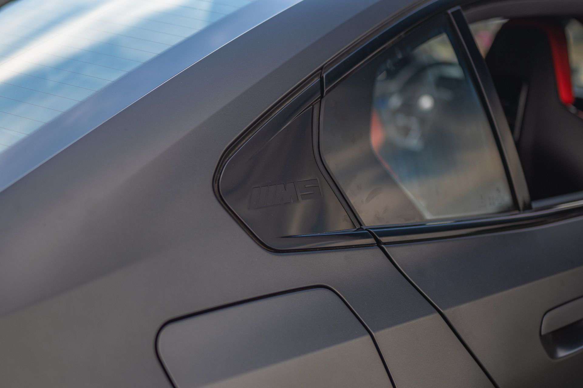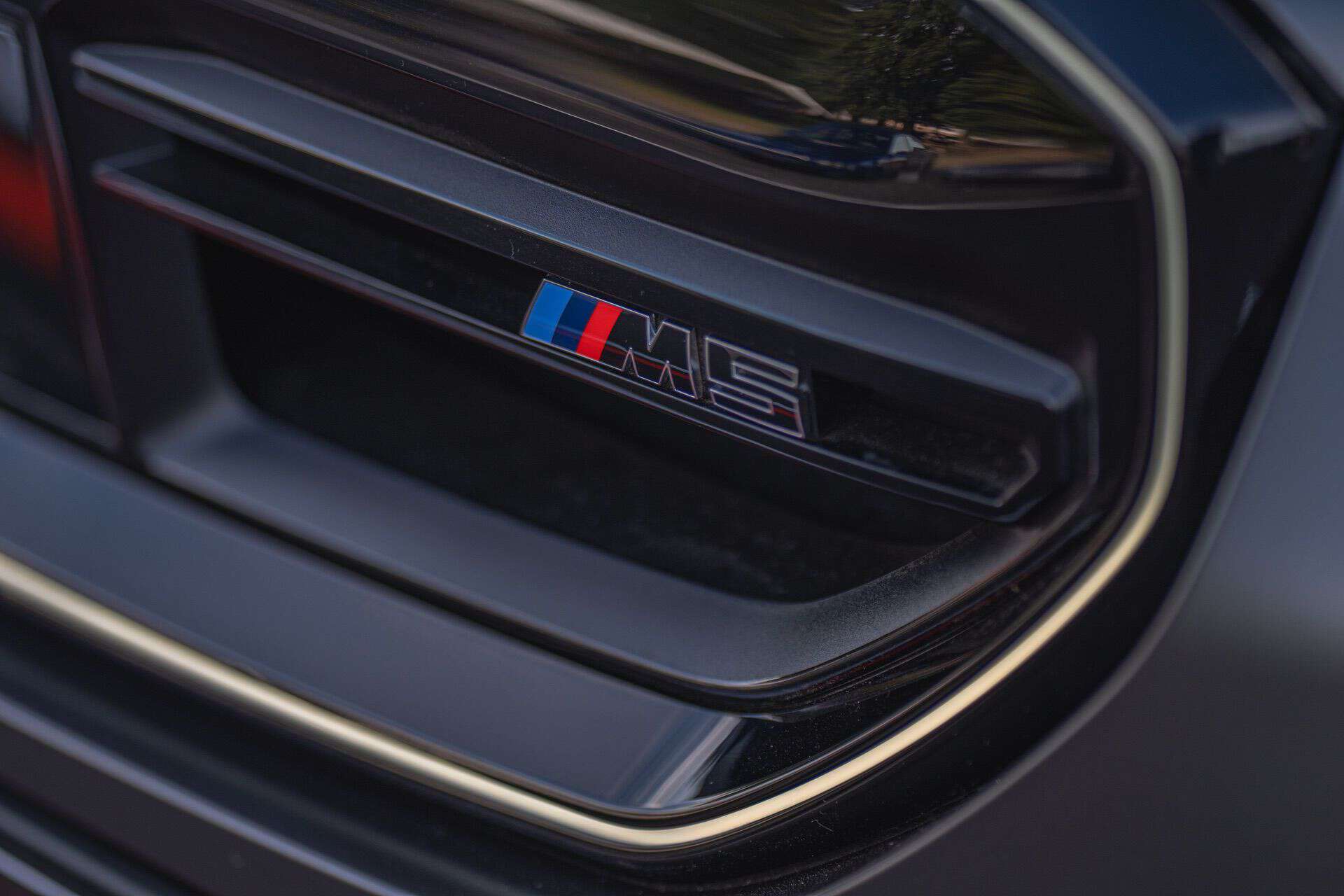 Striking gold calipers from the optional carbon-ceramic brakes peek out from behind the dark spokes, adding a touch of flair. While the split rear diffuser is subtle on this M5, it becomes a highlight on lighter-colored models. Unique to this generation, BMW has added a debossed “M5” logo at the Hofmeister Kink and an extra fuel cap for the charging port on the front fender.