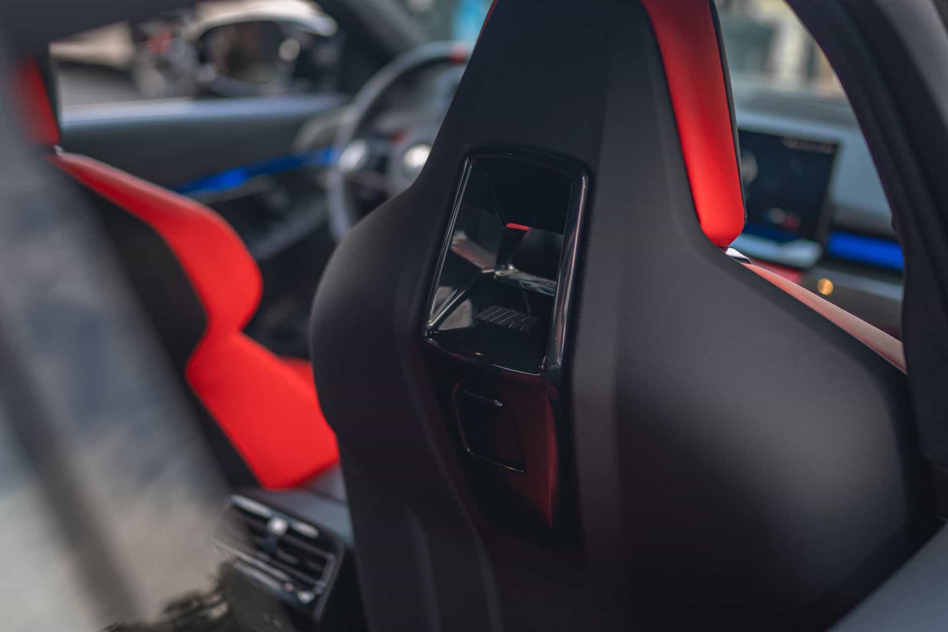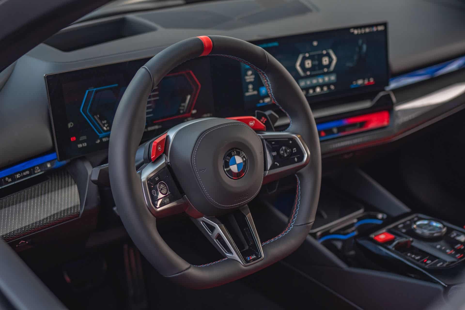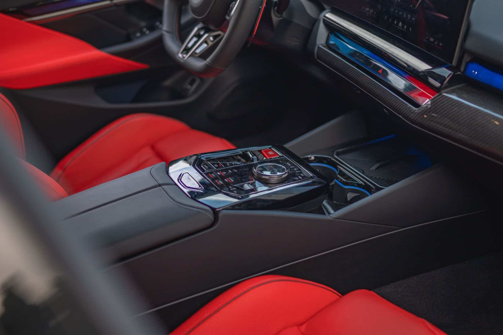 Inside, BMW has chosen to showcase the G90 M5 with Merino Red/Black leather upholstery, the sole seating option for the 2025 model. However, we anticipate the introduction of carbon bucket seats in future versions, likely in a CS model, which will offer more supportive front seats. Distinctive features exclusive to this M5 include the small gear selector and the M logo etched into the iDrive’s rotary knob, enhancing the car’s uniqueness.