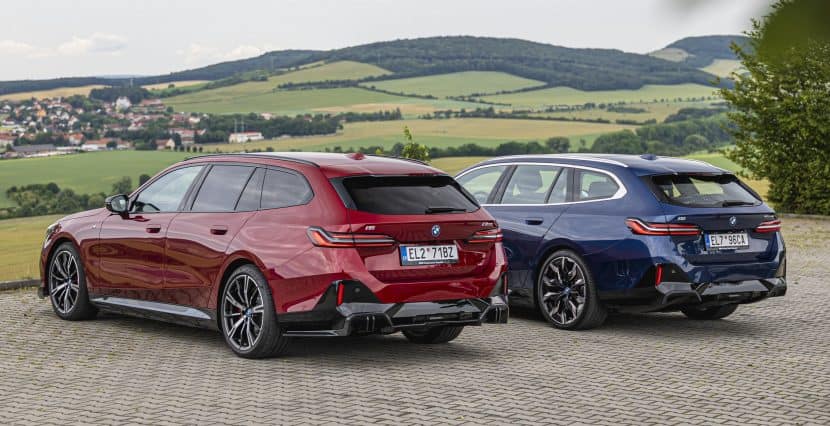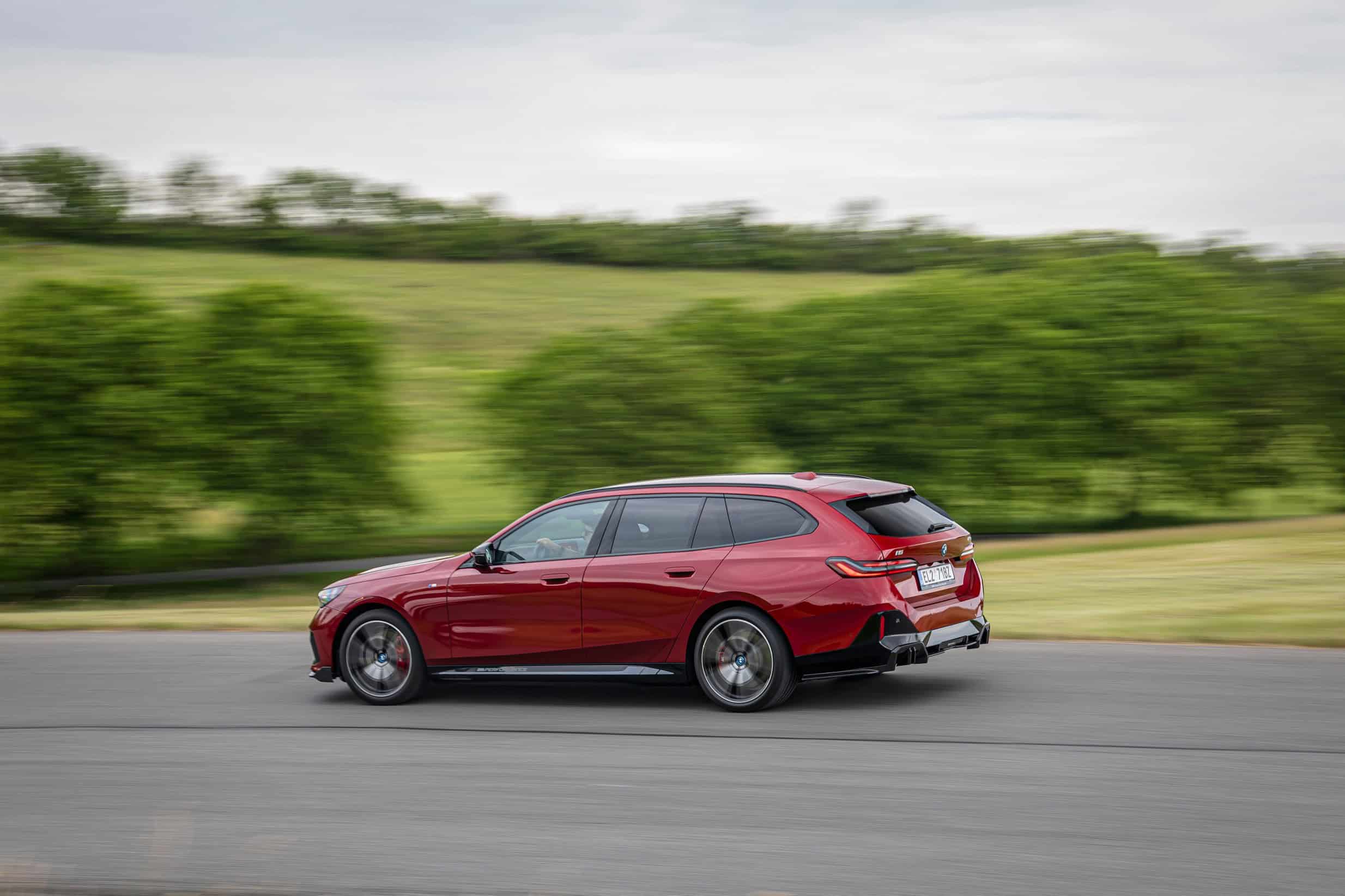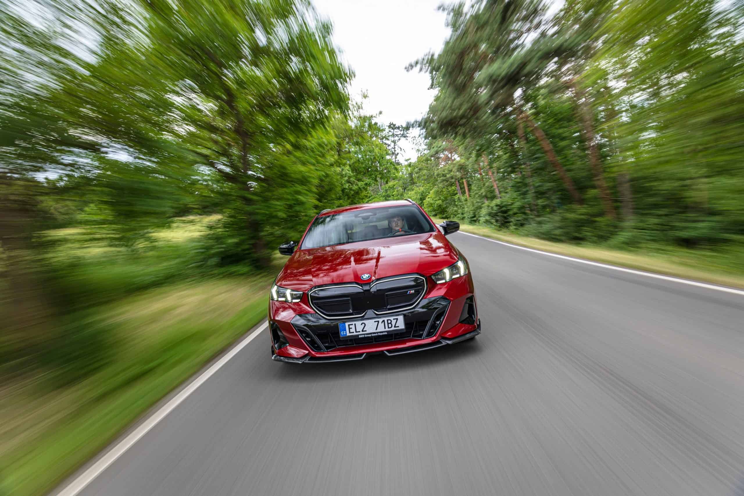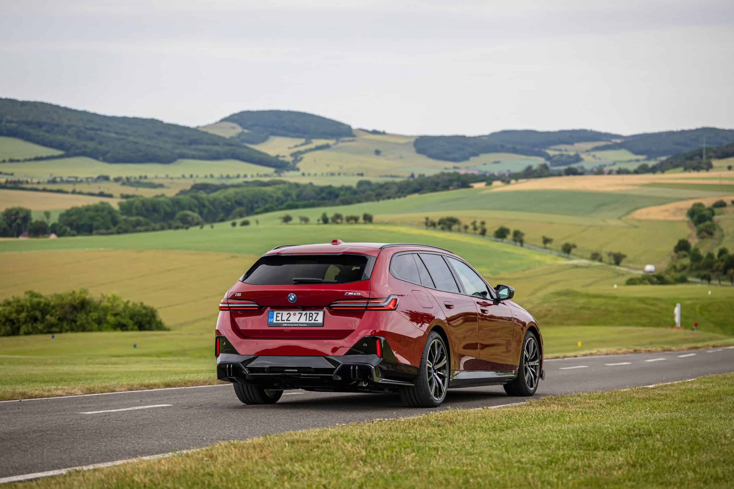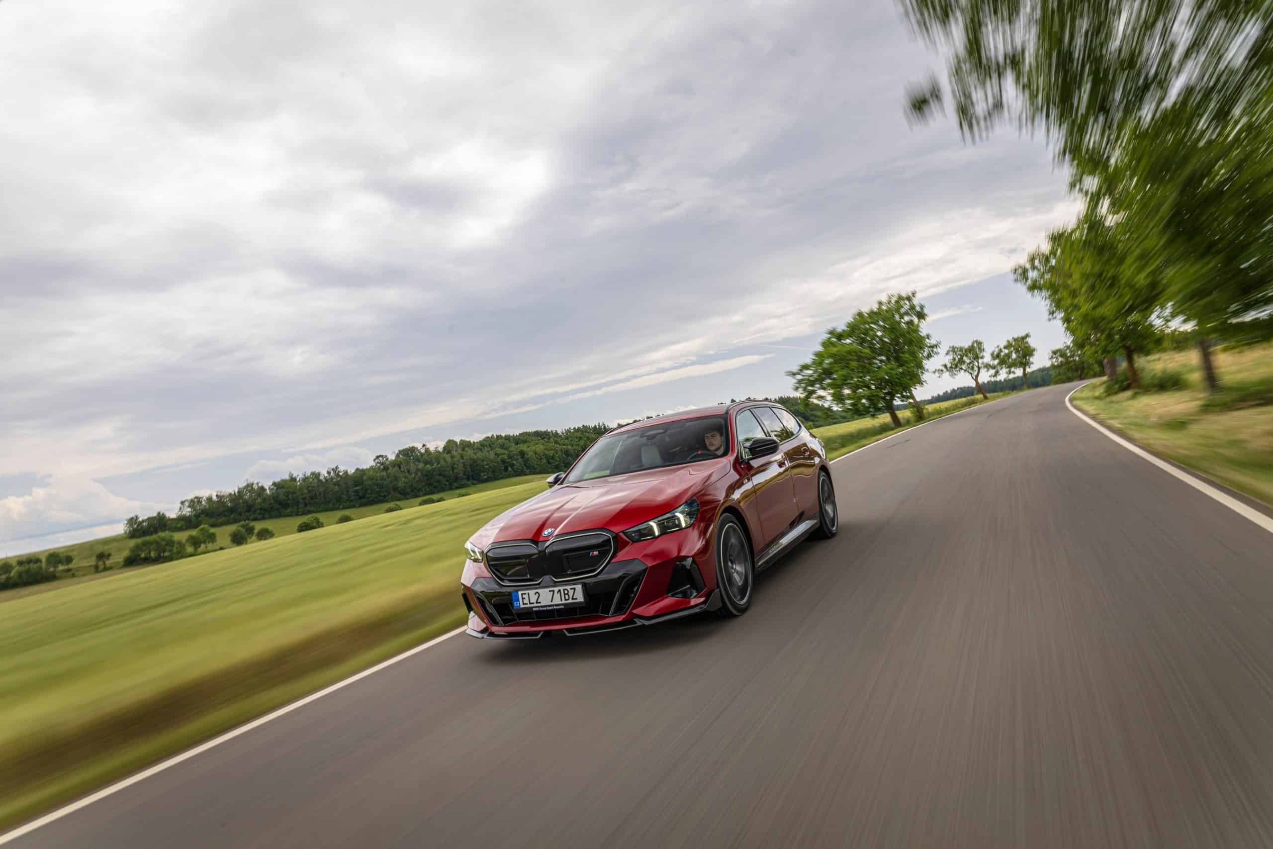 New images from Czechia show the two electric flavors of the G61 together in the countryside. As if the M Performance version wasn’t desirable already, BMW threw in some M Performance Parts. In addition, the i5 M60 painted in Fire Red boasts an Individual interior with Merino leather in Silverstone/Atlas Grey.