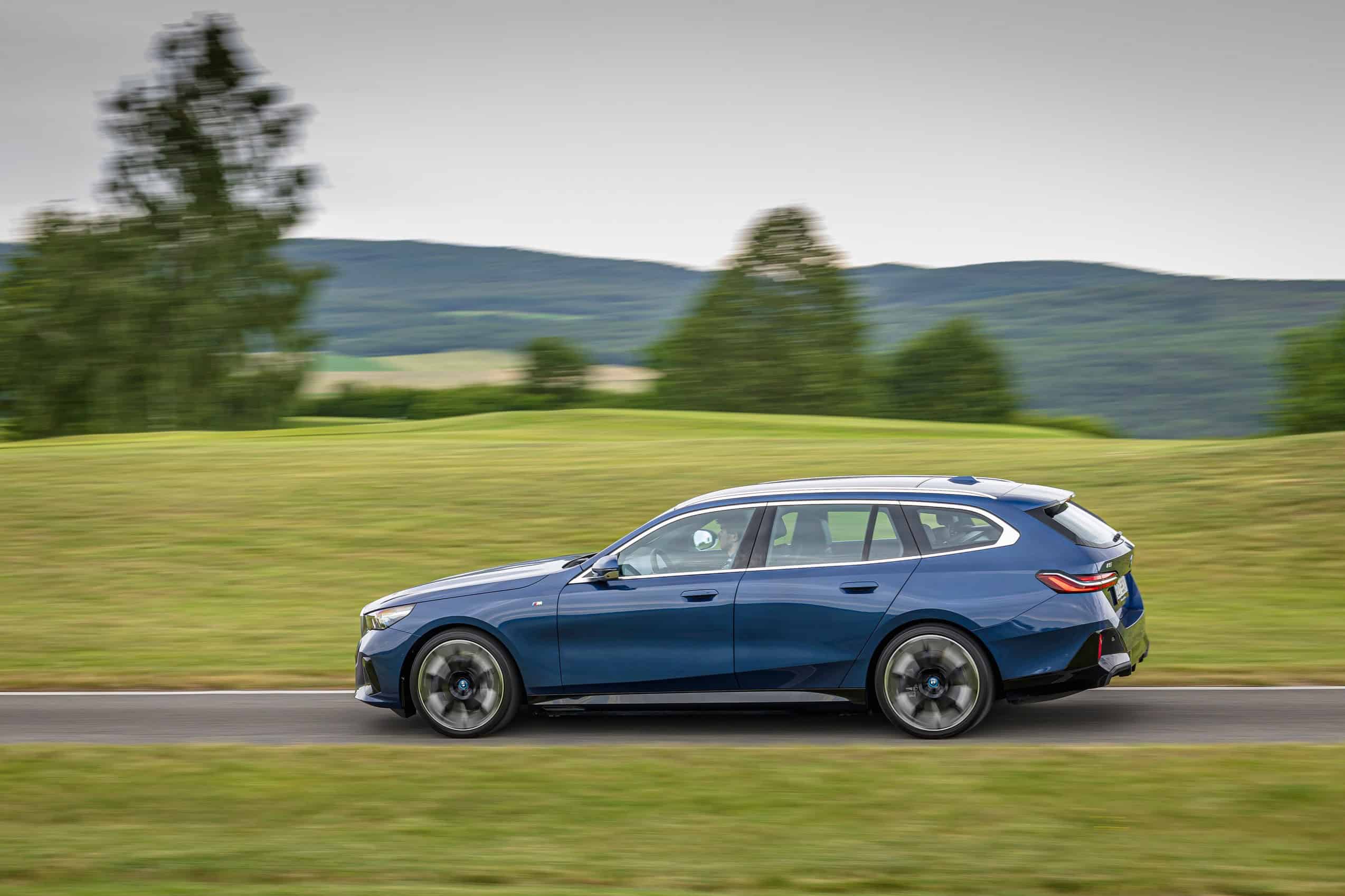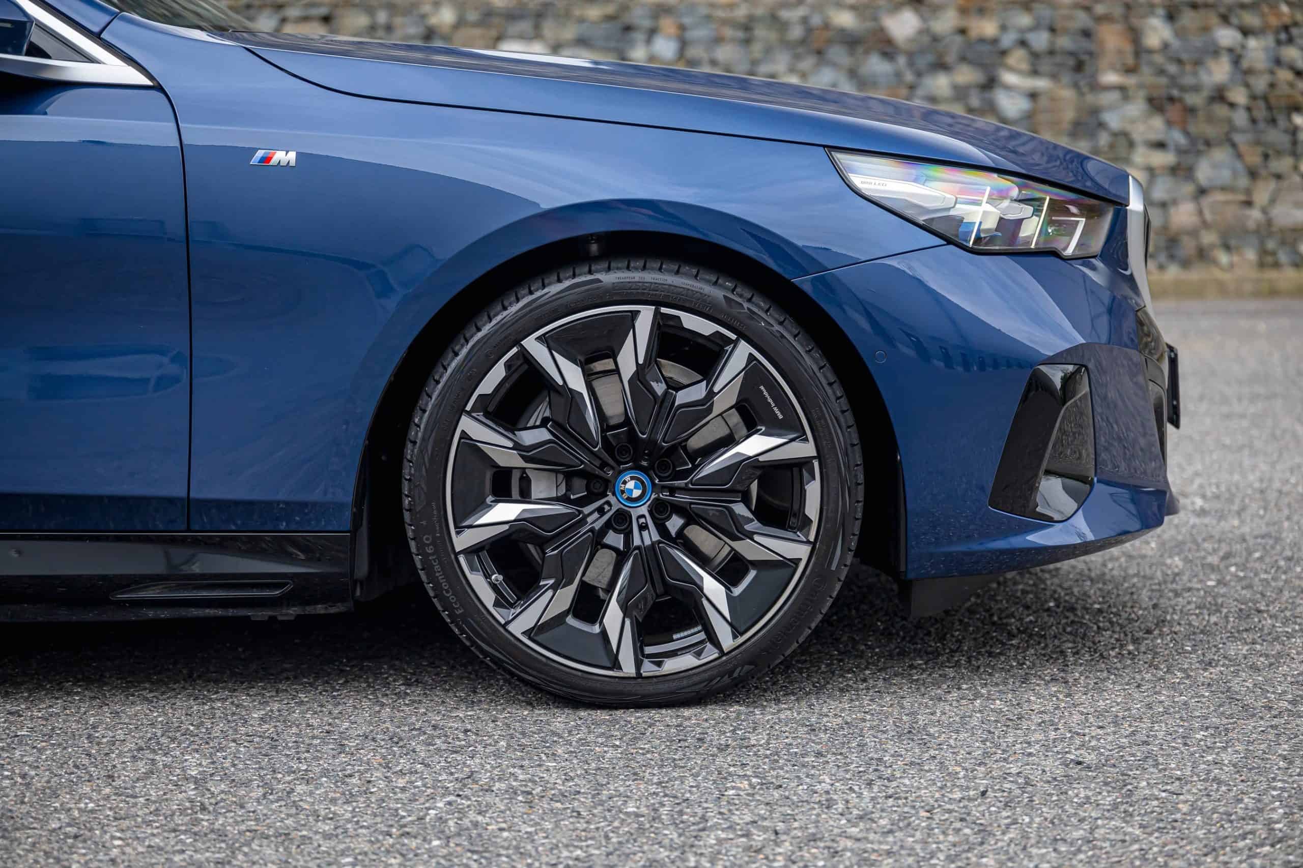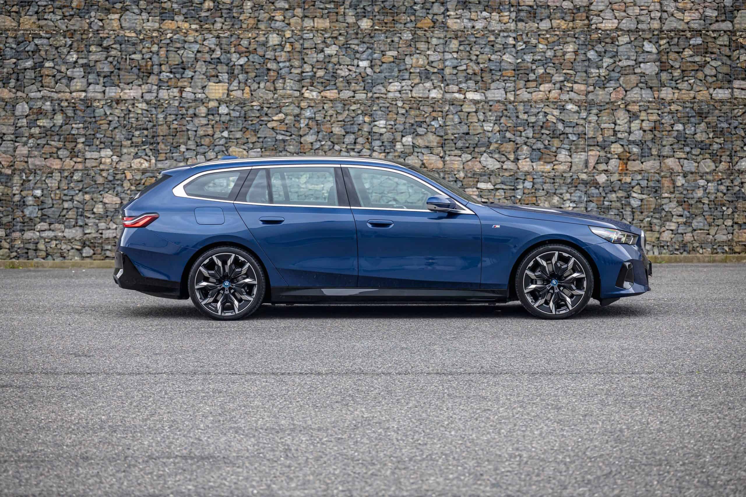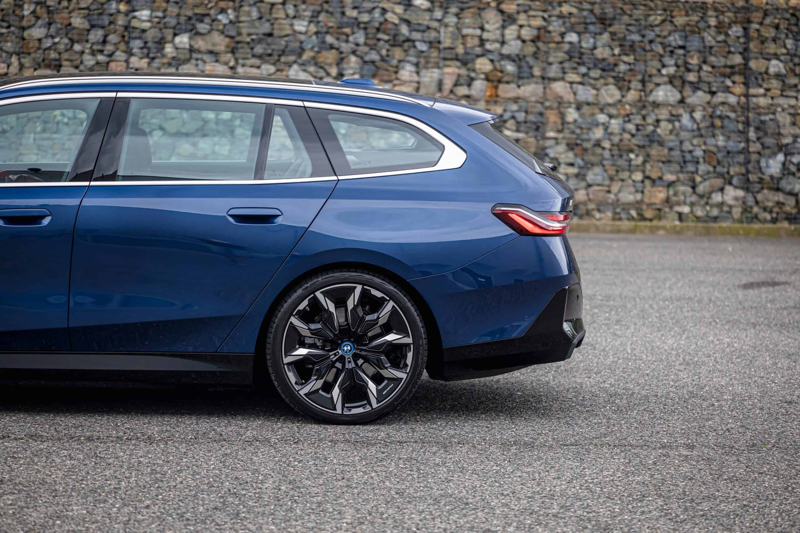 The lesser of the two long-roof i5 models isn’t exactly a base car either. It has the optional M Sport Package and an Individual Tanzanite Blue metallic paint. Its 21-inch wheels (Style 954 I) are actually a size larger than those of the M60. The sporty electric wagon sits on a 20-inch set (Style 938 M), with both featuring a two-tone look.