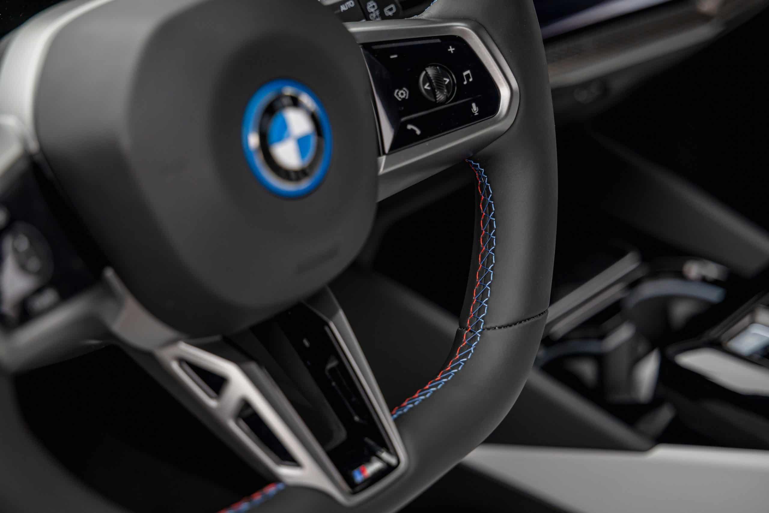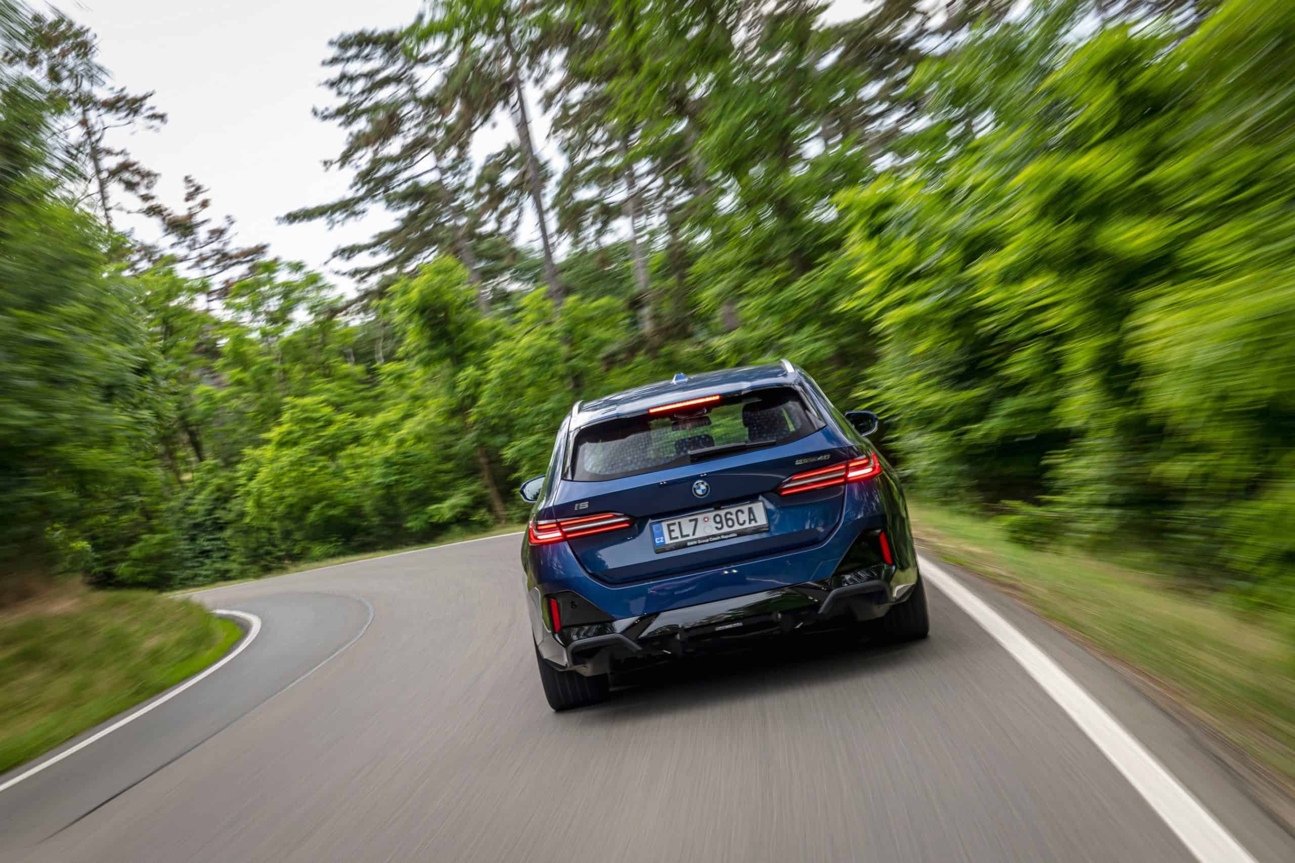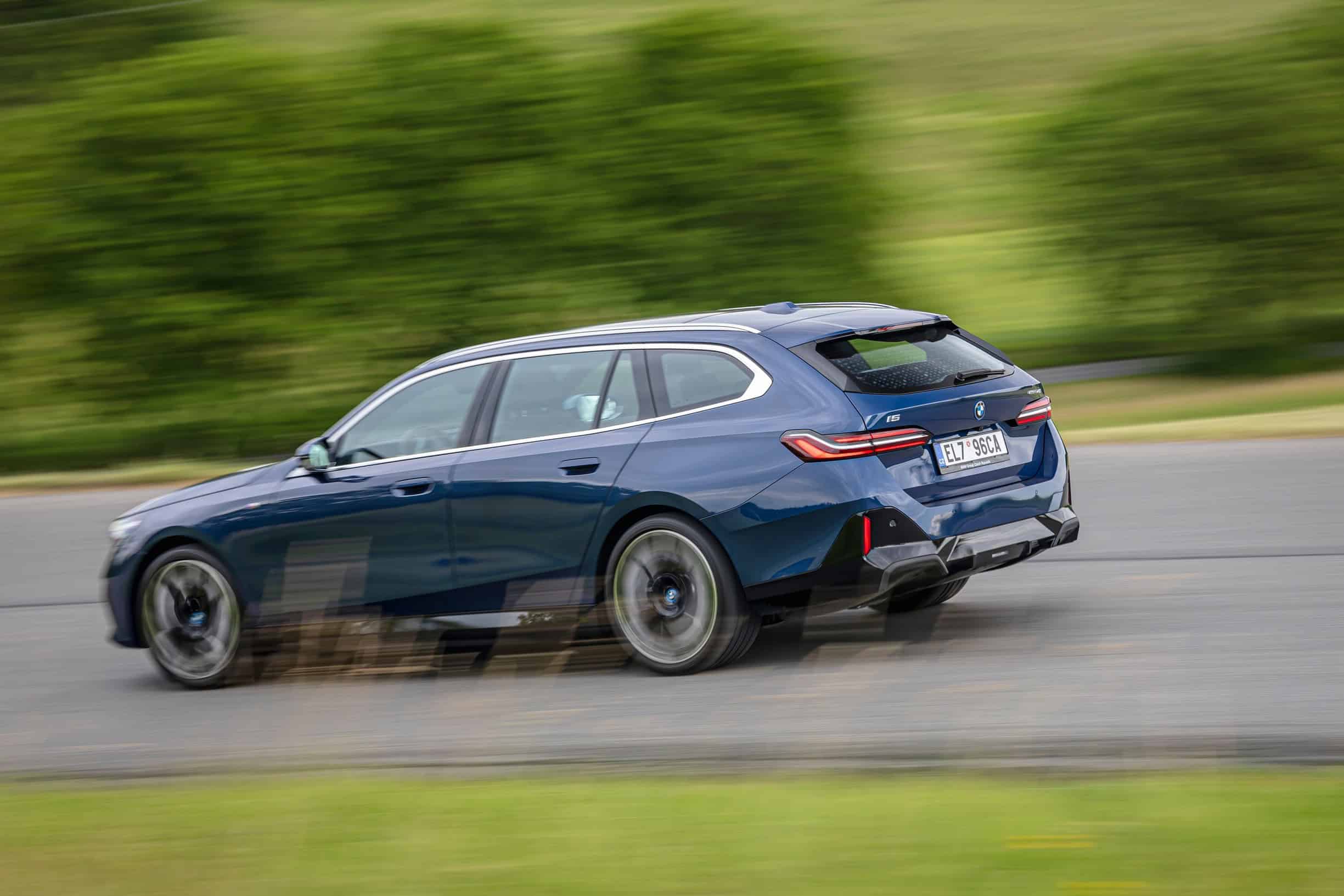 The lesser of the two long-roof i5 models isn’t exactly a base car either. It has the optional M Sport Package and an Individual Tanzanite Blue metallic paint. Its 21-inch wheels (Style 954 I) are actually a size larger than those of the M60. The sporty electric wagon sits on a 20-inch set (Style 938 M), with both featuring a two-tone look.