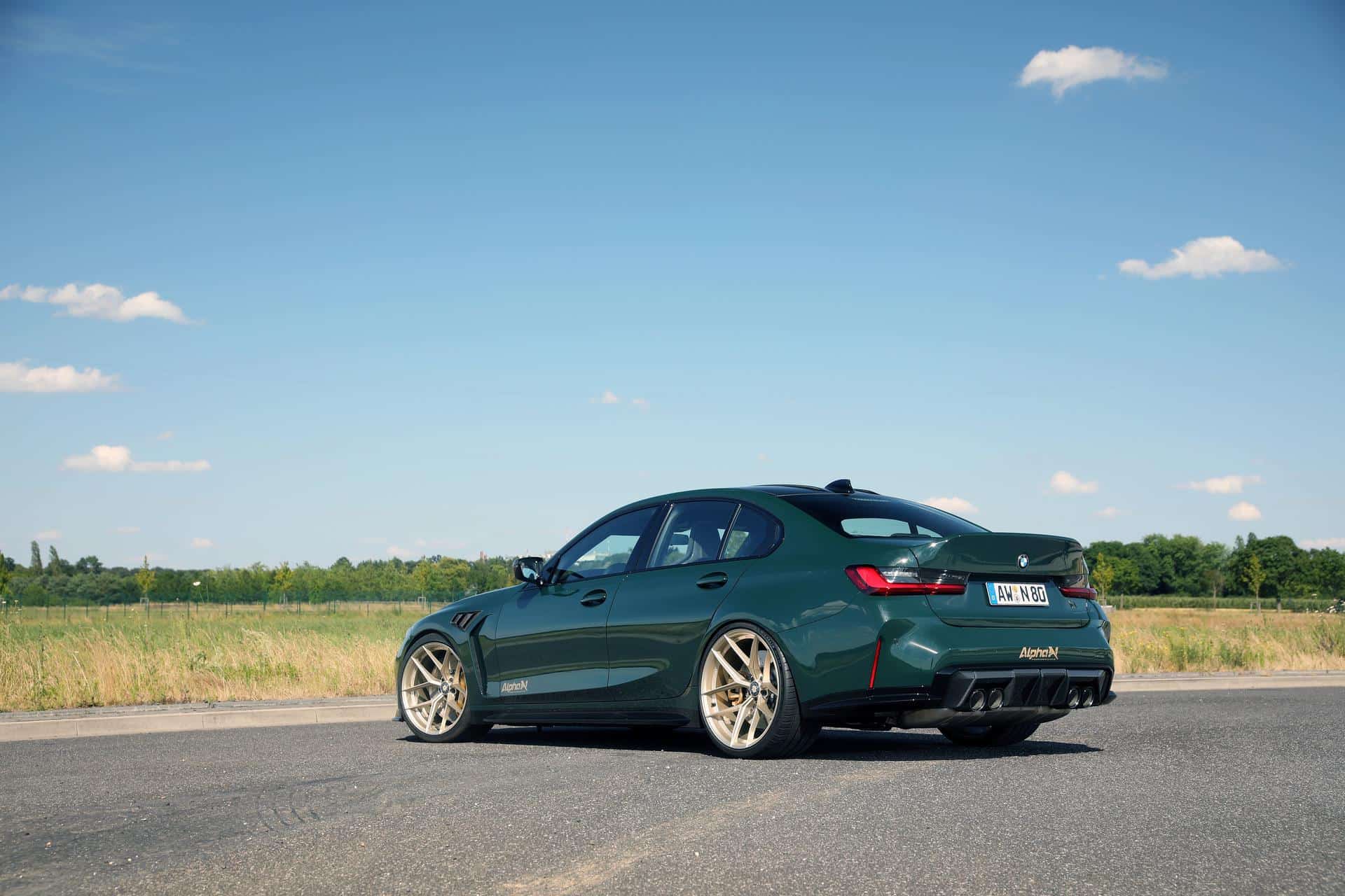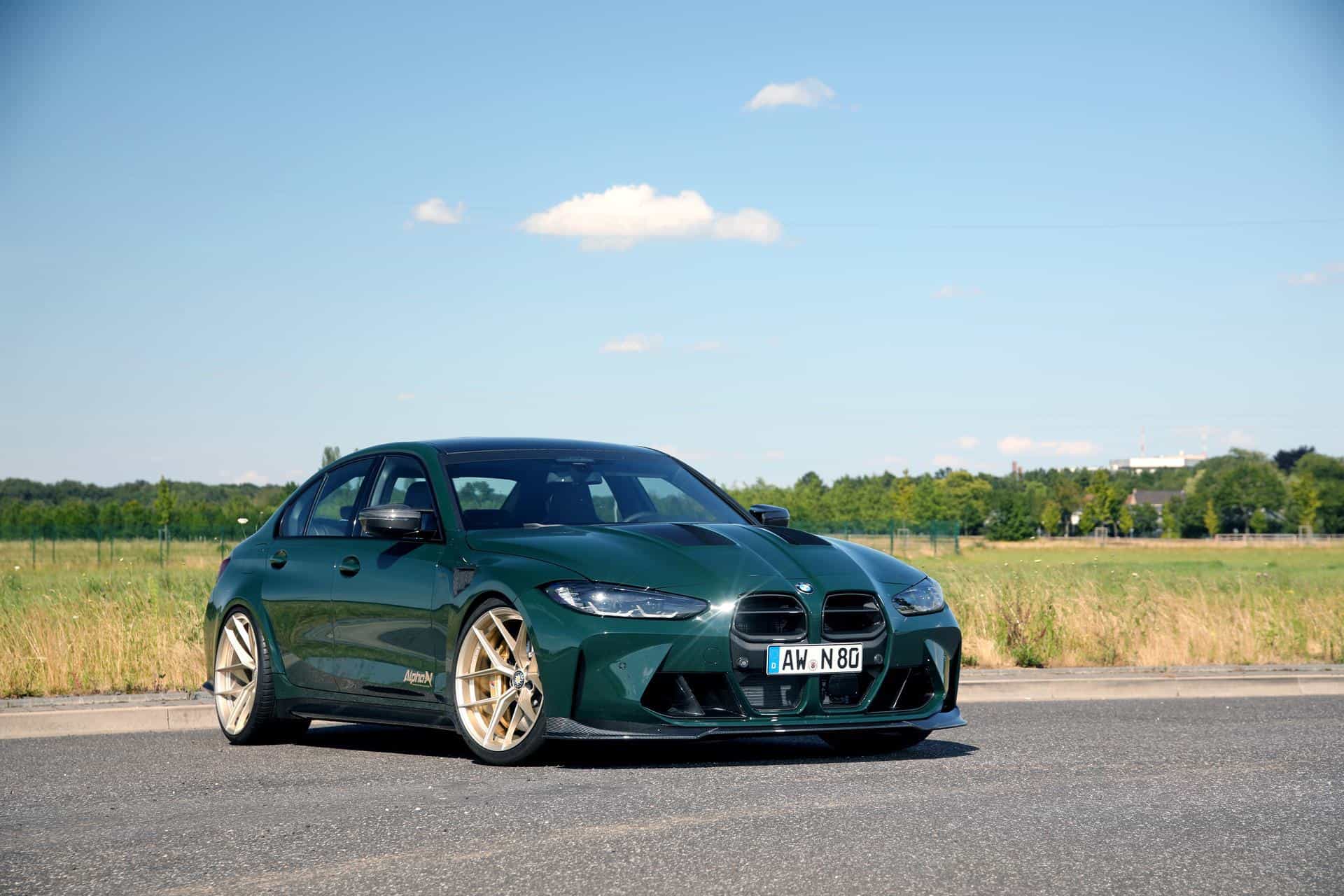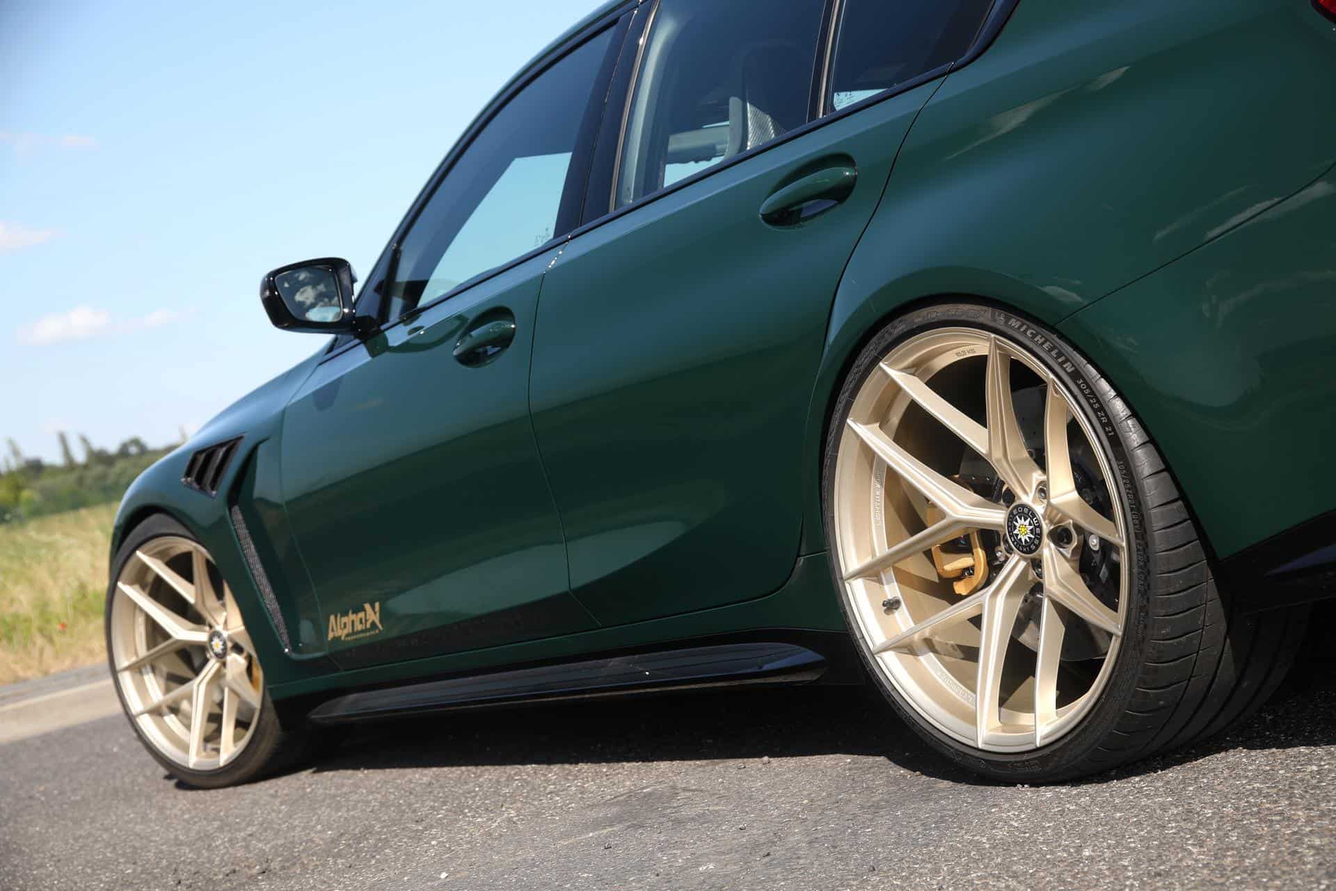 The high-performance sedan’s flared wheel wells house ultra-lightweight LT3 rims from Edelweiss, finished in a custom champagne color that contrasts beautifully with the M3’s British Racing Green paint. The Y-spoke one-piece rims measure 10.5×20″ with 285/30R20 Michelin tires at the front and 11×21″ with 305/25 tires at the rear. Alpha-N Performance, in collaboration with suspension specialists Ă–hlins, has equipped the M3 project vehicle with an Ă–hlins coilover suspension. The Road & Track suspension system offers a perfect blend of comfort for daily driving and exceptional performance on the track.