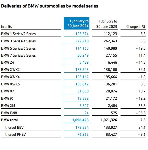 Moving on to the X1 and X2, the compact crossovers were way up in the first half of the year as sales rose by 34.1% to 185,243 units. That’s to be expected since both are new and come in EV flavors as well. The 3 Series/4 Series pair is comfortably the most popular, with demand rising by 3.8% to 272,218 cars. This duo actually bundles lots of cars: 3 Series Sedan, 3 Series Touring, 4 Series Coupe, 4 Series Convertible, 4 Series Gran Coupe, and the i4. The X3 and X4 were slightly down in H1 2024, falling 1.3% to 193,162 crossovers. The former just switched to a new generation, so the minor decline is understandable to a certain degree.
