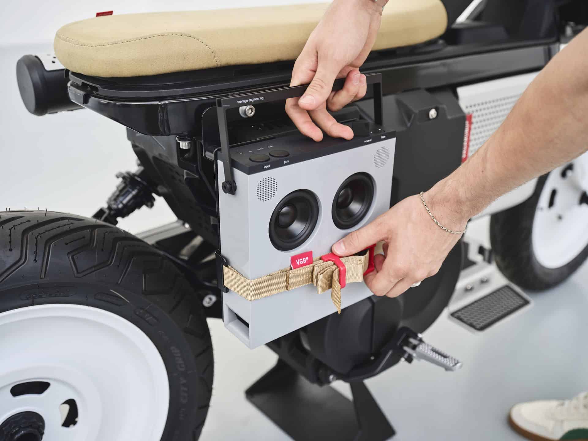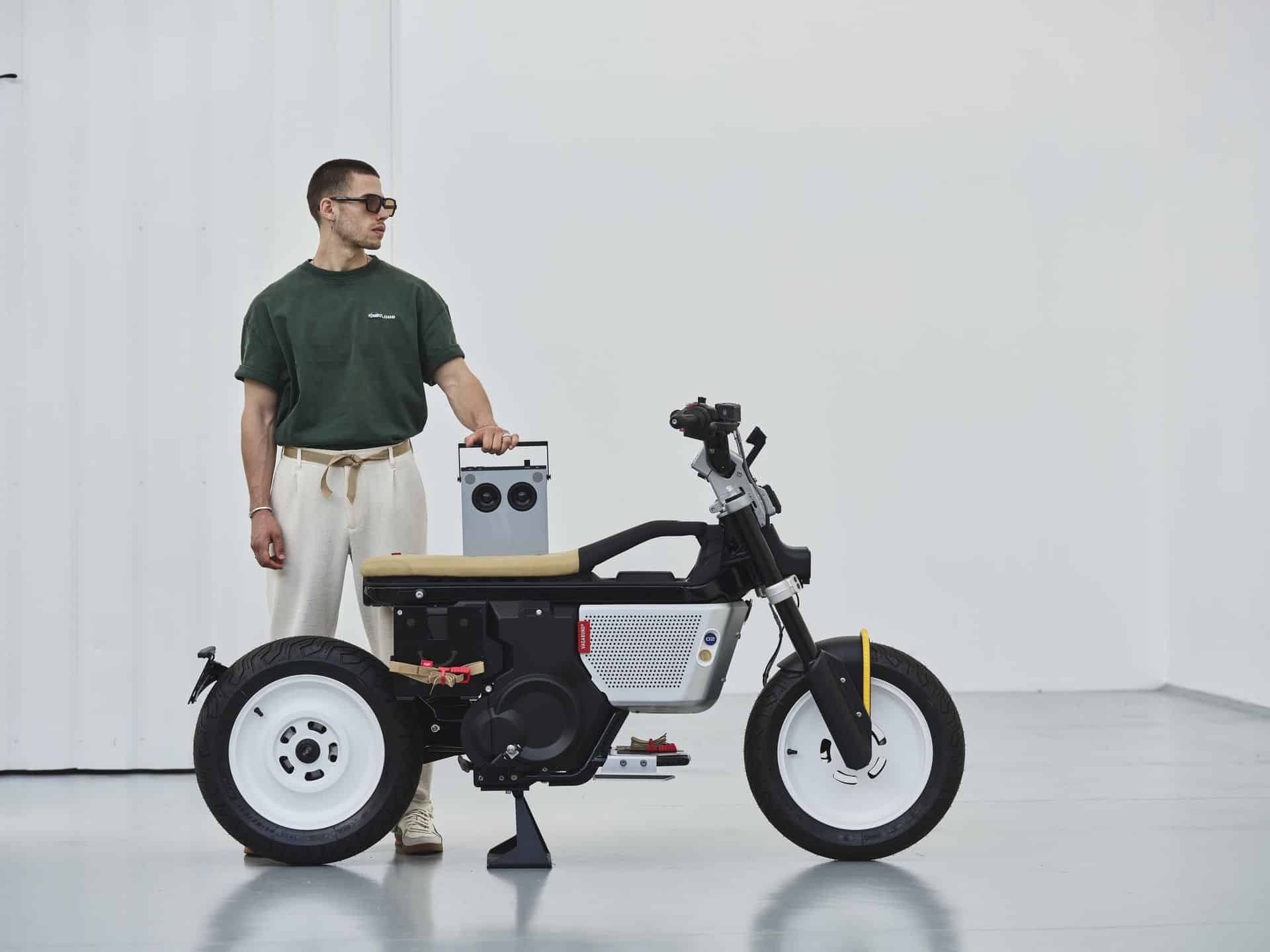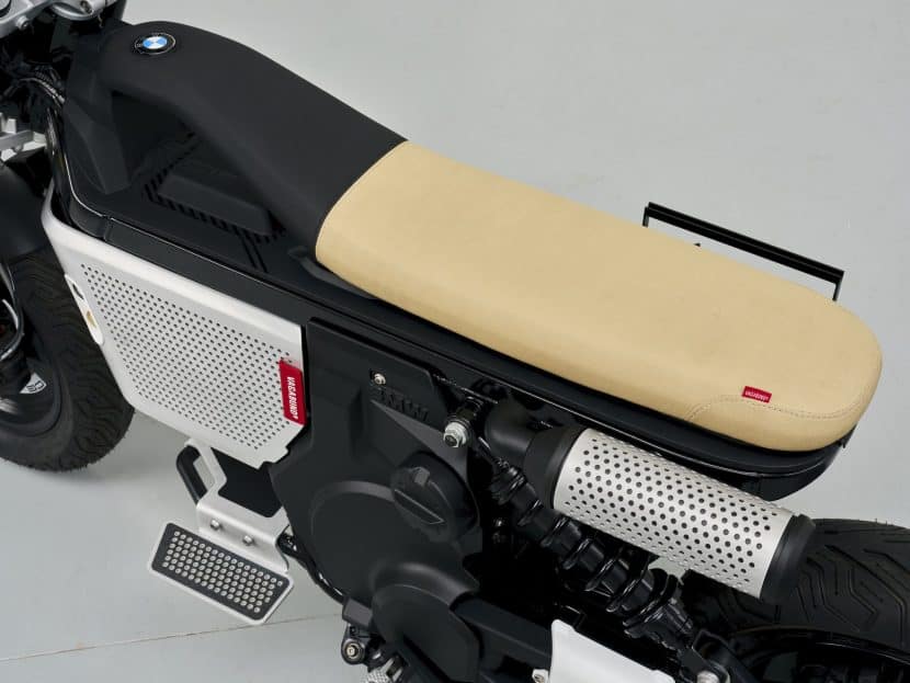 The BMW CE 02 x VAGABUND integrates functional “retro” elements with a fresh, modern twist, targeting a young, dynamic audience. One standout feature is the “OB-4 Magic Radio” from Teenage Engineering, which enhances the bike’s youthful and creative vibe. Additionally, the “electric exhaust” serves as both a practical style element and a visual highlight, cleverly designed to accommodate an umbrella. The design also includes a running board with skateboard grip tape, reflecting the sporty, urban eParkourer style. These thoughtful additions not only enhance the bike’s functionality but also underscore its appeal to urban riders looking for a blend of style and substance.