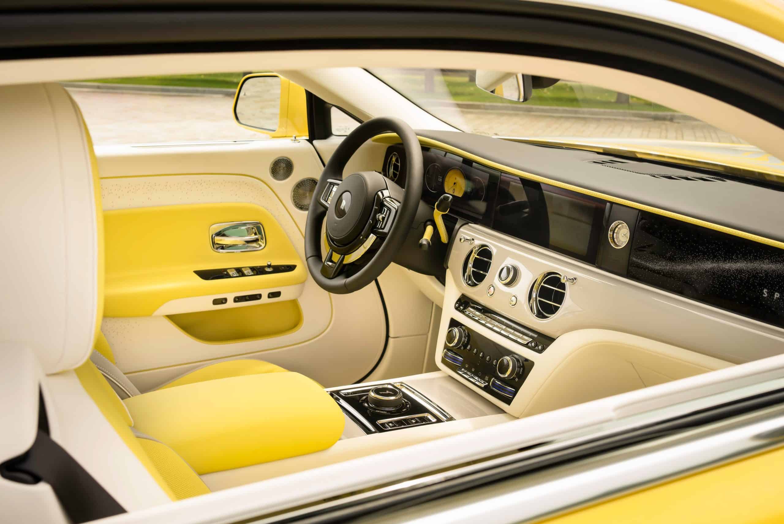 The striking yellow theme continues inside the posh cabin where the ultra-luxury marque opted for a Bespoke Lemon Yellow and Citrine Yellow theme. The typical “Starlight” motif is noticeable on the extra-long doors as well as the instrument panel. An all-yellow interior would’ve been too much, so RR spruced things up with Grace White and Slate Grey surfaces.