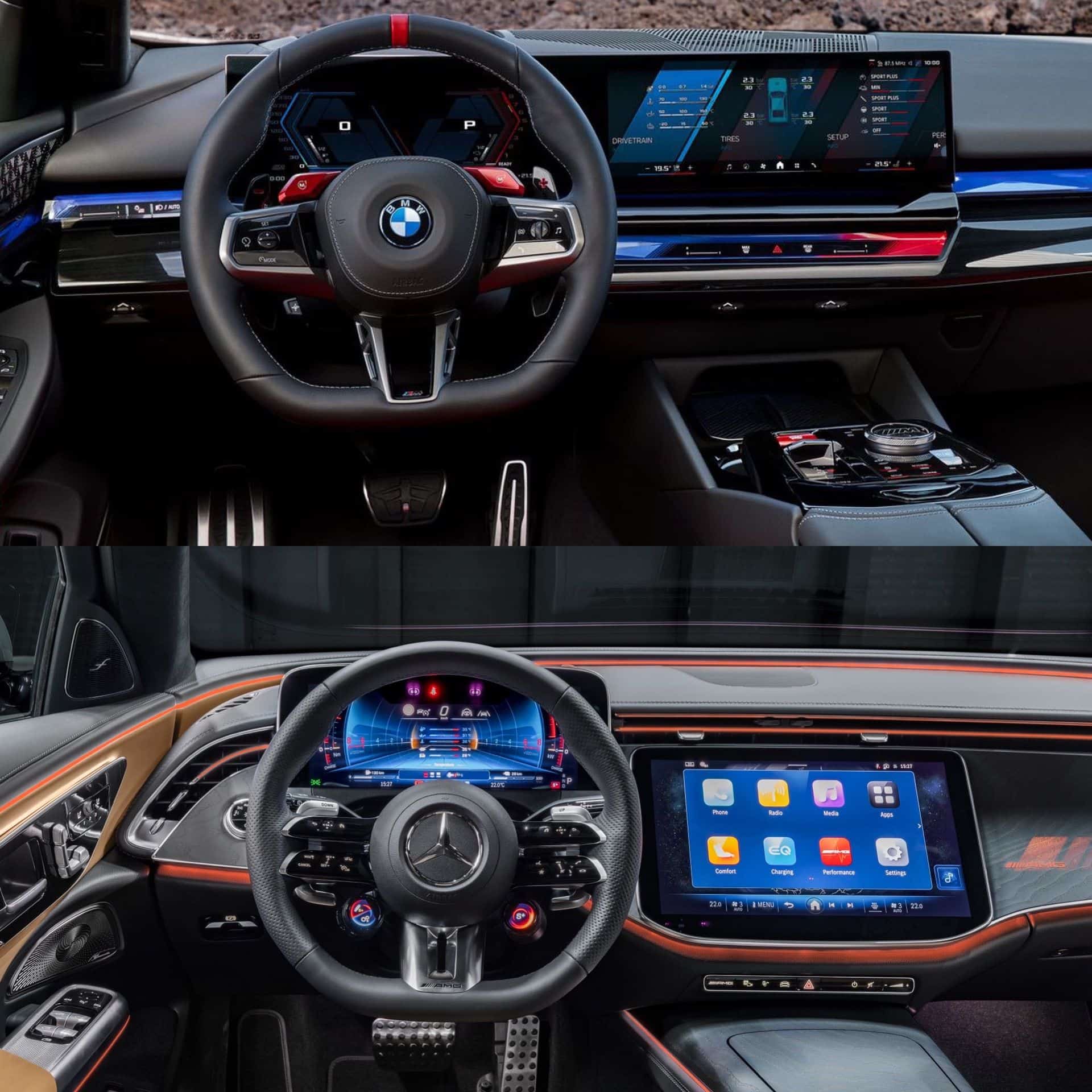 Both interiors are busy but not cluttered. The M5 feels a lot more like a cockpit, while the E53 Estate feels more upscale. The screens are also integrated a little more naturally in the Merc. That lends it a bit more of a cohesive feel.