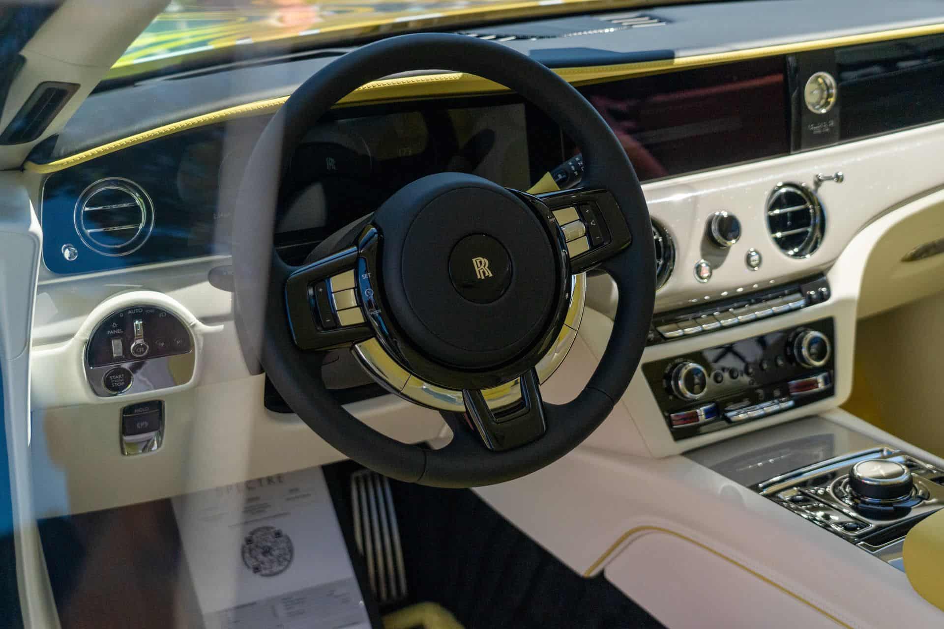 While Semaphore borrows its name entirely from the paint it dons, the true exterior highlight comes from the spilled paint on the hood. Which, we get a pretty good look at. Named Marbled Paint Spill, the graphic is a reference to California, though it isn’t immediately apparent how. That’s modern art for you. The design was painstakingly applied, and Rolls-Royce says the hood alone took over 160 hours from genesis to completion.